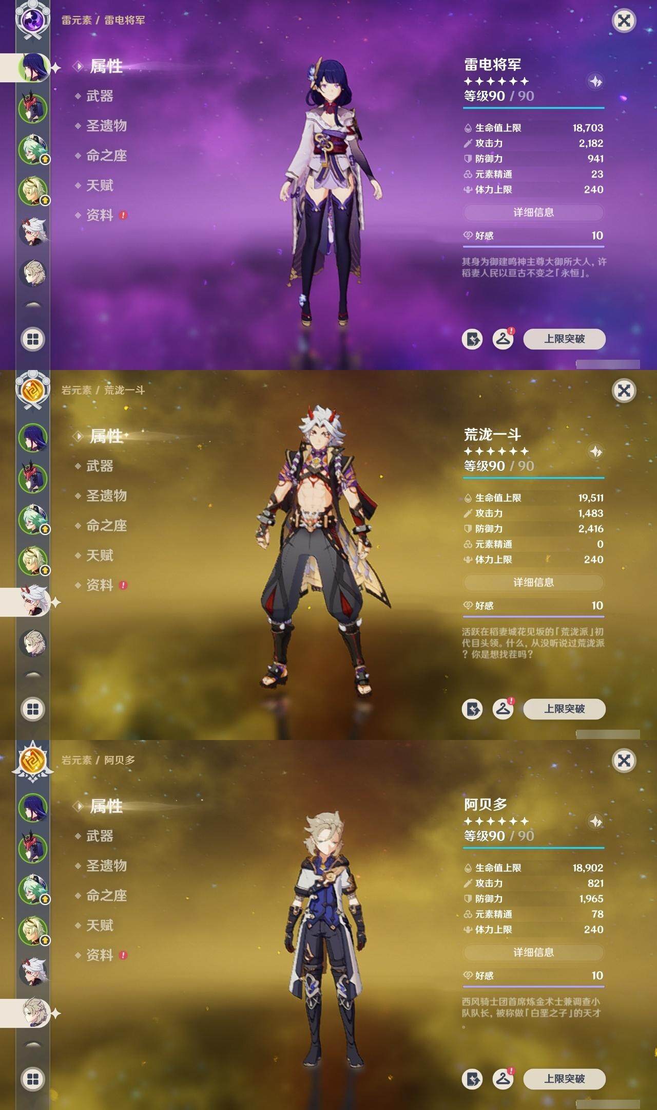 雷电将军,荒泷一斗,阿贝多,神里凌华,八重神子,珊瑚宫心海,胡桃,琴,七七,莫娜