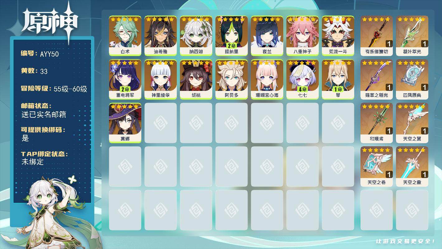 [15334210]60级/33黄/女主/15个五星角色/9个五星武器 0命白术,0命迪希雅,0命纳西妲,2命提纳里,0命夜兰,0命八重神子,0命荒泷一斗,2命雷电将军,0命神里绫华,0命胡桃,0命阿贝多,0命珊瑚宫心海,4命七七,1命琴,0命莫娜,精1有乐御簾切,精1裁叶萃光,精1薙草之稻光,精1四风原典,精1和璞鸢,精1天空之翼,精1天空之卷,精1天空之傲