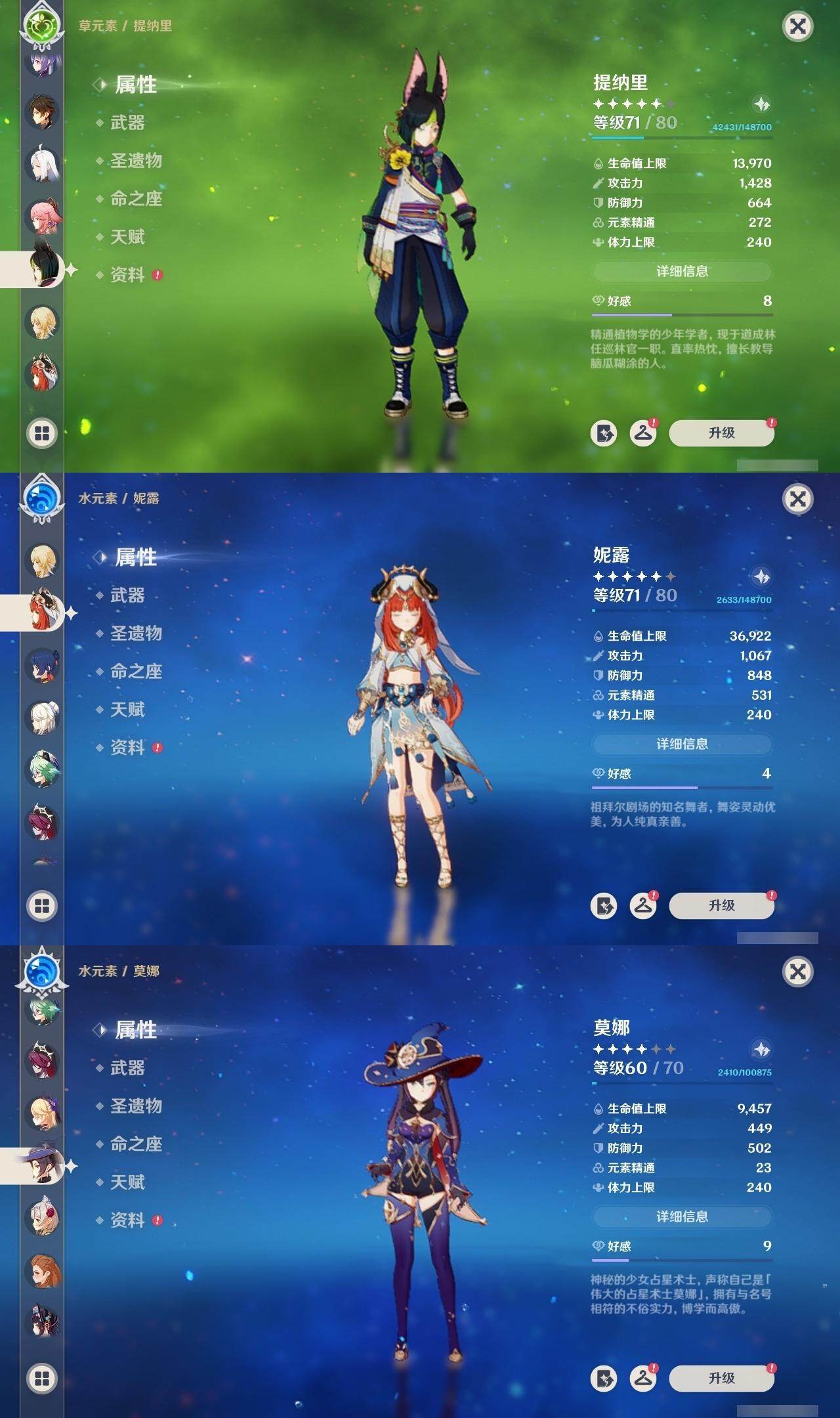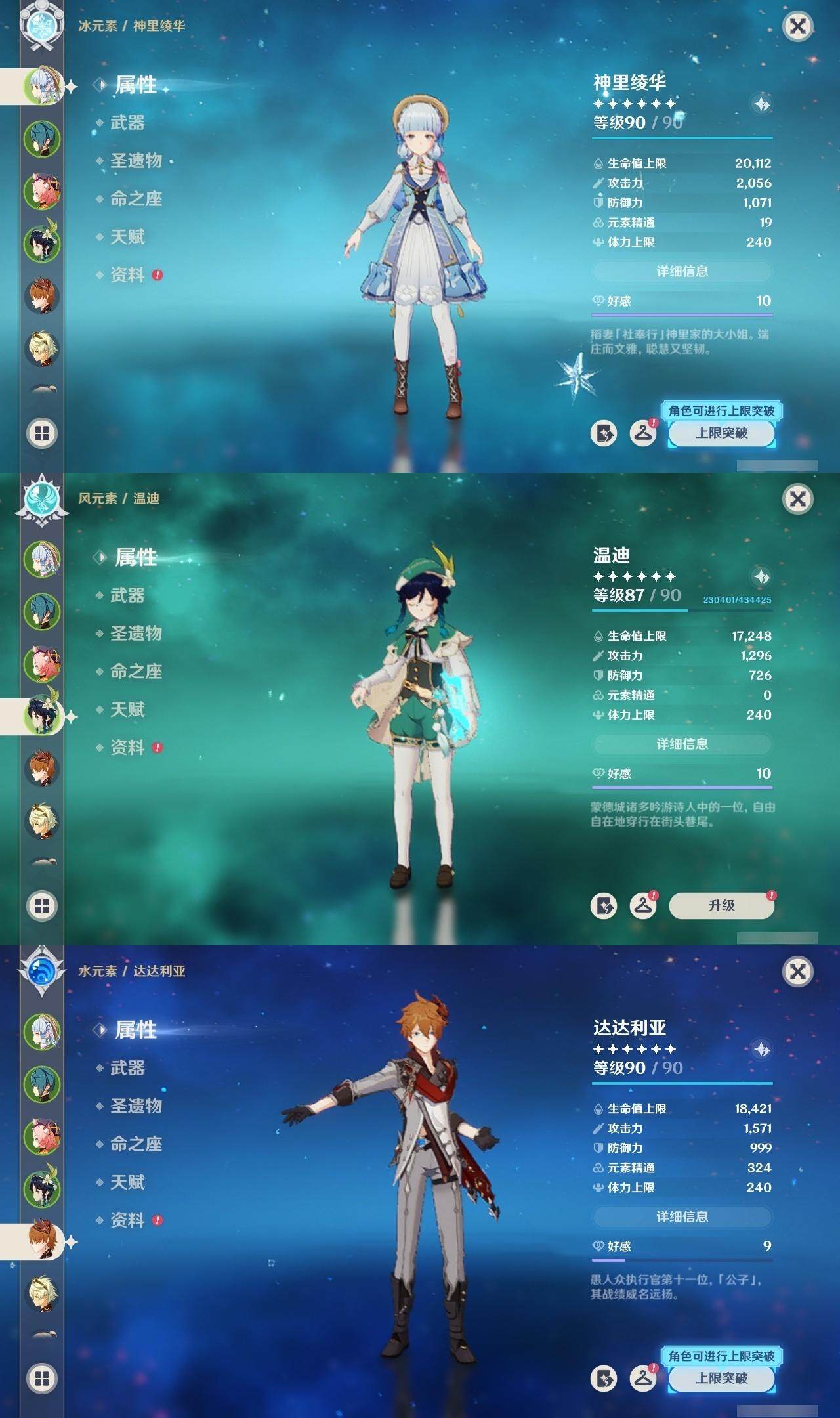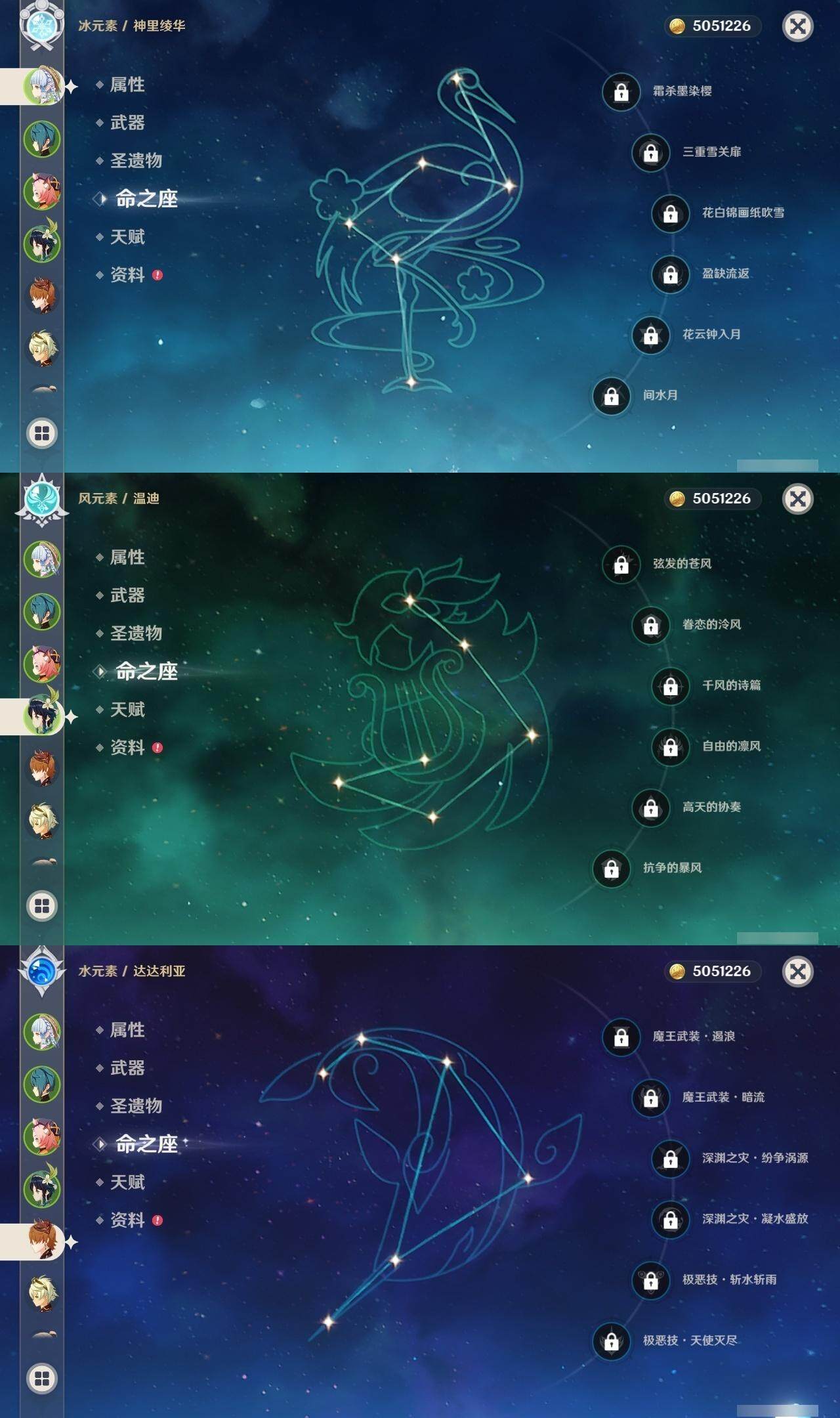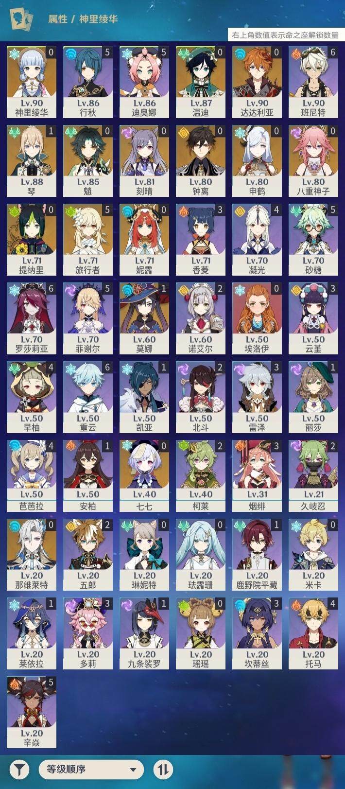 0命那维莱特,0命妮露,0命提纳里,0命八重神子,0命申鹤,0命神里绫华,0命钟离,0命魈,0命温迪,0命达达利亚,0命刻晴,0命七七,1命琴,1命莫娜,精1磐岩结绿,精1和璞鸢,精1天空之脊,精1天空之刃,精1风鹰剑