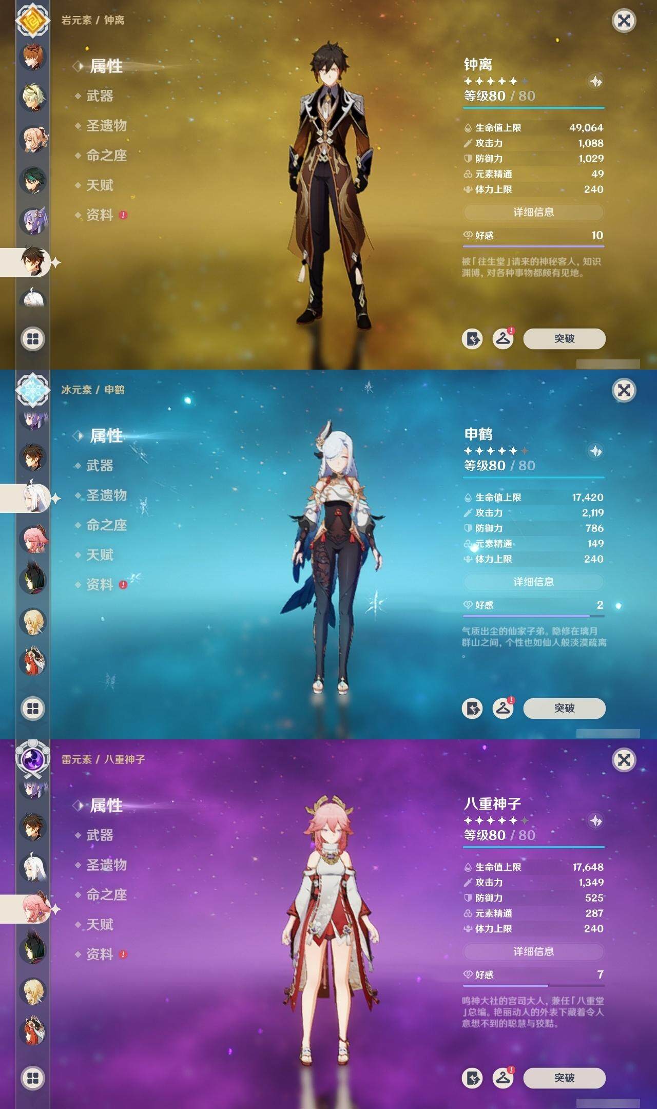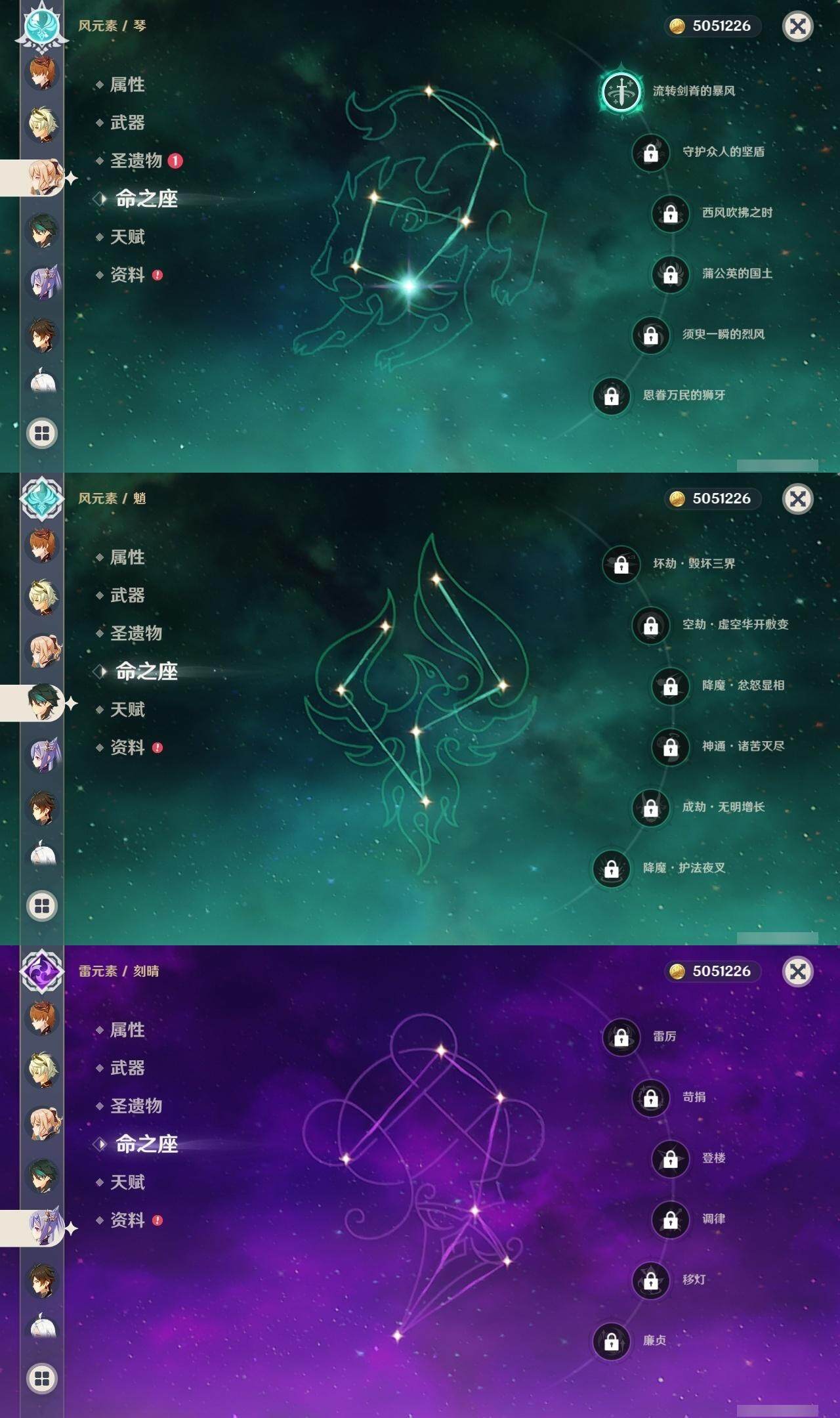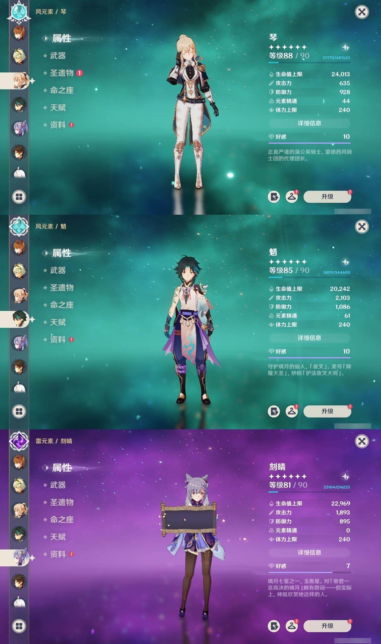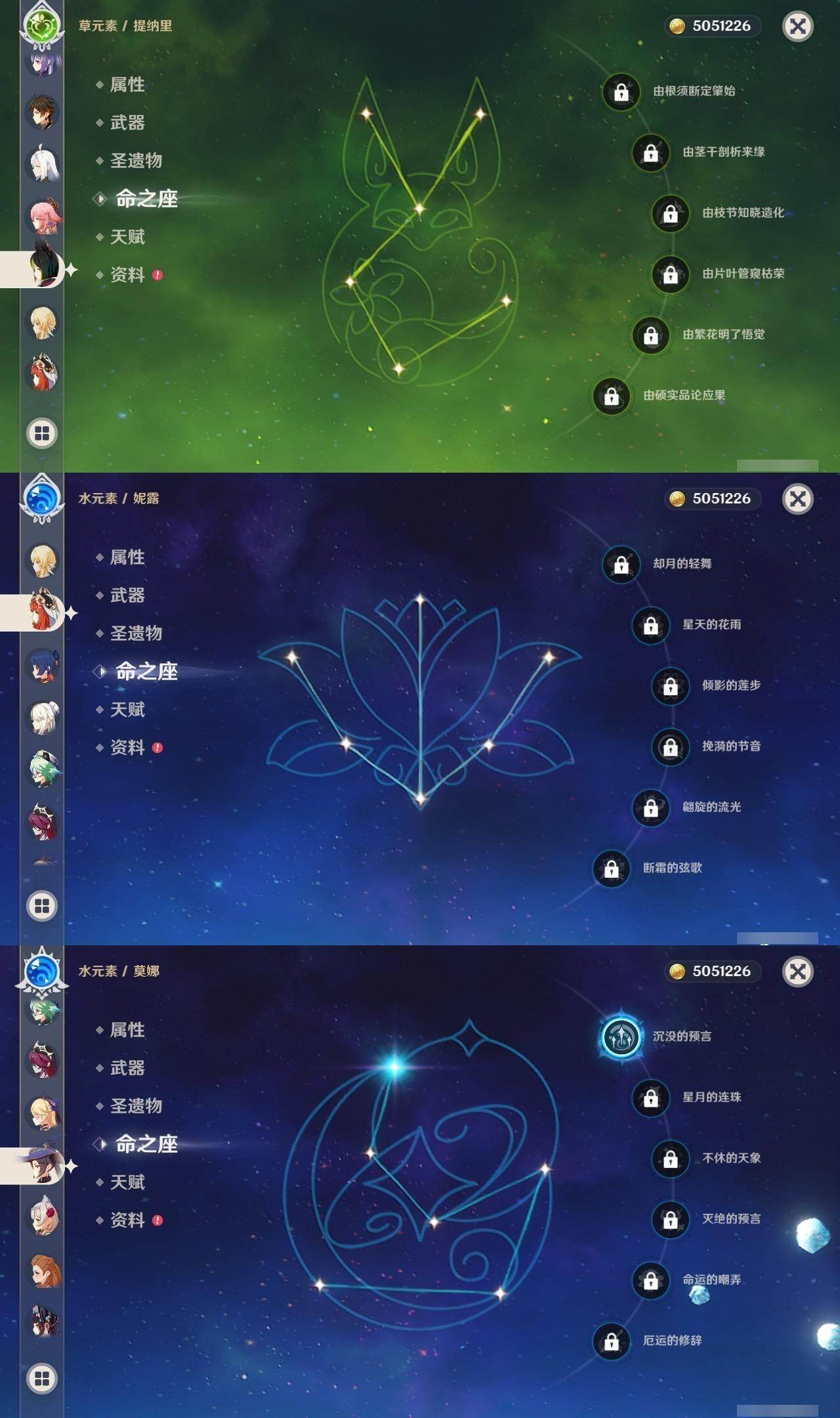 0命那维莱特,0命妮露,0命提纳里,0命八重神子,0命申鹤,0命神里绫华,0命钟离,0命魈,0命温迪,0命达达利亚,0命刻晴,0命七七,1命琴,1命莫娜,精1磐岩结绿,精1和璞鸢,精1天空之脊,精1天空之刃,精1风鹰剑