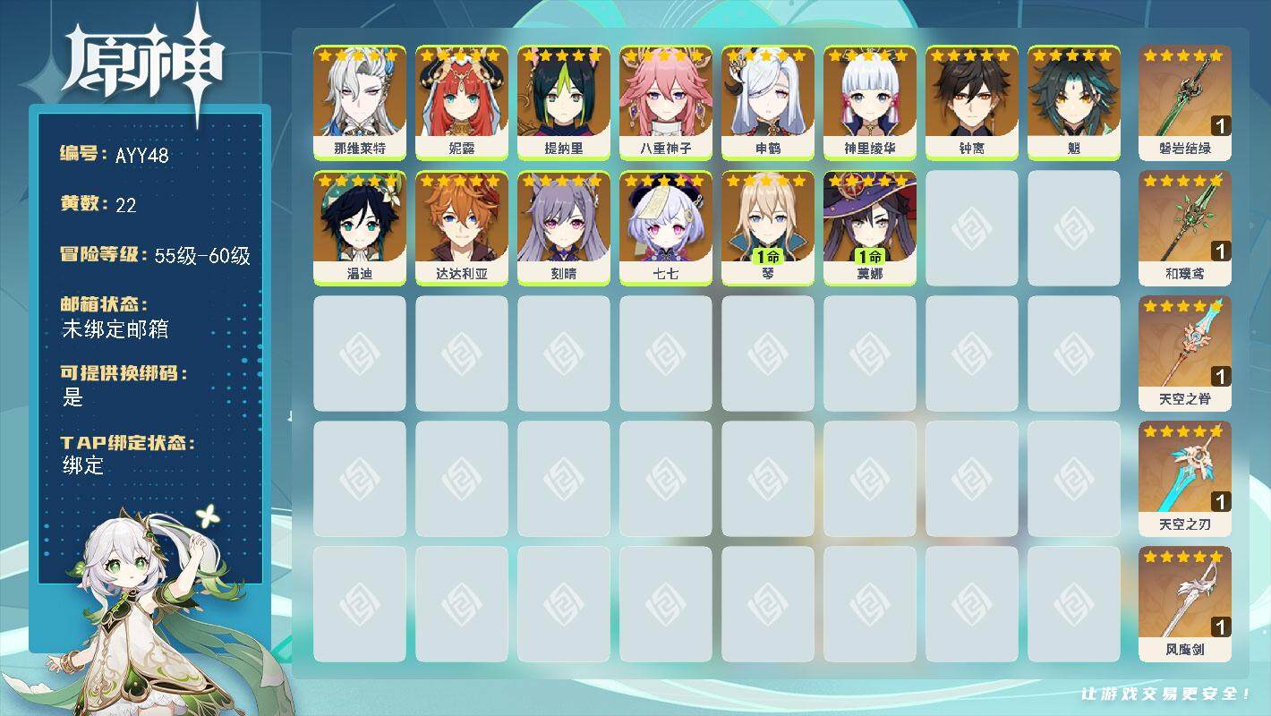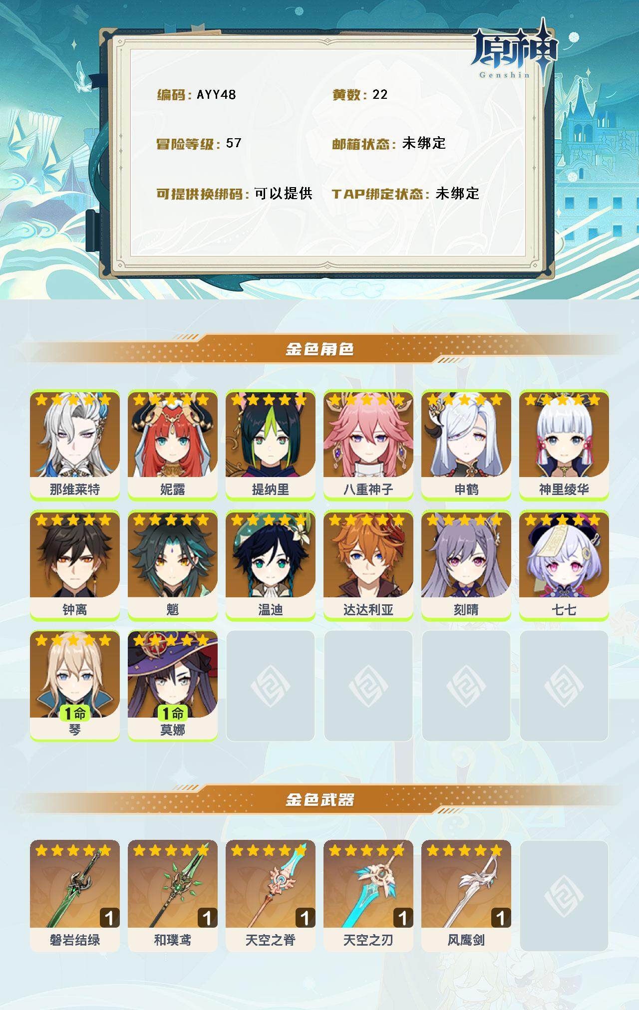 [15334254]57级/22黄/女主/14个五星角色/6个五星武器 0命那维莱特,0命妮露,0命提纳里,0命八重神子,0命申鹤,0命神里绫华,0命钟离,0命魈,0命温迪,0命达达利亚,0命刻晴,0命七七,1命琴,1命莫娜,精1磐岩结绿,精1和璞鸢,精1天空之脊,精1天空之刃,精1风鹰剑