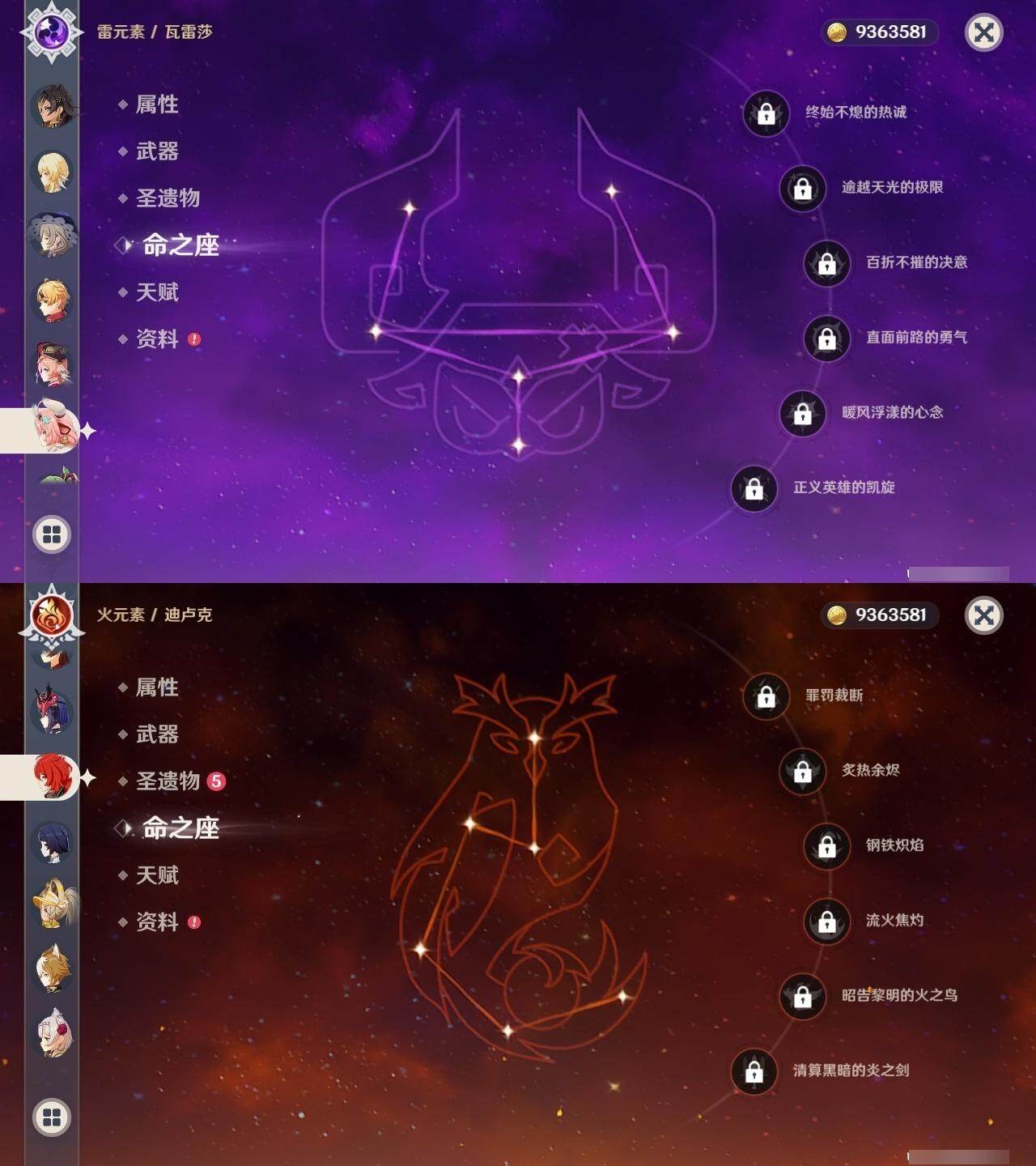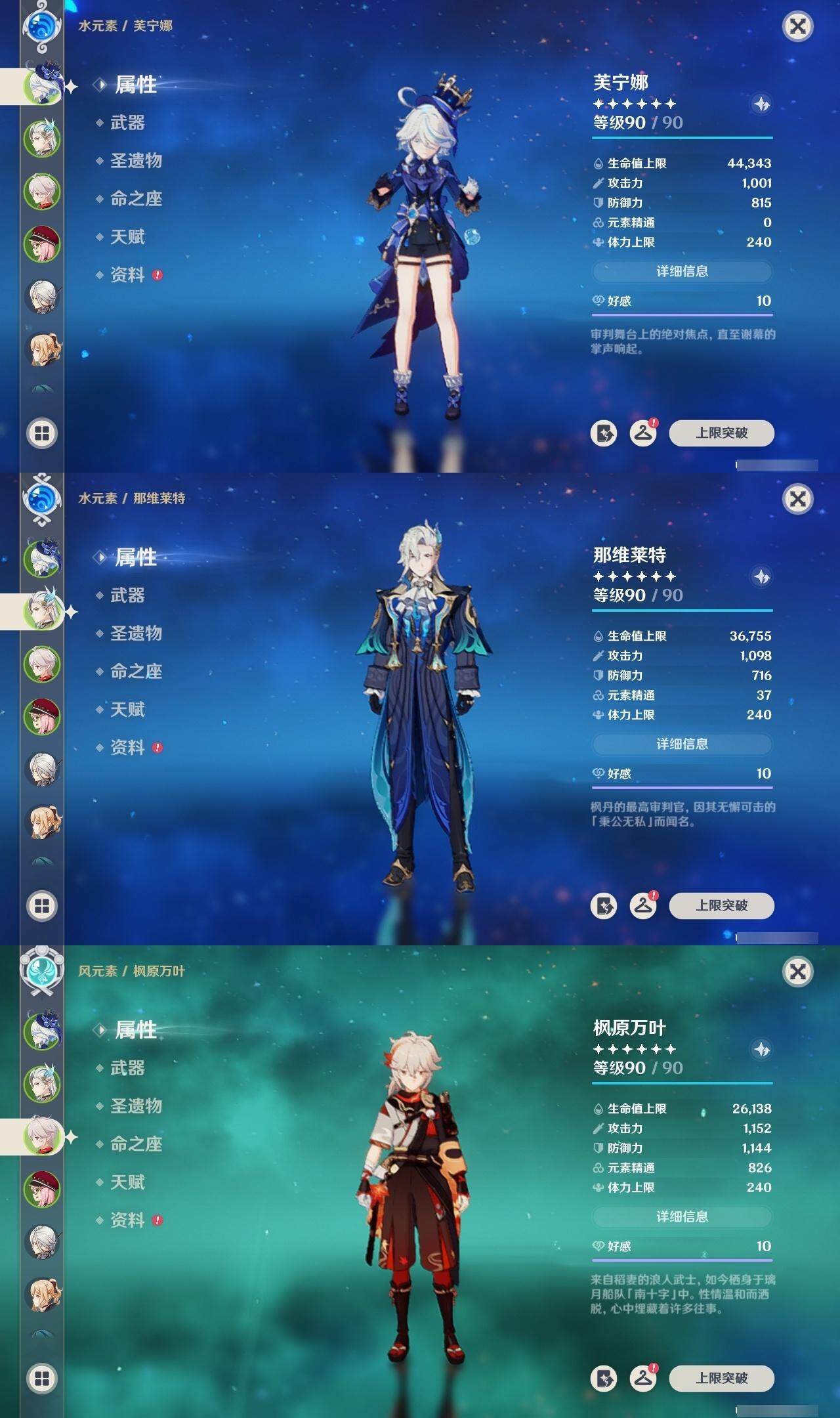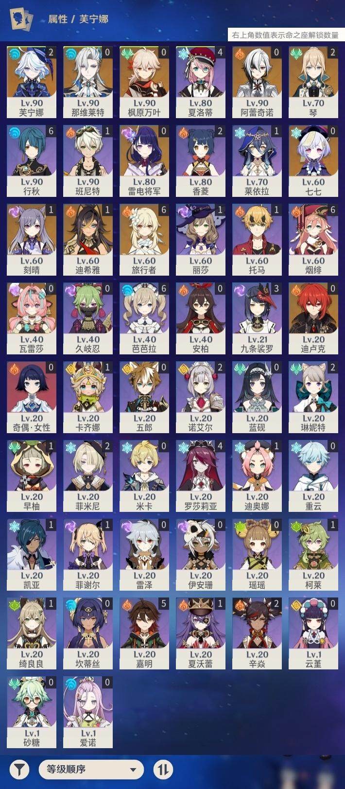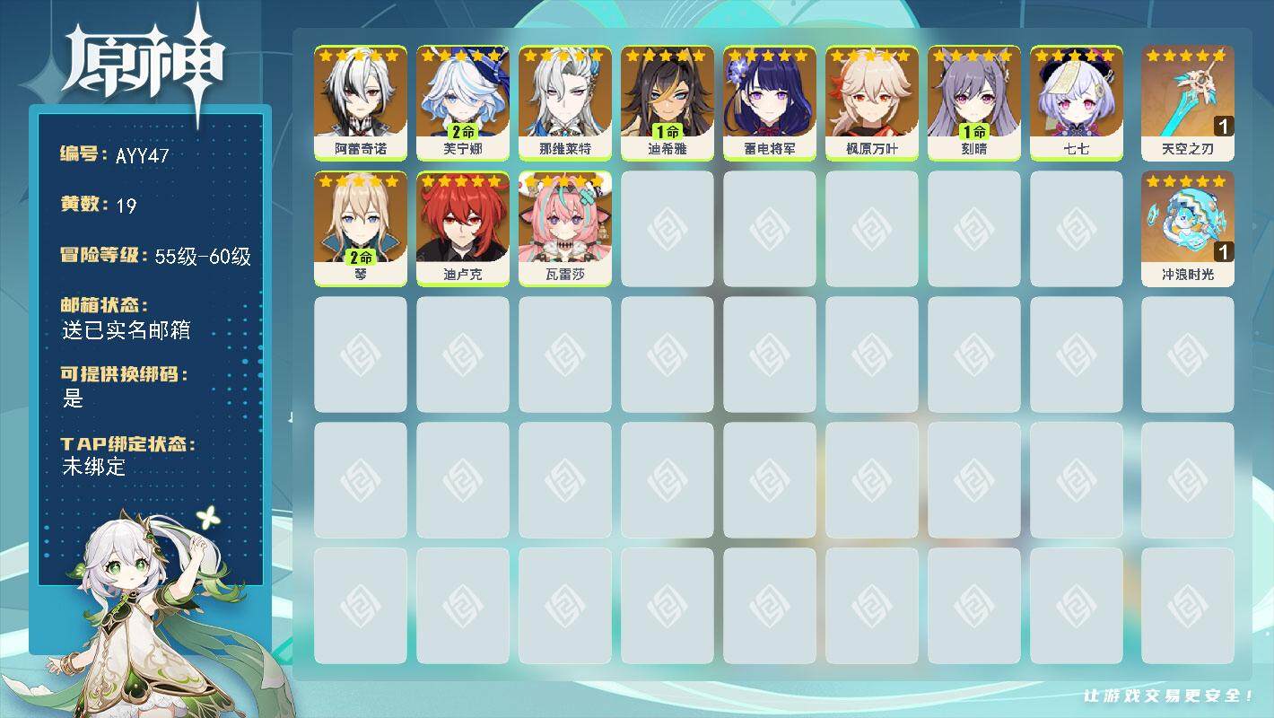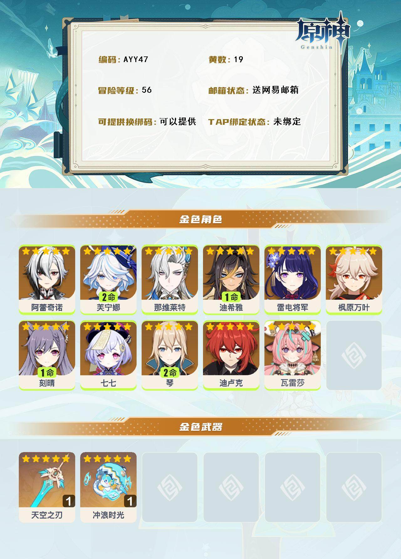 [15334278]56级/19黄/女主/11个五星角色/2个五星武器 0命阿蕾奇诺,2命芙宁娜,0命那维莱特,1命迪希雅,0命雷电将军,0命枫原万叶,1命刻晴,0命七七,2命琴,0命迪卢克,0命瓦雷莎,精1天空之刃,精1冲浪时光