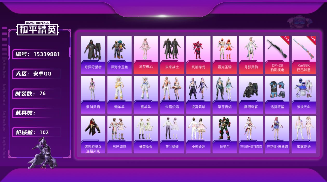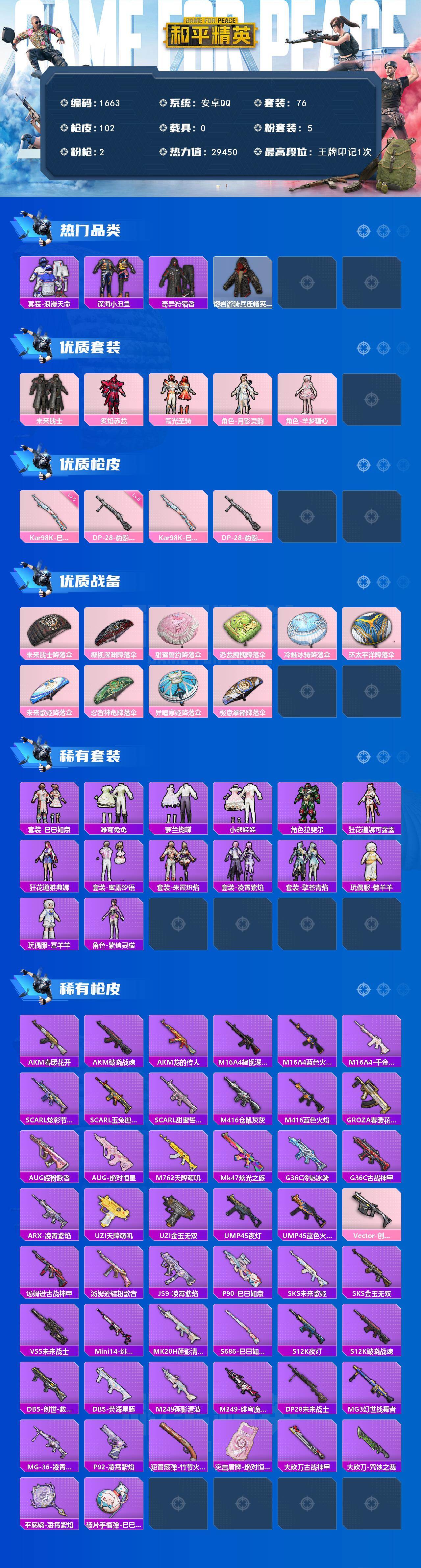[15339881]【1663】安卓 手Q-5粉装-2特效枪-0载具-2粉色飞行器-29450热力值-1王牌印记-76套装-102枪皮 【热门品类】:套装-浪漫天命,套装-深海小丑鱼,套装-奇异狩猎者,熔岩游骑兵连帽夹克 【粉色套装】:粉装-未来战士,粉装-炙焰赤龙,粉装-霞光圣骑,角色-月影灵韵,角色-羊梦糖心 【粉色枪皮等级】:Kar98K-巳巳如意(五级),DP-28-豹影疾电(五级) 【粉色枪皮】:Kar98K-巳巳如意,DP-28-豹影疾电 【粉色降落伞】:未来战士降落伞,凝视深渊降落伞,甜蜜誓约降落伞,恐龙拽拽降落伞,冷魅冰骑降落伞,环太平洋降落伞,未来歌姬降落伞,忍者神龟降落伞,异瞳寒姬降落伞,极意拳锋降落伞,炫彩糖果降落伞 【稀有套装】:套装-巳巳如意,套装-雏菊兔兔,套装-萝兰蝴蝶,套装-小熊娃娃,角色-拉斐尔,角色-狂花道·娜可露露,角色-狂花道·雅典娜,套装-蜜露汐语,套装-朱霞炽焰,套装-凌霄紫焰,套装-擎苍青焰,玩偶服-懒羊羊,玩偶服-喜羊羊,角色-紫俏灵猫,套装-炫彩糖果 【稀有枪皮】:AKM-春暖花开,AKM-破晓战魂,AKM-龙的传人,M16A4-凝视深渊,M16A4-蓝色火焰,M16A4-千金淑猫,SCAR-L-炫彩节奏,SCAR-L-玉兔迎春,SCAR-L-甜蜜誓约,M416-仓鼠灰灰,M416-蓝色火焰,GROZA-春暖花开,AUG-耀粉歌者,AUG-绝对恒星,M762-天降萌叽,Mk47-炫光之旅,G36C-冷魅冰骑,G36C-古战神甲,ARX-凌霄紫焰,UZI-天降萌叽,UZI-金玉无双,UMP45-夜灯,UMP45-蓝色火焰,Vector-创世·救赎,汤姆逊-古战神甲,汤姆逊-耀粉歌者,JS9-凌霄紫焰,P90-巳巳如意,SKS-未来歌姬,SKS-金玉无双,VSS-未来战士,Mini14-绯穹魔姬,MK20-H-莲影清波,S686-巳巳如意,S12K-破晓战魂,S12K-夜灯,DBS-荧海星豚,DBS-创世·救赎,M249-莲影清波,M249-绯穹魔姬,DP-28-未来战士,MG3-幻世战舞者,MG-36-凌霄紫焰,P92-凌霄紫焰,短管霰弹-竹节火铳,突击盾牌-绝对恒星,大砍刀-古战神甲,大砍刀-咒蚀之裁,平底锅-凌霄紫焰,破片手榴弹-巳巳如意 【其他套装】:套装-SS29特训,套装-鹿角斗士,套装-冷焰舞者,套装-幻影武者,套装-浪漫天