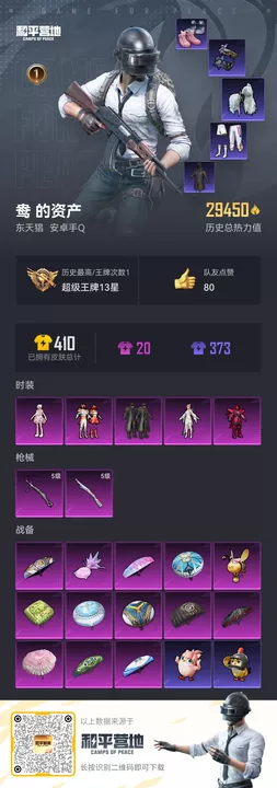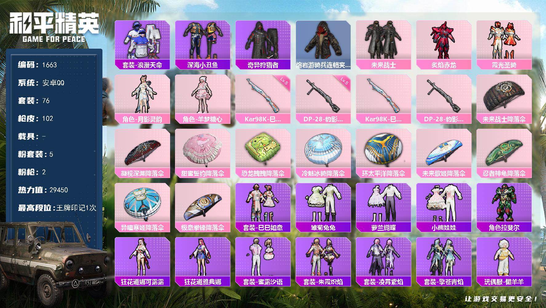 [15339881]【1663】安卓 手Q-5粉装-2特效枪-0载具-2粉色飞行器-29450热力值-1王牌印记-76套装-102枪皮