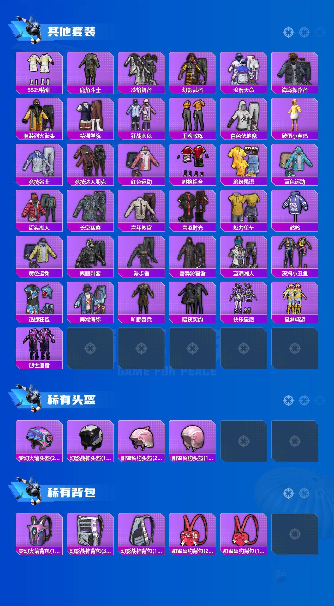 【其他套装】:套装-SS29特训,套装-鹿角斗士,套装-冷焰舞者,套装-幻影武者,套装-浪漫天