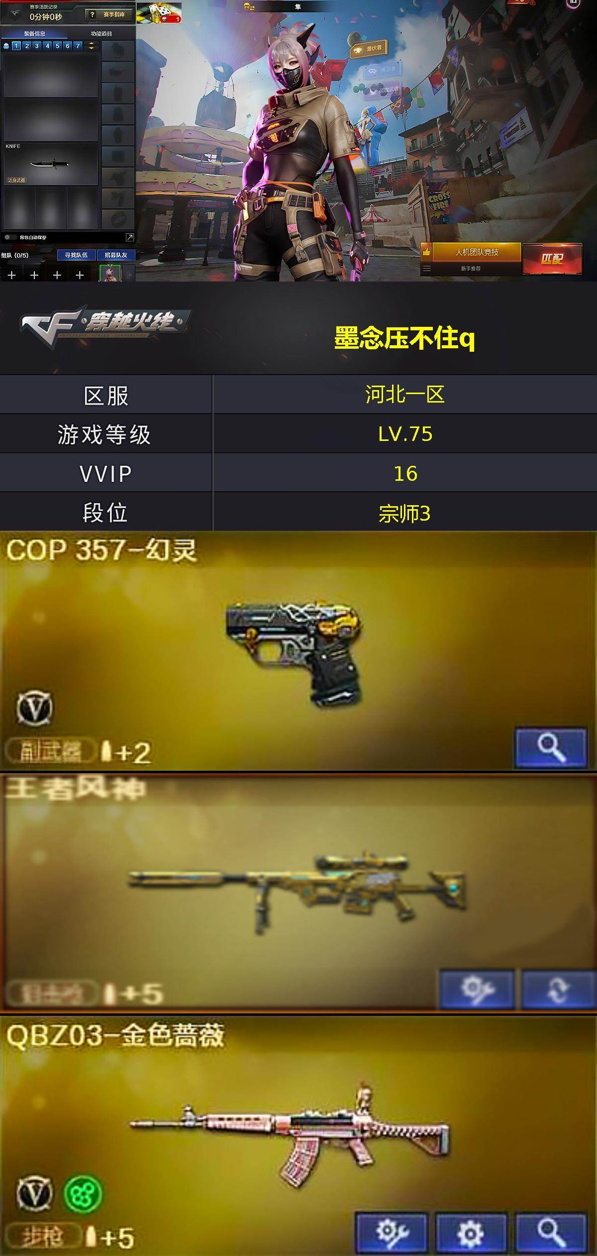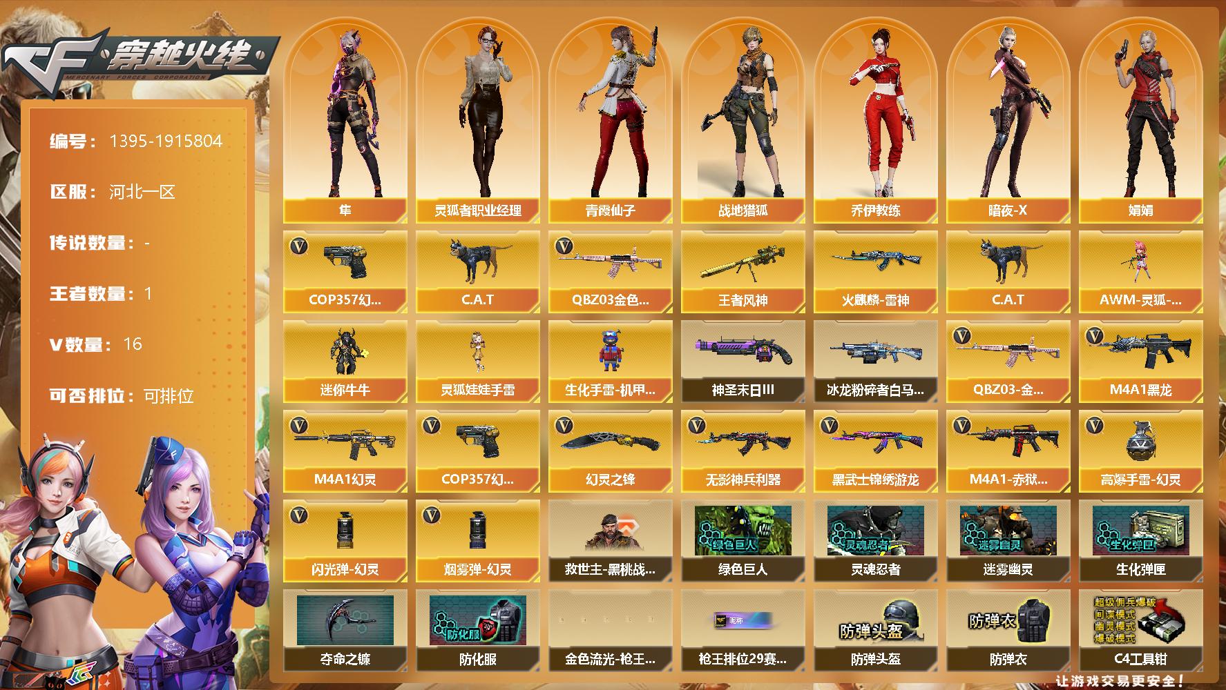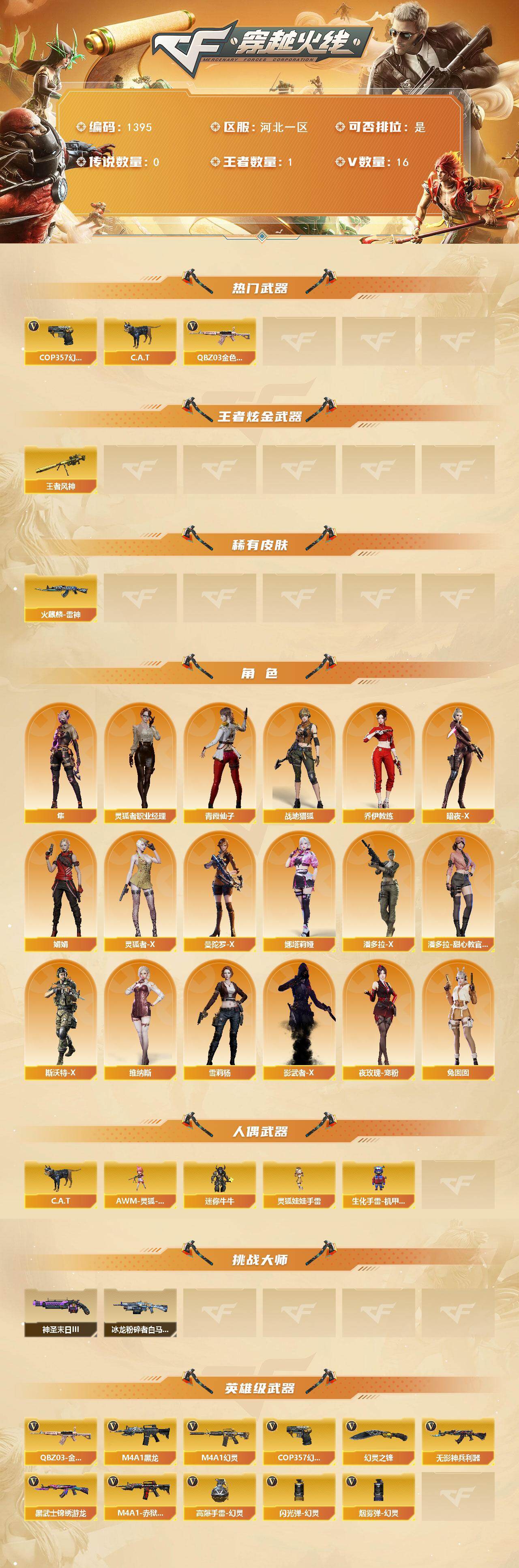 [15341017]河北一区-16V-1王者-0炫金 【热门武器】:QBZ03-金色蔷薇,C.A.T,COP 357-幻灵 【王者炫金武器】:王者风神 【皮肤】:火麒麟-雷神 【角色】:隼,战地猎狐,乔伊教练,暗夜-X,娟娟,灵狐者-X,灵狐者-职业经理,曼陀罗-X,娜塔莉娅,潘多拉-X,潘多拉-甜心教官,青霞仙子,斯沃特-X,兔囡囡,维纳斯,雪莉杨,夜玫瑰-宠粉,影武者-X 【人偶武器】:AWM-灵狐-15周年