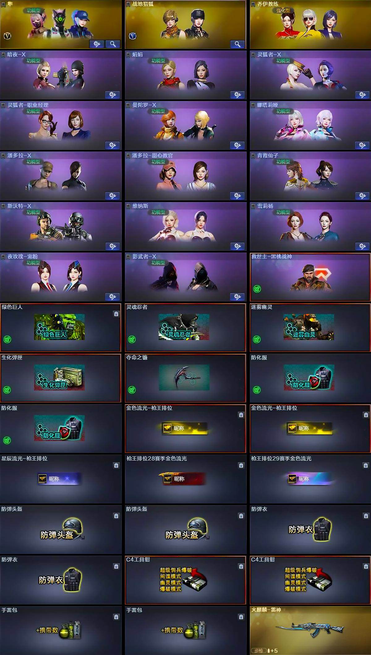 【角色】:隼,战地猎狐,乔伊教练,暗夜-X,娟娟,灵狐者-X,灵狐者-职业经理,曼陀罗-X,娜塔莉娅,潘多拉-X,潘多拉-甜心教官,青霞仙子,斯沃特-X,兔囡囡,维纳斯,雪莉杨,夜玫瑰-宠粉,影武者-X