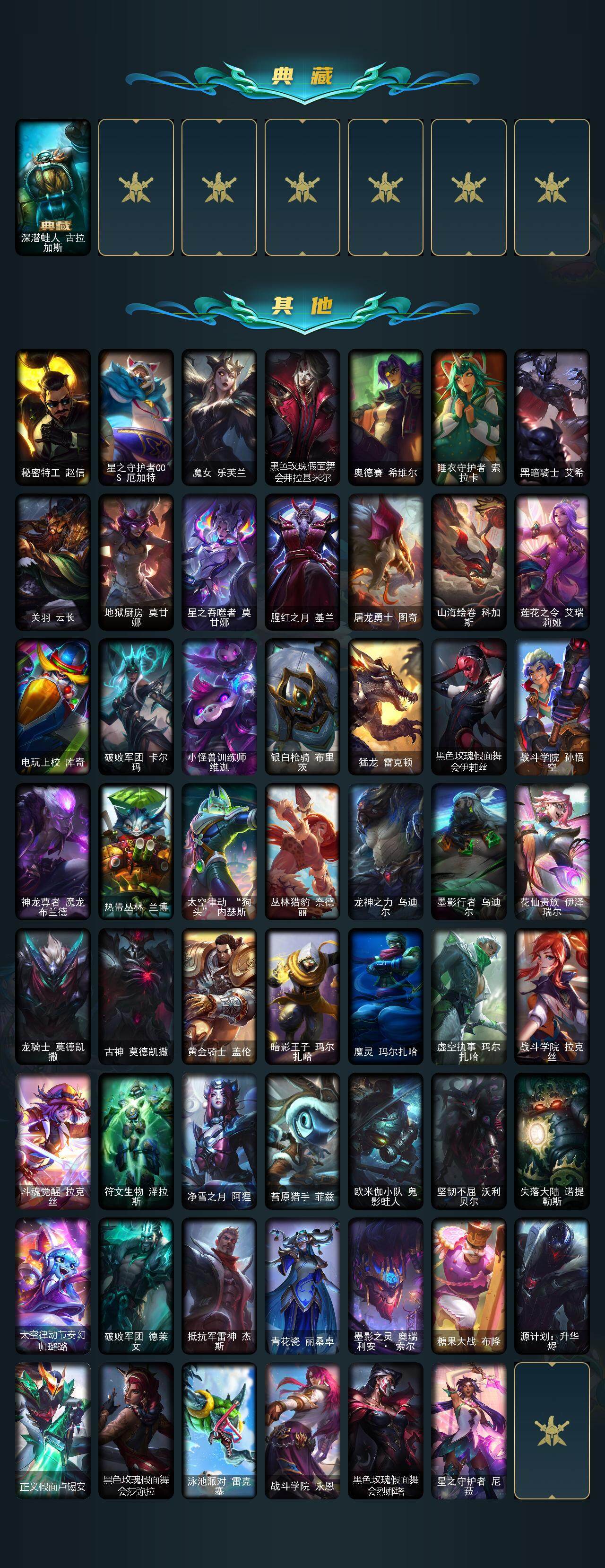 【其他皮肤1】:秘密特工赵信,星之守护者COS厄加特,魔女乐芙兰,黑色玫瑰假面舞会弗拉基米尔,奥德赛希维尔,睡衣守护者索拉卡,黑暗骑士艾希,关羽云长,地狱厨房莫甘娜,星之吞噬者莫甘娜,腥红之月基兰,屠龙勇士图奇,山海绘卷科加斯,莲花之令艾瑞莉娅,电玩上校库奇,破败军团卡尔玛,小怪兽训练师维迦,银白枪骑布里茨,猛龙雷克顿,黑色玫瑰假面舞会伊莉丝,战斗学院孙悟空,神龙尊者魔龙布兰德,热带丛林兰博,太空律动狗头内瑟斯,丛林猎豹奈德丽,龙神之力乌迪尔,墨影行者乌迪尔,花仙贵族伊泽瑞尔,龙骑士莫德凯撒,古神莫德凯撒,黄金骑士盖伦,暗影王子玛尔扎哈,魔