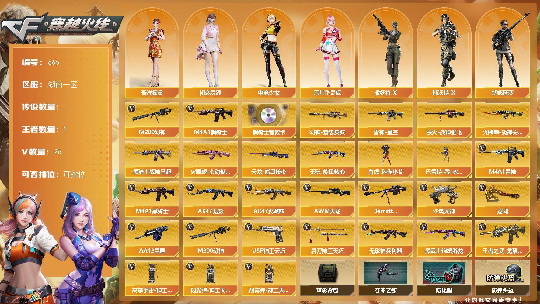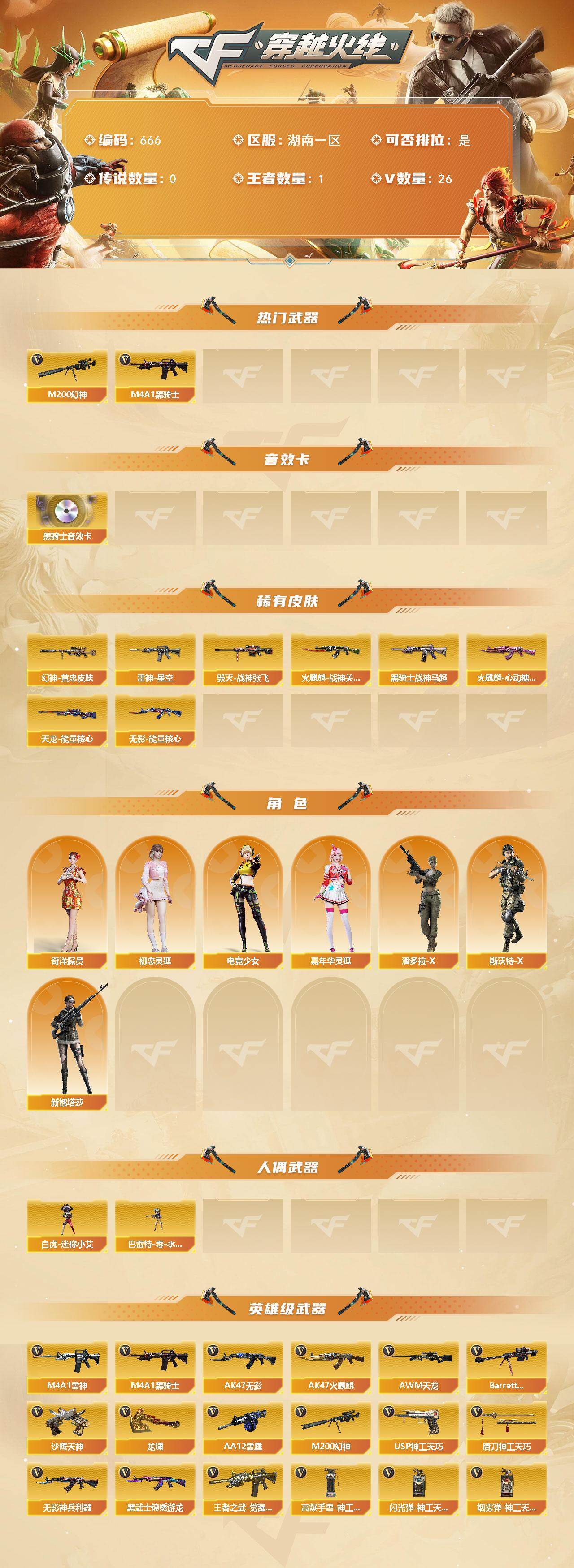 [15344708]湖南一区-26V-1王者-0炫金 【热门武器】:M200-幻神,M4A1-黑骑士 【音效卡】:M4A1-黑骑士音效卡 【皮肤】:M200-幻神-黄忠皮肤,雷神-星空,火麒麟-战神关羽,火麒麟-心动糖果,毁灭-战神张飞,黑骑士-战神马超,无影-能量核心,天龙-能量核心 【角色】:奇洋探员,初恋灵狐,电竞少女,嘉年华灵狐,潘多拉-X,斯沃特-X,新娜塔莎 【人偶武器】:白虎-迷你小艾,巴雷特-零-水下丽影 【英雄级武器】:AK47-火麒麟*2,M4A1-雷神,M4A1-黑骑士,AK47-无影*4,无影-神兵利器,黑武士-锦绣游龙,王者之武-觉醒版,AWM-天龙,Barrett-毁灭,M200-幻神,AA-12-雷霆,沙鹰-天神,USP-神工天巧*2,龙啸,唐刀-神工天巧,高爆手雷-神工天巧*2,闪光弹-神工天巧*2,烟雾弹-神工天巧*2 【道具】:炫彩背包,夺命之镰,防化服,枪王排位28赛季金色流光,防弹头盔*4,防弹衣*5,C4工具钳*4,手雷包*5 【特殊枪械】:1黑骑士