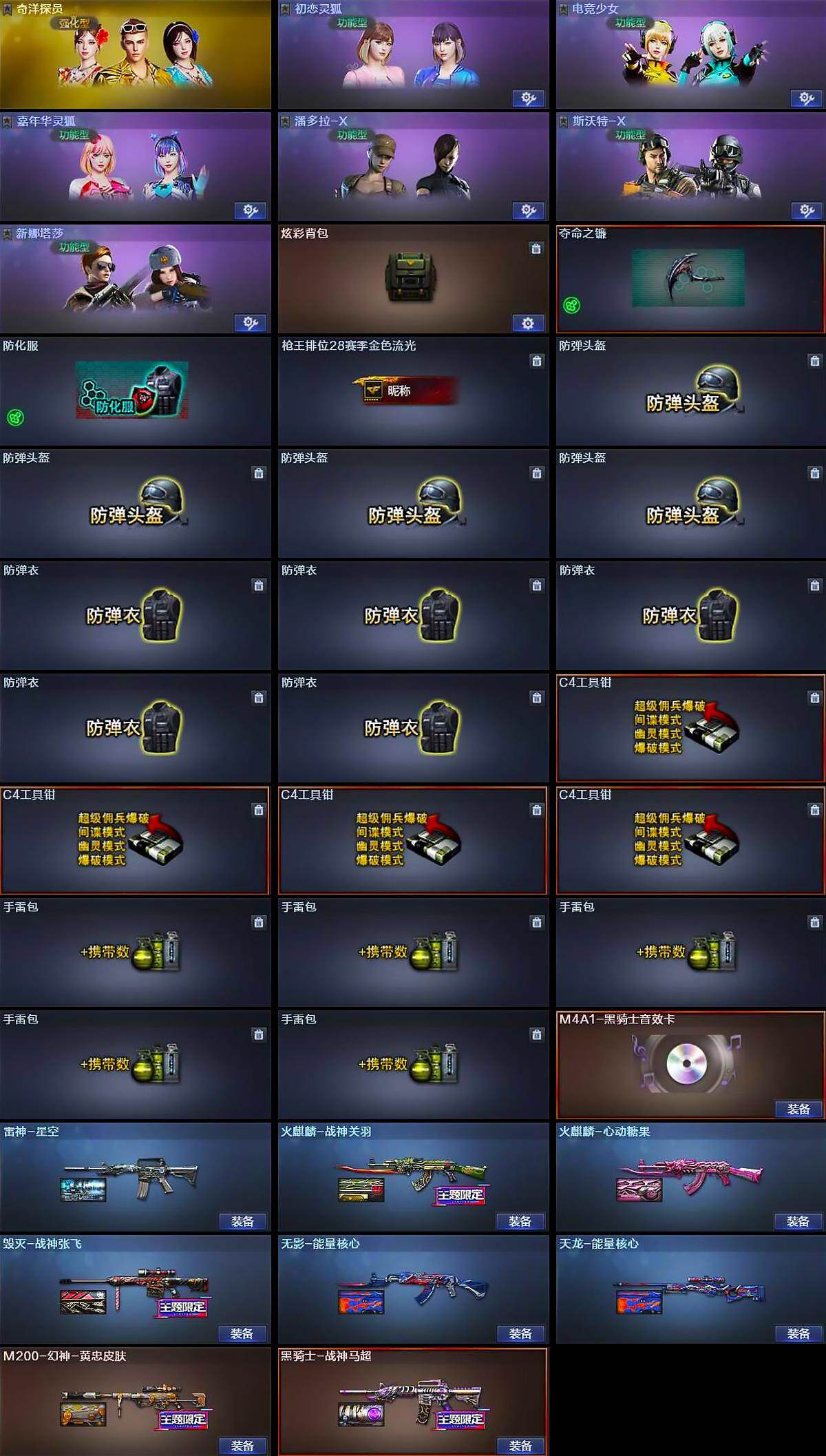 【道具】:炫彩背包,夺命之镰,防化服,枪王排位28赛季金色流光,防弹头盔*4,防弹衣*5,C4工具钳*4,手雷包*5