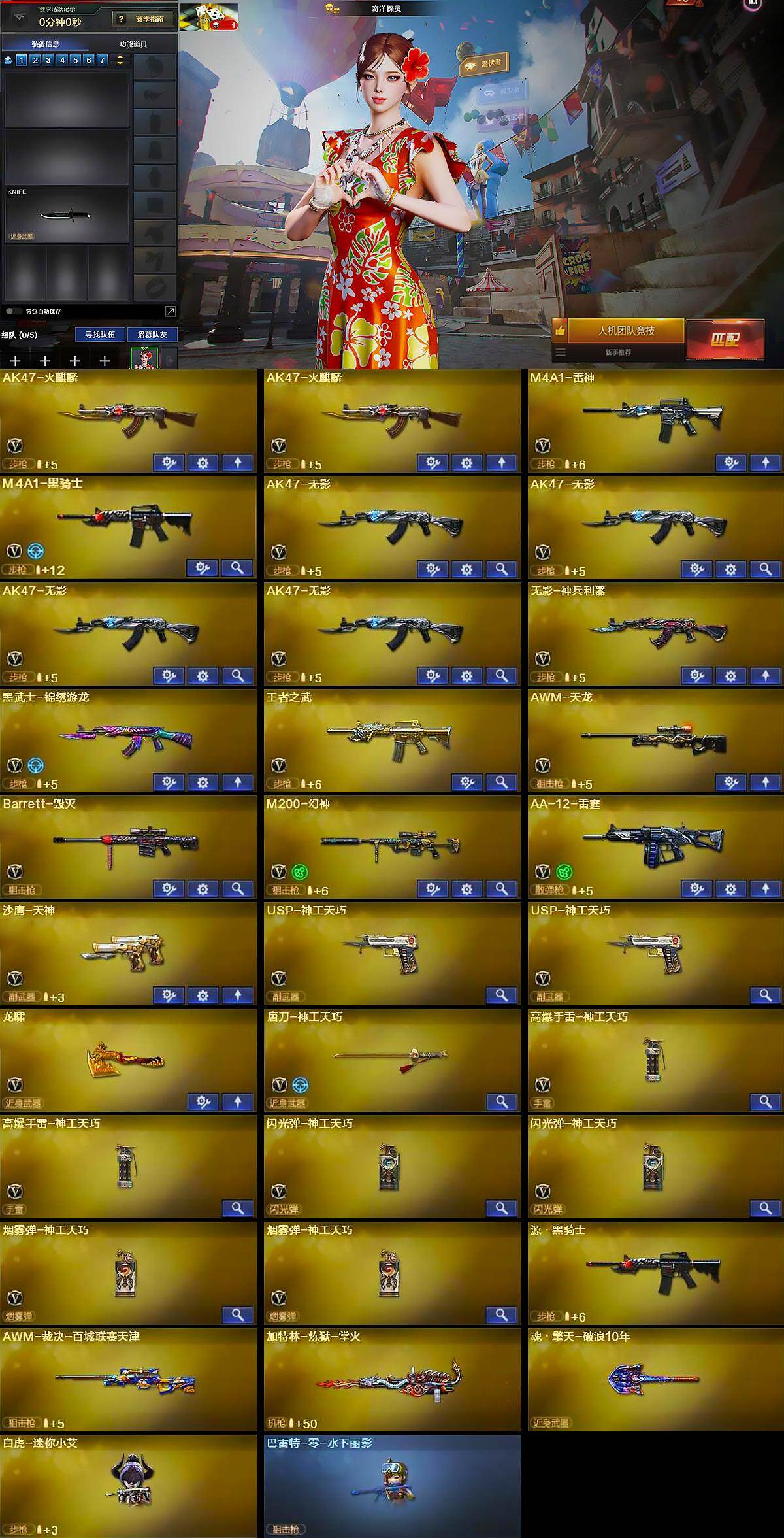 【英雄级武器】:AK47-火麒麟*2,M4A1-雷神,M4A1-黑骑士,AK47-无影*4,无影-神兵利器,黑武士-锦绣游龙,王者之武-觉醒版,AWM-天龙,Barrett-毁灭,M200-幻神,AA-12-雷霆,沙鹰-天神,USP-神工天巧*2,龙啸,唐刀-神工天巧,高爆手雷-神工天巧*2,闪光弹-神工天巧*2,烟雾弹-神工天巧*2