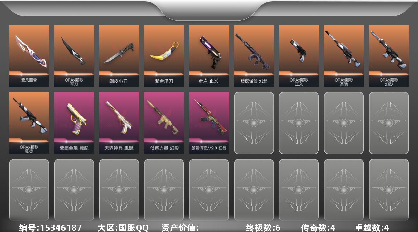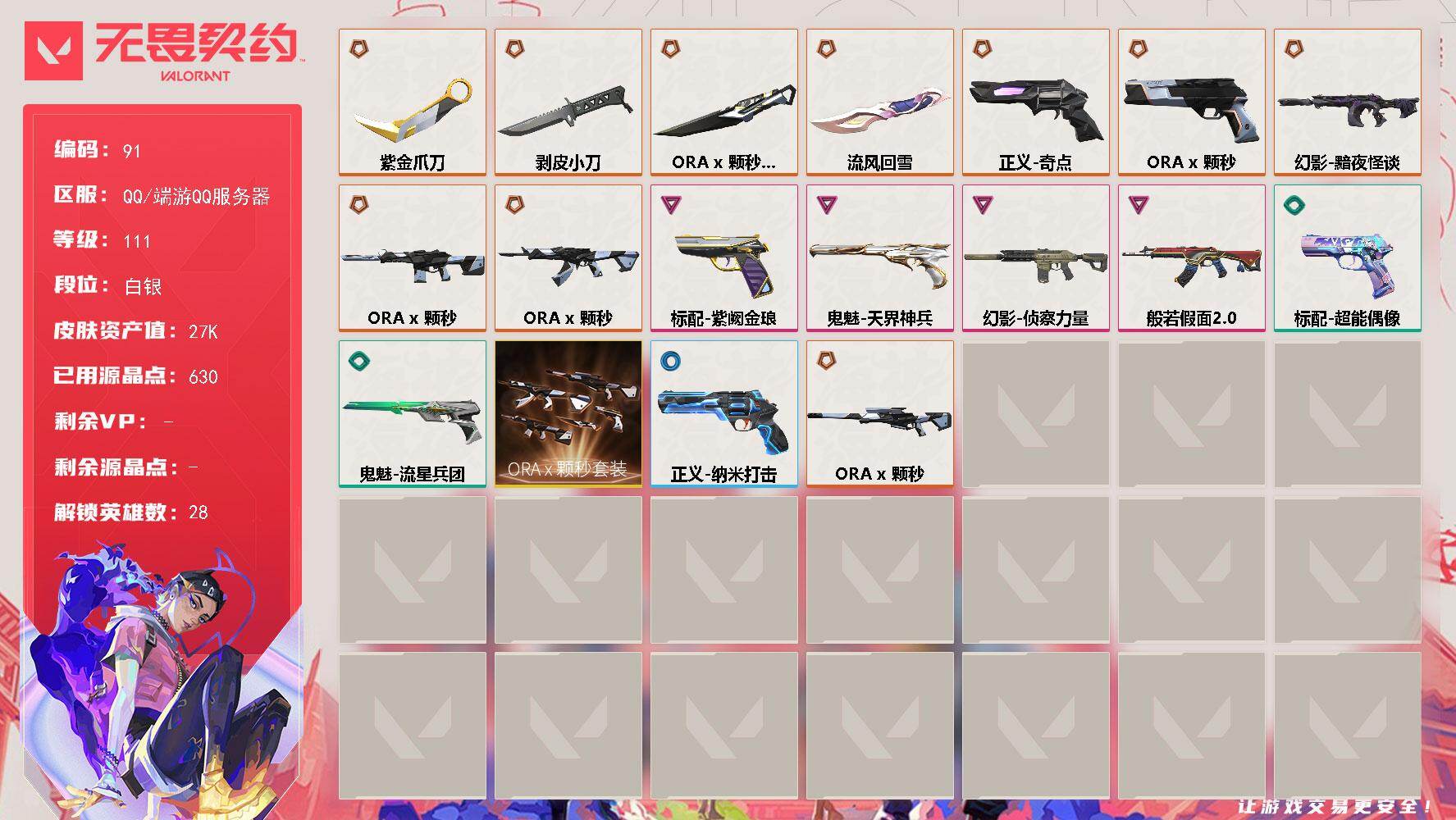 [15346187]【91】【套装】:ORA x 颗秒套装 【英雄】:幻棱,炼狱,维斯,暮蝶,钛狐,壹决,铁臂,捷风,雷兹,幽影,不死鸟,贤者,猎枭,蝰蛇,零,芮娜,奇乐,尚勃勒,霓虹,斯凯,夜露,星礈,K/O,海神,盖可,黑梦,钢锁 【近战武器】:近战武器-流风回雪,近战武器-ORA x 颗秒 军刀,近战武器-剥皮小刀,近战武器-紫金爪刀 【狂徒】:狂徒-ORA x 颗秒,狂徒-般若假面//2.0 【幻影】:幻影-黯夜怪谈,幻影-ORA x 颗秒,幻影-侦察力量 【冥驹】:冥驹-ORA x 颗秒 【标配】:标配-紫阙金琅,标配-超能偶像 【正义】:正义-奇点,正义-ORA x 颗秒,正义-纳米打击 【鬼魅】:鬼魅-天界神兵,鬼魅-流星兵团 【卡面】:进入射程 卡面,《双城之战》拥抱 卡面,精灵大战 卡面,欢迎来到底城 卡面,南瓜盛典 卡面,修车达人 卡面,正义的化身 卡面,铁之华 卡面,时间到 卡面,最高舞台 卡面,声感陷阱设计图 卡面,梦幻奶茶 卡面,终章:打造专属狂徒 卡面,趁热吃 卡面,源能反应 卡面,零点嗅探设计图 卡面,清除名单 卡面,暗枪 卡面,夯实根基 卡面,热烈欢迎 卡面,铁臂设计图 卡面,代号红色 卡面,冰淇淋店 卡面,新兵报到 卡面,V契约 卡面,无畏契约 卡面 【喷漆】:嗨宝南瓜灯 喷漆,嘭! 喷漆,都算到了 喷漆,控场勿近 喷漆,小丑猫 喷漆,熊抱 喷漆,超级粉丝 喷漆,捷风差距 喷漆,惊声尖叫 喷漆,拼一枪 喷漆,我觉得不行 喷漆,我的刀呢? 喷漆,禁止喷漆 喷漆,老铁困了 喷漆,口袋贤者 喷漆,胜利属于无畏契约 喷漆,GLHF 喷漆,无畏契约 喷漆 【挂饰】:终章:猫猫木乃伊 挂饰,悠闲鸡块 挂饰,伞绳 挂饰,《双城之战》小蛋糕 挂饰,第九季//第三幕 纪念币 挂饰,无畏契约GO!第一卷 芮娜 挂饰,无畏契约GO!第一卷 零 挂饰,熔岩灯 挂饰,第九季//第二幕 纪念币 挂饰,终章:这瓜保熟 挂饰,糖葫芦 挂饰,袖珍捷风 挂饰,迷你浓缩 挂饰,动力机箱 挂饰,第九季//第一幕 纪念币 挂饰,终章:迷你机甲 挂饰,战术河童 挂饰,荧光棒 挂饰,第八季//第三幕 纪念币 挂饰,第八季//第二幕 纪念币 挂饰 ,好运福爪 挂饰,冬日絮语 挂饰,第七季//第三幕 纪念币 挂饰,幸运中国结 挂饰,无畏契约 纪念币 挂饰
