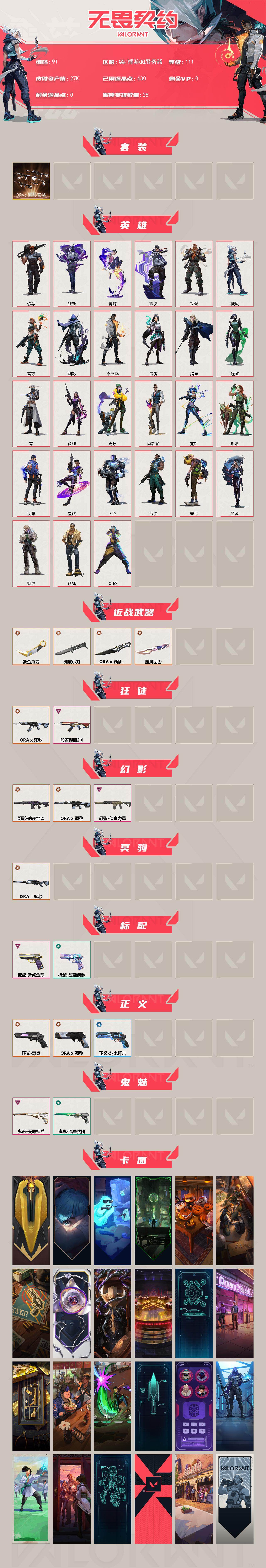[15346187]【91】【套装】:ORA x 颗秒套装 【英雄】:幻棱,炼狱,维斯,暮蝶,钛狐,壹决,铁臂,捷风,雷兹,幽影,不死鸟,贤者,猎枭,蝰蛇,零,芮娜,奇乐,尚勃勒,霓虹,斯凯,夜露,星礈,K/O,海神,盖可,黑梦,钢锁 【近战武器】:近战武器-流风回雪,近战武器-ORA x 颗秒 军刀,近战武器-剥皮小刀,近战武器-紫金爪刀 【狂徒】:狂徒-ORA x 颗秒,狂徒-般若假面//2.0 【幻影】:幻影-黯夜怪谈,幻影-ORA x 颗秒,幻影-侦察力量 【冥驹】:冥驹-ORA x 颗秒 【标配】:标配-紫阙金琅,标配-超能偶像 【正义】:正义-奇点,正义-ORA x 颗秒,正义-纳米打击 【鬼魅】:鬼魅-天界神兵,鬼魅-流星兵团 【卡面】:进入射程 卡面,《双城之战》拥抱 卡面,精灵大战 卡面,欢迎来到底城 卡面,南瓜盛典 卡面,修车达人 卡面,正义的化身 卡面,铁之华 卡面,时间到 卡面,最高舞台 卡面,声感陷阱设计图 卡面,梦幻奶茶 卡面,终章:打造专属狂徒 卡面,趁热吃 卡面,源能反应 卡面,零点嗅探设计图 卡面,清除名单 卡面,暗枪 卡面,夯实根基 卡面,热烈欢迎 卡面,铁臂设计图 卡面,代号红色 卡面,冰淇淋店 卡面,新兵报到 卡面,V契约 卡面,无畏契约 卡面 【喷漆】:嗨宝南瓜灯 喷漆,嘭! 喷漆,都算到了 喷漆,控场勿近 喷漆,小丑猫 喷漆,熊抱 喷漆,超级粉丝 喷漆,捷风差距 喷漆,惊声尖叫 喷漆,拼一枪 喷漆,我觉得不行 喷漆,我的刀呢? 喷漆,禁止喷漆 喷漆,老铁困了 喷漆,口袋贤者 喷漆,胜利属于无畏契约 喷漆,GLHF 喷漆,无畏契约 喷漆 【挂饰】:终章:猫猫木乃伊 挂饰,悠闲鸡块 挂饰,伞绳 挂饰,《双城之战》小蛋糕 挂饰,第九季//第三幕 纪念币 挂饰,无畏契约GO!第一卷 芮娜 挂饰,无畏契约GO!第一卷 零 挂饰,熔岩灯 挂饰,第九季//第二幕 纪念币 挂饰,终章:这瓜保熟 挂饰,糖葫芦 挂饰,袖珍捷风 挂饰,迷你浓缩 挂饰,动力机箱 挂饰,第九季//第一幕 纪念币 挂饰,终章:迷你机甲 挂饰,战术河童 挂饰,荧光棒 挂饰,第八季//第三幕 纪念币 挂饰,第八季//第二幕 纪念币 挂饰 ,好运福爪 挂饰,冬日絮语 挂饰,第七季//第三幕 纪念币 挂饰,幸运中国结 挂饰,无畏契约 纪念币 挂饰