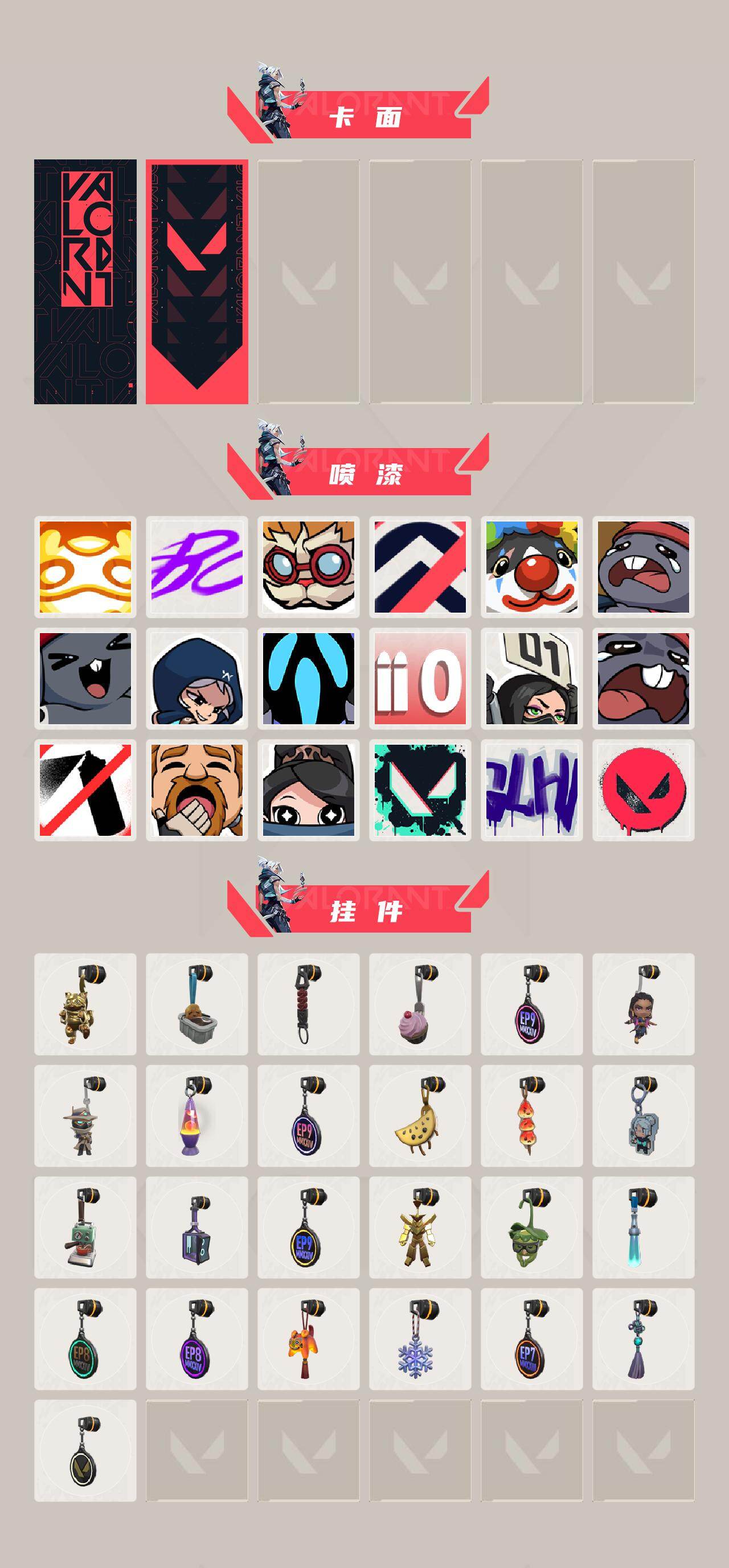 【喷漆】:嗨宝南瓜灯 喷漆,嘭! 喷漆,都算到了 喷漆,控场勿近 喷漆,小丑猫 喷漆,熊抱 喷漆,超级粉丝 喷漆,捷风差距 喷漆,惊声尖叫 喷漆,拼一枪 喷漆,我觉得不行 喷漆,我的刀呢? 喷漆,禁止喷漆 喷漆,老铁困了 喷漆,口袋贤者 喷漆,胜利属于无畏契约 喷漆,GLHF 喷漆,无畏契约 喷漆