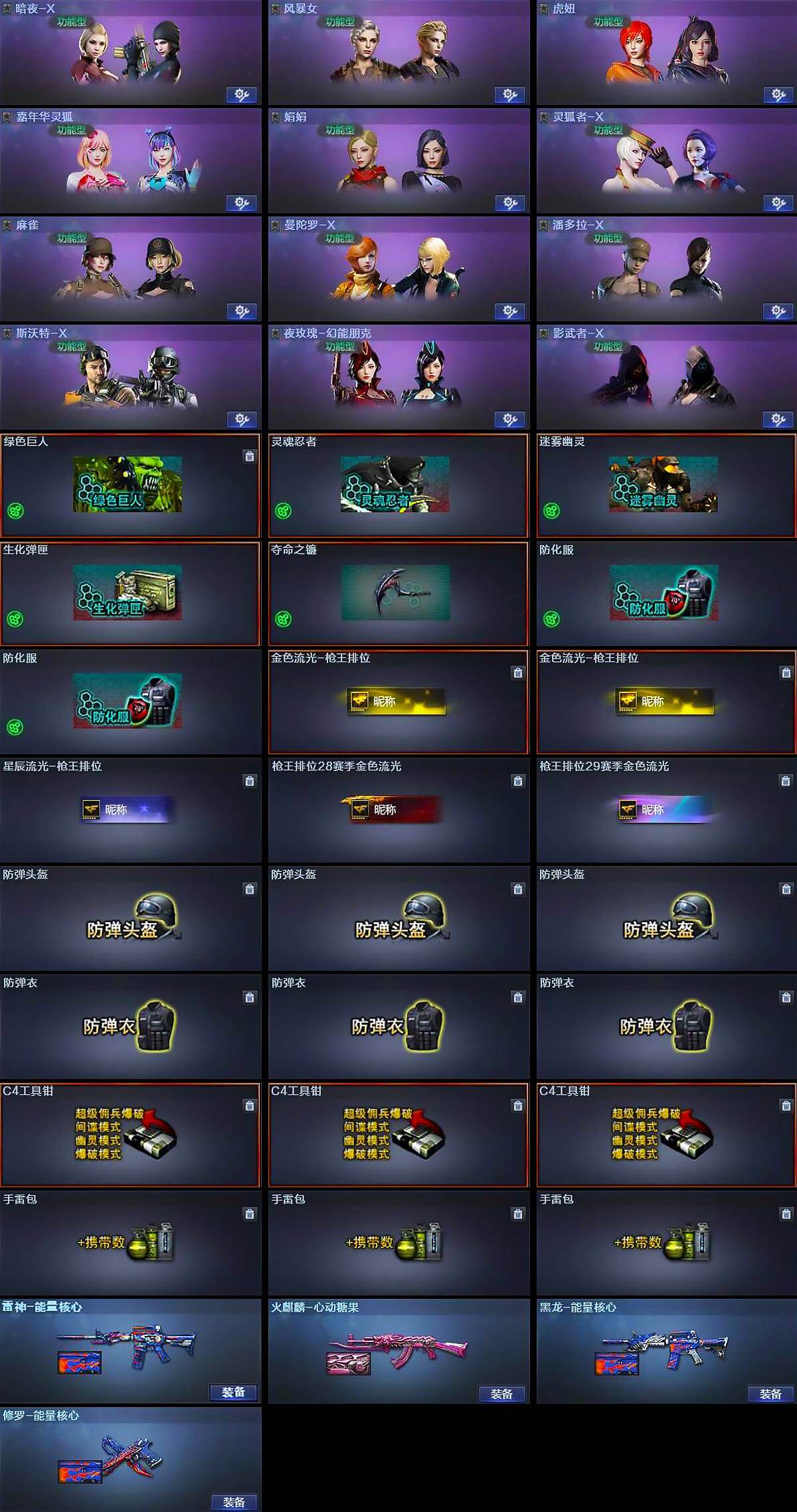 【道具】:绿色巨人,灵魂忍者,迷雾幽灵,生化弹匣,夺命之镰,防化服*2,金色流光-枪王排位*2,星辰流光-枪王排位,枪王排位28赛季金色流光,枪王排位29赛季金色流光,防弹头盔*3,防弹衣*3,C4工具钳*3,手雷包*3