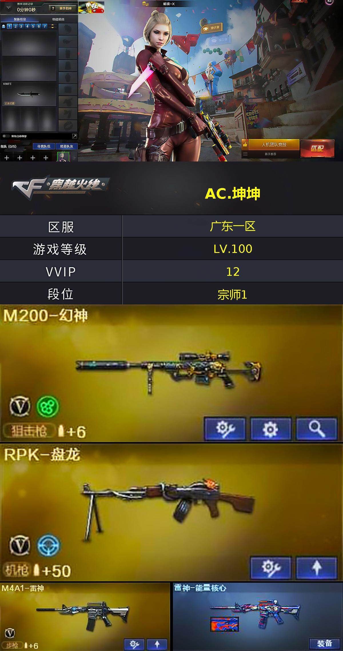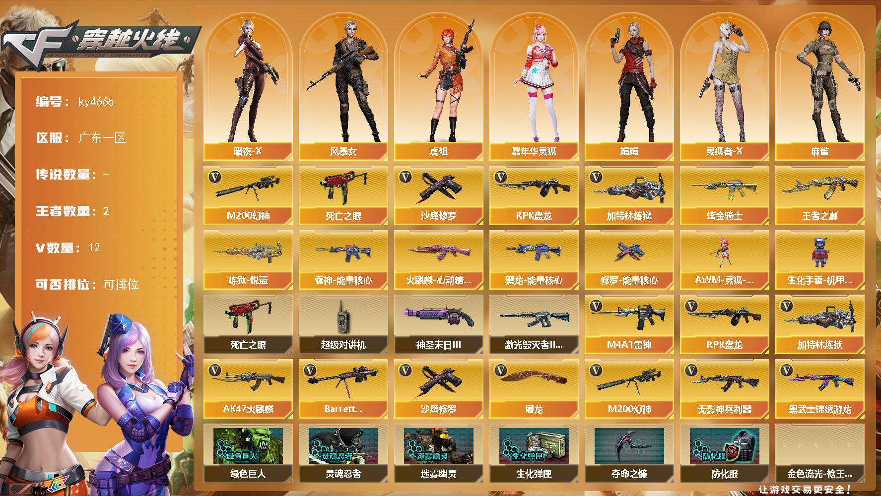 [15315881]广东一区-12V-2王者-1炫金 【热门武器】:M200-幻神,死亡之眼,RPK-盘龙,加特林-炼狱,沙鹰-修罗 【王者炫金武器】:王者之翼,炼狱-悦蓝,炫金骑士 【皮肤】:雷神-能量核心,火麒麟-心动糖果,黑龙-能量核心,修罗-能量核心 【角色】:暗夜-X,风暴女,虎妞,嘉年华灵狐,娟娟,灵狐者-X,麻雀,曼陀罗-X,潘多拉-X,斯沃特-X,夜玫瑰-幻能朋克,影武者-X 【人偶武器】:AWM-灵狐-15周年嘉年华,生化手雷-机甲核心 【暴走生化】:死亡之眼,超级对讲机 【挑战大师】:激光毁灭者III-白马银枪,神圣爆裂者-末日III 【英雄级武器】:AK47-火麒麟*2,M4A1-雷神,无影-神兵利器,黑武士-锦绣游龙,Barrett-毁灭,M200-幻神,RPK-盘龙,加特林-炼狱,沙鹰-修罗,屠龙 【道具】:绿色巨人,灵魂忍者,迷雾幽灵,生化弹匣,夺命之镰,防化服*2,金色流光-枪王排位*2,星辰流光-枪王排位,枪王排位28赛季金色流光,枪王排位29赛季金色流光,防弹头盔*3,防弹衣*3,C4工具钳*3,手雷包*3 【特殊枪械】:1盘龙,1炼狱