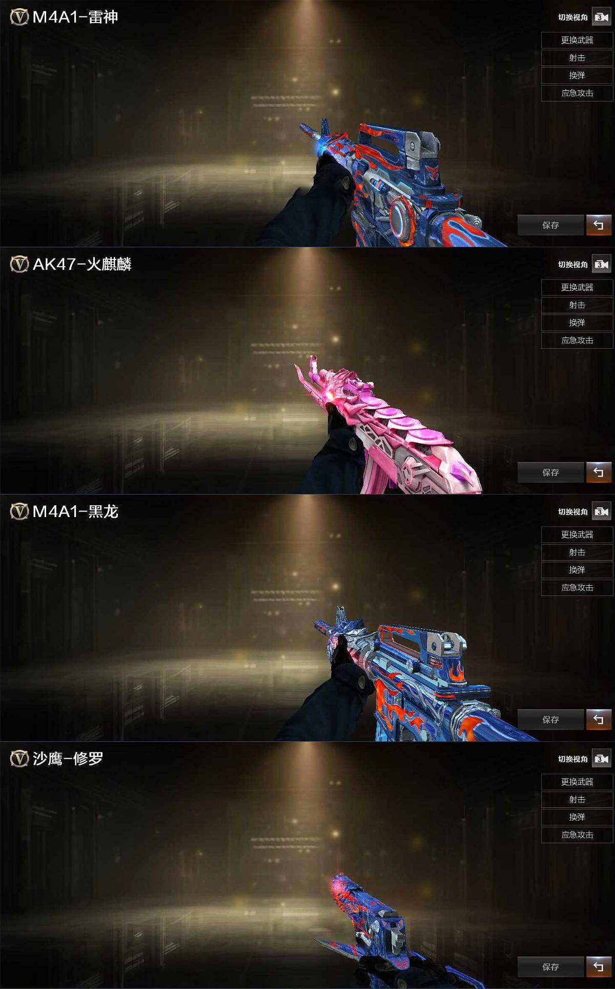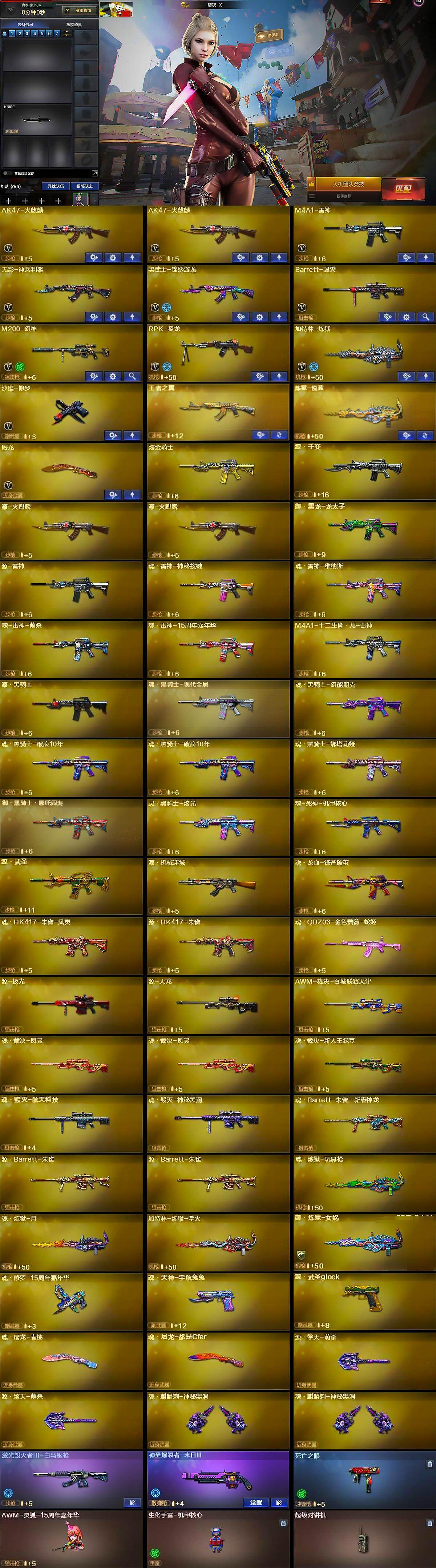 【英雄级武器】:AK47-火麒麟*2,M4A1-雷神,无影-神兵利器,黑武士-锦绣游龙,Barrett-毁灭,M200-幻神,RPK-盘龙,加特林-炼狱,沙鹰-修罗,屠龙