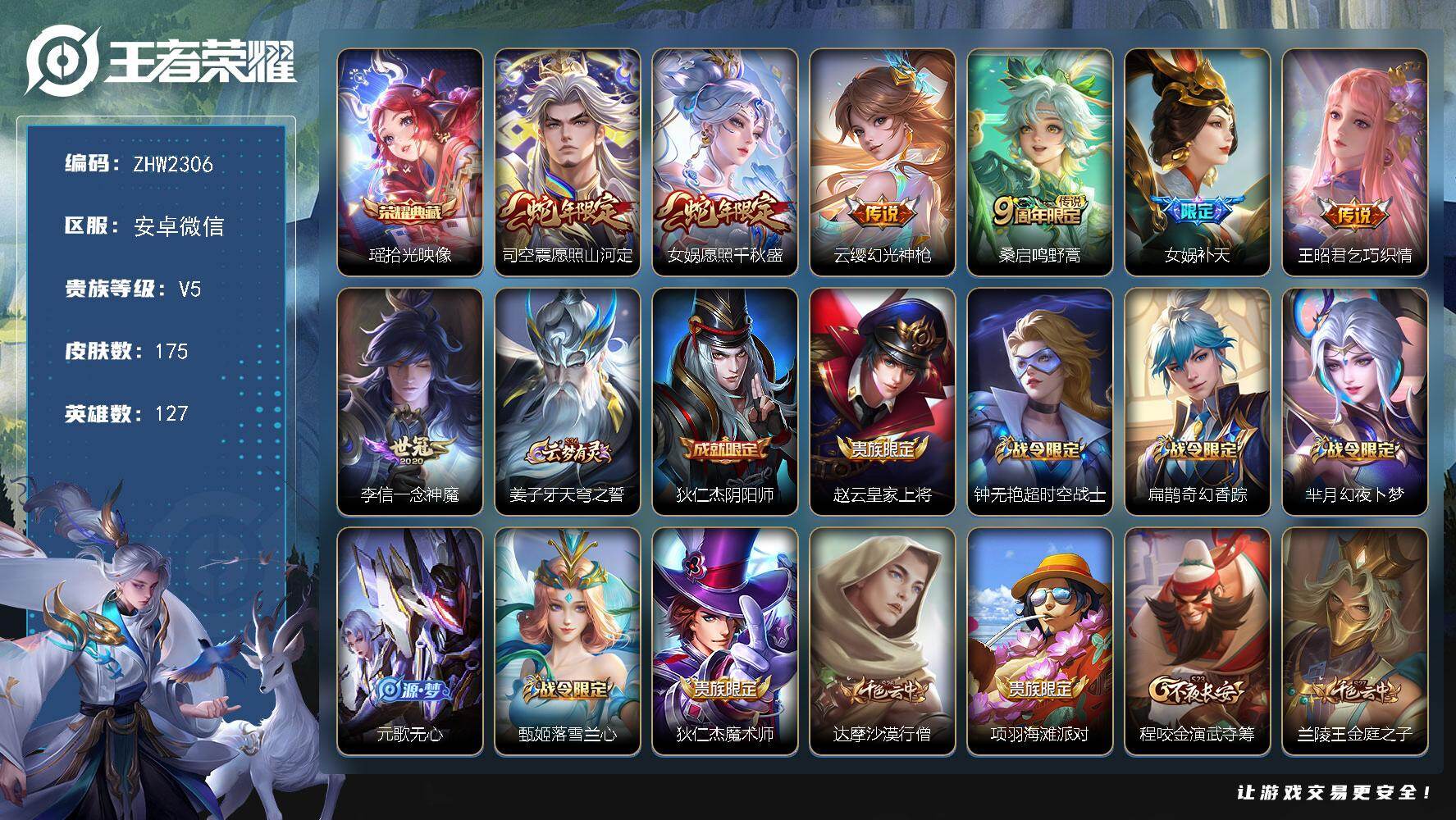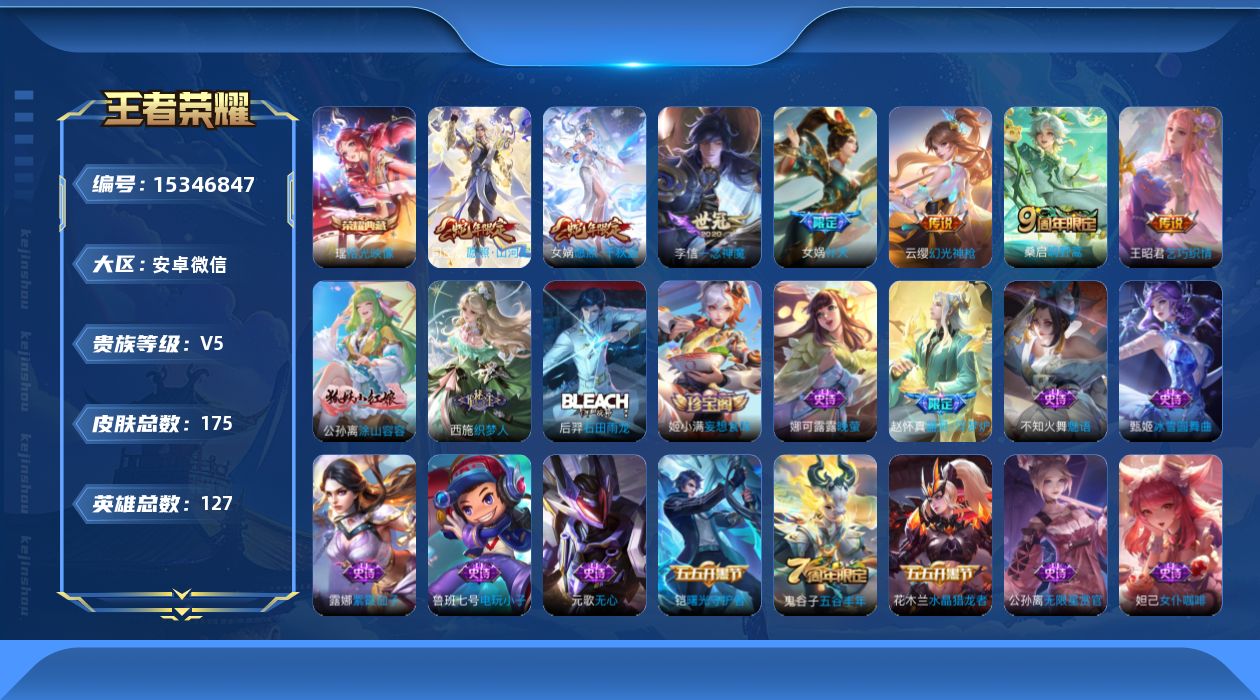 [15346847]安卓WX-V5-永恒钻石I段位-127英雄-175皮肤-1典藏皮肤-7传说-59史诗 【荣耀典藏】:瑶拾光映像 【传说皮肤】:司空震愿照山河定,女娲愿照千秋盛,云缨幻光神枪,桑启鸣野蒿,女娲补天,王昭君乞巧织情,李信一念神魔 【限定皮肤】:姜子牙天穹之誓,狄仁杰阴阳师,赵云皇家上将,钟无艳超时空战士,扁鹊奇幻香踪,芈月幻夜卜梦,元歌无心,甄姬落雪兰心,狄仁杰魔术师,达摩沙漠行僧,项羽海滩派对,程咬金演武夺筹,兰陵王金庭之子,李元芳云中旅人,钟馗驱傩正仪,杨玉环遇见飞天,杨戬潮玩骑兵,女娲补天,鬼谷子五谷丰年,黄忠火炮绅士,沈梦溪大漠名商,裴擒虎擒涛扼浪,云中君纤云弄巧,嫦娥暖冬兔眠,鲁班大师探海日志,桑启海盐诗旅,暃星界游侠,艾琳女武神,阿古朵江河有灵,张良古海寻踪,高渐离燃音魔法,妲己灵卜魔法,鬼谷子天穹祈灯,姬小满妄想食味,李元芳蔬乡物语,刘邦剑破天穹,周瑜熔金海岸 【赛季限定】:达摩沙漠行僧,程咬金演武夺筹,兰陵王金庭之子,张良古海寻踪,李元芳云中旅人,钟馗驱傩正仪,沈梦溪大漠名商,裴擒虎擒涛扼浪,鲁班大师探海日志,桑启海盐诗旅,鬼谷子天穹祈灯,刘邦剑破天穹,姜子牙天穹之誓 【战令限定】:钟无艳超时空战士,扁鹊奇幻香踪,芈月幻夜卜梦,甄姬落雪兰心,杨戬潮玩骑兵,黄忠火炮绅士,嫦娥暖冬兔眠,暃星界游侠,高渐离燃音魔法,妲己灵卜魔法,李元芳蔬乡物语 【史诗皮肤】:鲁班七号电玩小子,露娜紫霞仙子,赵云皇家上将,赵云未来纪元,貂蝉圣诞恋歌,甄姬冰雪圆舞曲,王昭君偶像歌手,狄仁杰魔术师,廉颇地狱岩魂,宫本武藏鬼剑武藏,孙尚香水果甜心,嬴政摇滚巨星,妲己魅力维加斯,妲己女仆咖啡,墨子龙骑士,墨子金属风暴,吕布圣诞狂欢,刘禅绅士熊喵,曹操幽灵船长,李白千年之狐,吕布末日机甲,张飞乱世虎臣,花木兰水晶猎龙者,刘邦德古拉伯爵,夏侯惇乘风破浪,小乔缤纷独角兽,兰陵王暗隐猎兽者,诸葛亮黄金分割率,亚瑟心灵战警,雅典娜冰冠公主,安琪拉心灵骇客,铠曙光守护者,李元芳逐浪之夏,白起星夜王子,阿轲节奏热浪,杨玉环遇见飞天,孙策猫狗日记,大乔猫狗日记,伽罗箭羽风息,狄仁杰鹰眼统帅,公孙离无限星赏官,娜可露露晚萤,大乔白蛇,不知火舞魅语,云中君纤云弄巧,蒙犽龙鼓争鸣,黄忠火炮绅士,钟无艳超时空战士,鬼谷子五谷丰年,元歌无心,暃星界游侠,扁鹊奇幻香踪,阿古朵江河有灵,妲己灵卜魔法,高渐离燃音魔