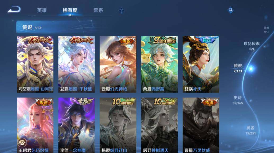 【传说皮肤】:司空震愿照山河定,女娲愿照千秋盛,云缨幻光神枪,桑启鸣野蒿,女娲补天,王昭君乞巧织情,李信一念神魔