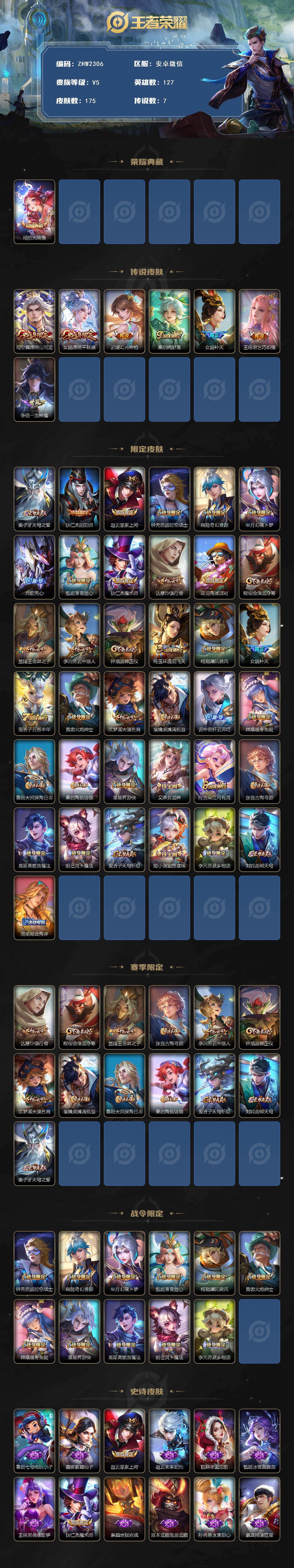 [15346847]安卓WX-V5-永恒钻石I段位-127英雄-175皮肤-1典藏皮肤-7传说-59史诗