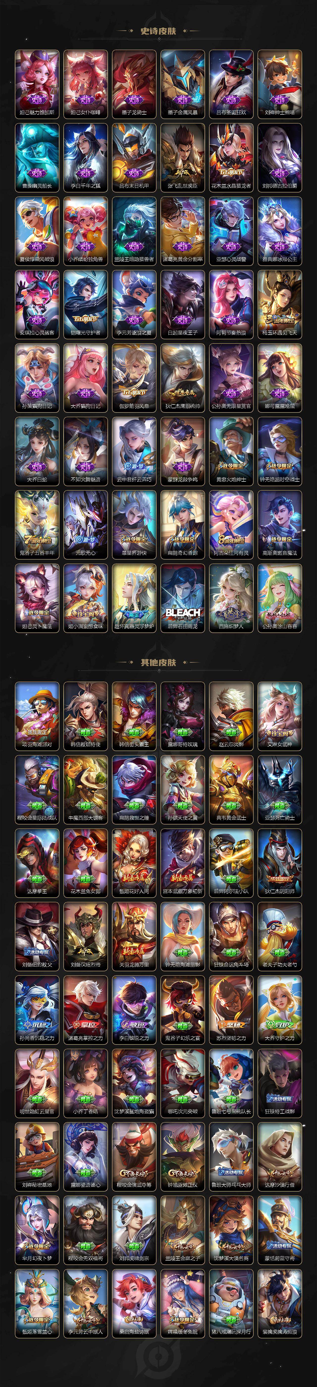 【史诗皮肤】:鲁班七号电玩小子,露娜紫霞仙子,赵云皇家上将,赵云未来纪元,貂蝉圣诞恋歌,甄姬冰雪圆舞曲,王昭君偶像歌手,狄仁杰魔术师,廉颇地狱岩魂,宫本武藏鬼剑武藏,孙尚香水果甜心,嬴政摇滚巨星,妲己魅力维加斯,妲己女仆咖啡,墨子龙骑士,墨子金属风暴,吕布圣诞狂欢,刘禅绅士熊喵,曹操幽灵船长,李白千年之狐,吕布末日机甲,张飞乱世虎臣,花木兰水晶猎龙者,刘邦德古拉伯爵,夏侯惇乘风破浪,小乔缤纷独角兽,兰陵王暗隐猎兽者,诸葛亮黄金分割率,亚瑟心灵战警,雅典娜冰冠公主,安琪拉心灵骇客,铠曙光守护者,李元芳逐浪之夏,白起星夜王子,阿轲节奏热浪,杨玉环遇见飞天,孙策猫狗日记,大乔猫狗日记,伽罗箭羽风息,狄仁杰鹰眼统帅,公孙离无限星赏官,娜可露露晚萤,大乔白蛇,不知火舞魅语,云中君纤云弄巧,蒙犽龙鼓争鸣,黄忠火炮绅士,钟无艳超时空战士,鬼谷子五谷丰年,元歌无心,暃星界游侠,扁鹊奇幻香踪,阿古朵江河有灵,妲己灵卜魔法,高渐离燃音魔