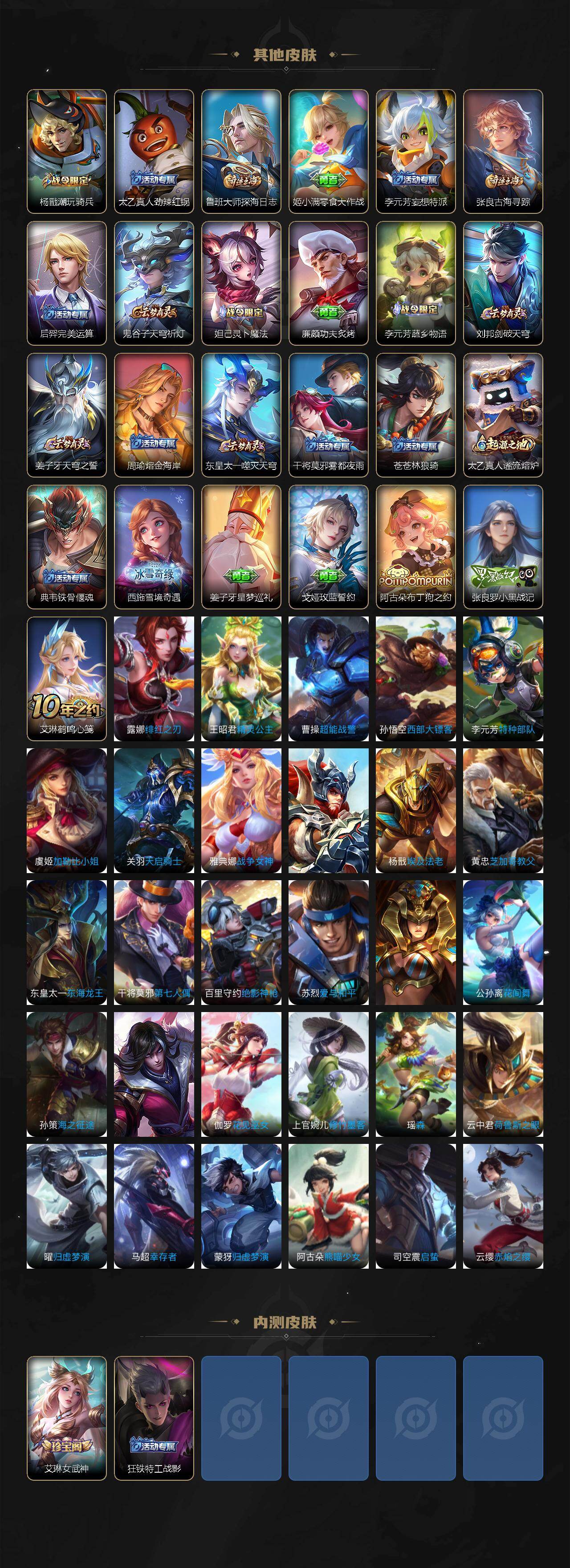 【限定皮肤】:姜子牙天穹之誓,狄仁杰阴阳师,赵云皇家上将,钟无艳超时空战士,扁鹊奇幻香踪,芈月幻夜卜梦,元歌无心,甄姬落雪兰心,狄仁杰魔术师,达摩沙漠行僧,项羽海滩派对,程咬金演武夺筹,兰陵王金庭之子,李元芳云中旅人,钟馗驱傩正仪,杨玉环遇见飞天,杨戬潮玩骑兵,女娲补天,鬼谷子五谷丰年,黄忠火炮绅士,沈梦溪大漠名商,裴擒虎擒涛扼浪,云中君纤云弄巧,嫦娥暖冬兔眠,鲁班大师探海日志,桑启海盐诗旅,暃星界游侠,艾琳女武神,阿古朵江河有灵,张良古海寻踪,高渐离燃音魔法,妲己灵卜魔法,鬼谷子天穹祈灯,姬小满妄想食味,李元芳蔬乡物语,刘邦剑破天穹,周瑜熔金海岸