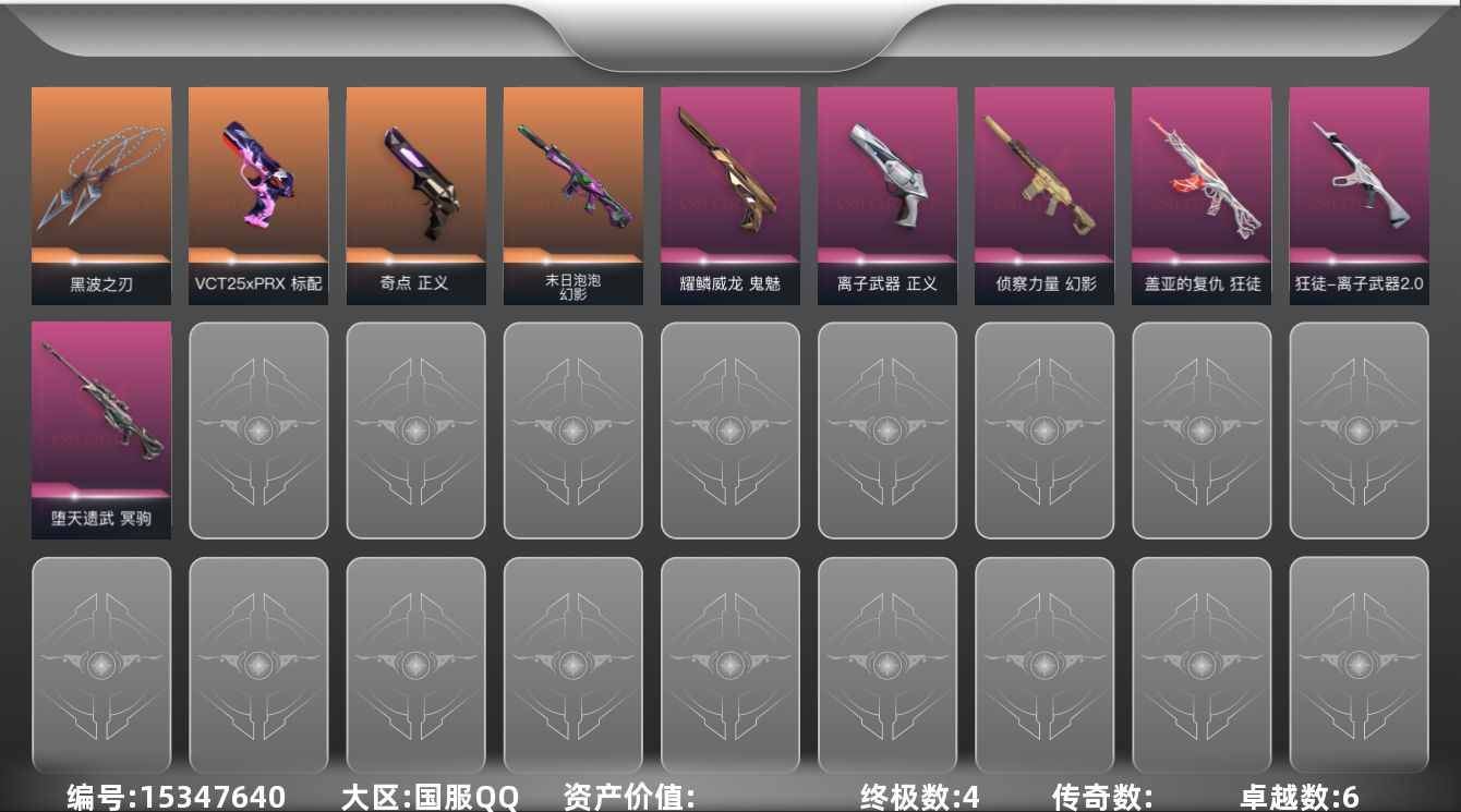 - [15272034]【店主推荐捡漏号!可直接换绑】【套装】:2025全球冠军赛套装,光荣异象套装,RGX 11z Pro套装,VCT 2025 赛季套装,RGX 11z Pro//2.0套装,创·纪元套装,离火刃套装,归零者套装,神中神罚套装,离火刃套装 【英雄】:幻棱,炼狱,维斯,暮蝶,钛狐,壹决,铁臂,捷风,雷兹,幽影,不死鸟,贤者,猎枭,蝰蛇,零,芮娜,奇乐,尚勃勒,霓虹,斯凯,夜露,星礈,K/O,海神,盖可,黑梦,钢锁 【近战 武器】:近战武器-2025全球冠军赛 蝴蝶刀,近战武器-影钩,近战武器-光荣异象 歧途,近战武器-RGX 11z Pro 战刀,近战武器-神之刃,近战武器-RGX 11z Pro//2.0 蝴蝶刀,近战武器-侦察力量 蝴蝶刀,近战武器-剥皮小刀,近战武器-VCT 2025 爪刀,近战武器-紫金爪刀,近战武器-RGX 11z Pro//3.0 爪刀,近战武器-离火刃,近战武器-落英飞旋,近战武器-镭切,近战武器-鬼丸国纲,近战武器-流星兵团 短剑,近战武器-超能偶像 应援棒,近战武器-生物收割器,近战武器-神圣领域 战刀,近战武器-阿特拉斯指挥部 甩棍,近战武器-星际猎兵 短剑 【狂徒】:狂徒-艾沃莉的梦之翼,狂徒-2025全球冠军赛,狂徒-2023全球冠军赛,狂徒-归零者,狂徒-混沌序曲,狂徒-塑水宗,狂徒-创·纪元,狂徒-RGX 11z Pro,狂徒-光荣异象,狂徒-堕天遗武,狂徒-掠影,狂徒-盖亚的复仇,狂徒-海洋之星,狂徒-紫阙金琅,狂徒-超能偶像,狂徒-钢轨卫士,狂徒-弧光异彩,狂徒-流星兵团,狂徒-沙尘幻旅,狂徒-诡秘蛇影 【幻影】:幻影-源能者娱乐系统,幻影-洪荒怒焰,幻影-砰砰X特攻队,幻影-RGX 11z Pro//2.0,幻影-末日泡泡,幻影-天界神兵//2.0,幻影-神中神罚,幻影-超限闪存,幻影-合金战车,幻影-神圣领域,幻影-聚合之力,幻影-战术小伙伴 【戍卫】:戍卫-破败军械,戍卫-RGX 11z Pro,戍卫-天界神兵,戍卫-超能偶像,戍卫-钢轨卫士,戍卫-彩梦之城,戍卫-浮光跃金,戍卫-花漾粉红,戍卫-萌彩剪影,戍卫-战术熊与伙伴们,戍卫-月球哨兵,戍卫-折光棱晶 【獠犬】:獠犬-归零者,獠犬-弧光异彩,獠犬-神圣领域,獠犬-采蜜小蜂队,獠犬-胡桃狂想,獠犬-模拟赫兹,獠犬-数码咒术,獠犬-战术小伙伴 【冥驹】:冥驹-归零