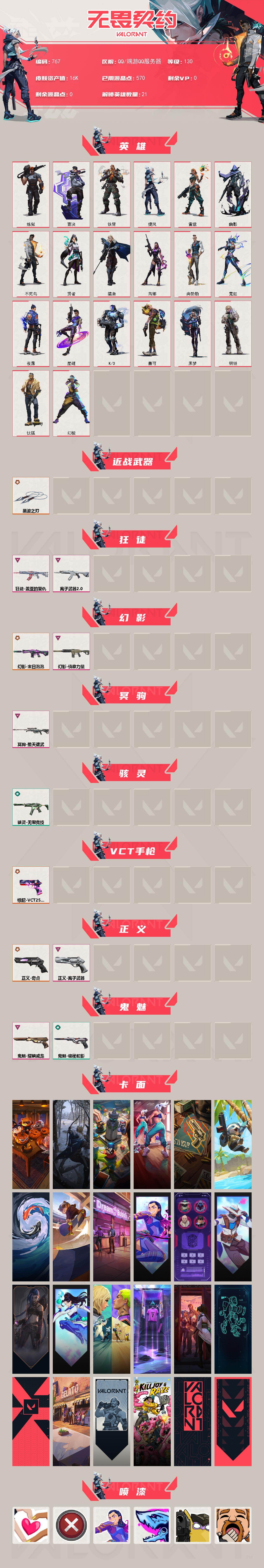 [15347640]【英雄】:幻棱,炼狱,钛狐,壹决,铁臂,捷风,雷兹,幽影,不死鸟,贤者,猎枭,芮娜,尚勃勒,霓虹,夜露,星礈,K/O,盖可,黑梦,钢锁 【近战武器】:近战武器-黑波之刃 【狂徒】:狂徒-盖亚的复仇,狂徒-离子武器//2.0 【幻影】:幻影-末日泡泡,幻影-侦察力量 【冥驹】:冥驹-堕天遗武 【骇灵】:骇灵-无限竞技 【VCT手枪】:标配-VCT25 x PRX 【正义】:正义-奇点,正义-离子武器 【鬼魅】:鬼魅-耀鳞威龙,鬼魅-诡秘蛇影 【卡面】:南瓜盛典 卡面,钢弓与箭弦 卡面,战术桌游 卡面,热舞环节 卡面,正义的化身 卡面,树懒大作战 卡面,红鳞松叶 卡面,Clutch 卡面,梦幻奶茶 卡面,无畏契约GO!第一卷:芮娜 卡面,清除名单 卡面,无畏契约GO!第一卷:零 卡面,《双城之战》金克丝 卡面,无畏契约GO!第一卷:贤者 卡面,钢锁vs盖可 卡面,"Luie" 卡面,热烈欢迎 卡面,铁臂设计图 卡面,代号红色 卡面,冰淇淋店 卡面,新兵报到 卡面,友军火力 卡面,V契约 卡面,无畏契约 卡面 【喷漆】:双人比心 喷漆,买装还是存钱 喷漆,无畏契约GO!第一卷:芮娜 喷漆,暴走萝莉 喷漆,放下武器 喷漆,老铁困了 喷漆,口袋贤者 喷漆,胜利属于无畏契约 喷漆,GLHF 喷漆,无畏契约 喷漆 【挂饰】:鱼骨头 挂饰,第九季//第二幕 纪念币 挂饰,薰衣草之心 挂饰,天外飞客 挂饰,《双城之战》魄罗 挂饰,第七季//第三幕 纪念币 挂饰,幸运中国结 挂饰,第七季//第二幕 纪念币 挂饰,无畏契约 纪念币 挂饰