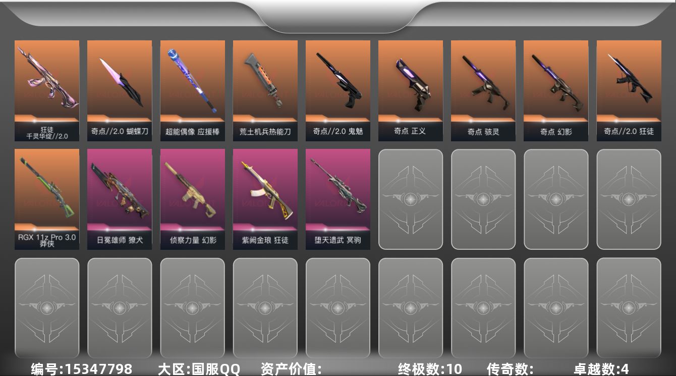 - [12134798]12橙皮 3紫皮 51皮肤 27英雄 85卡面 670已用源晶 铂金 优质装备:狂徒-混沌序曲,狂徒-紫阙金琅,狂徒-起源,鬼魅-天界神兵,戍卫-破败军械,镭切,神圣领域 战刀,未来开拓者,诡秘蛇影 套装:西部未来 佩枪皮肤:正义-西部未来,标配-VCT25xTS 步枪皮肤:幻影-西部未来 狙击枪皮肤:飞将-西部未来 机枪皮肤:奥丁-西部未来