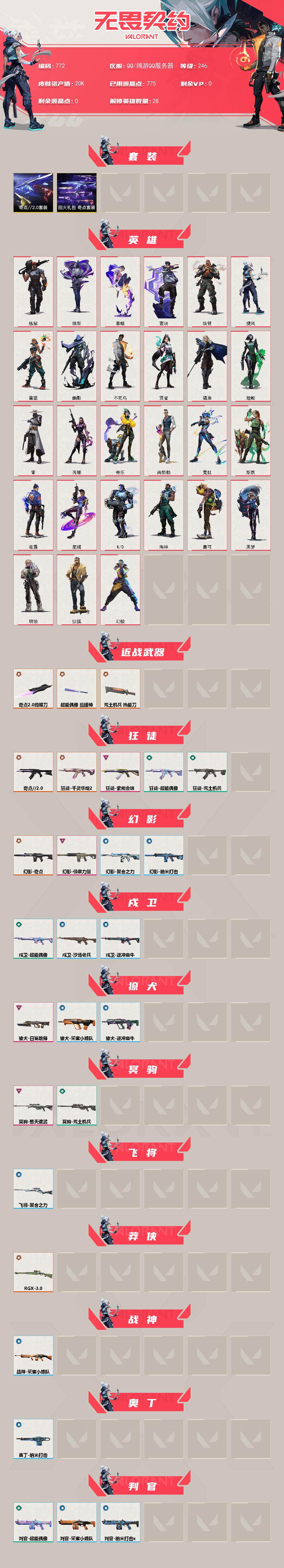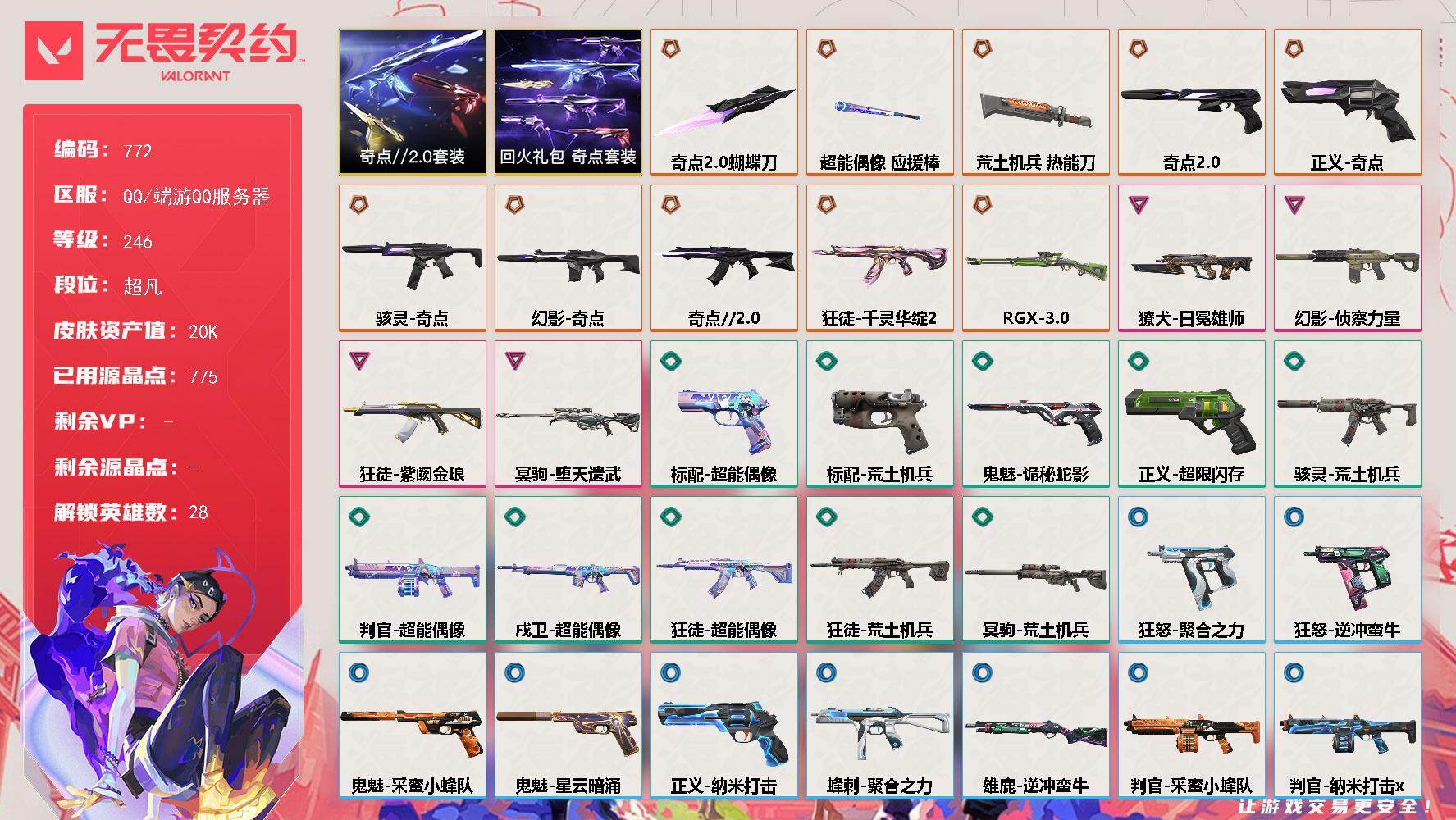 [15347798]【套装】:奇点//2.0套装,回火礼包:奇点套装 【英雄】:幻棱,炼狱,维斯,暮蝶,钛狐,壹决,铁臂,捷风,雷兹,幽影,不死鸟,贤者,猎枭,蝰蛇,零,芮娜,奇乐,尚勃勒,霓虹,斯凯,夜露,星礈,K/O,海神,盖可,黑梦,钢锁 【近战武器】:近战武器-奇点//2.0 蝴蝶刀,近战武器-超能偶像 应援棒,近战武器-荒土机兵 热能刀 【狂徒】:狂徒-奇点//2.0,狂徒-千灵华绽//2.0,狂徒-紫阙金琅,狂徒-超能偶像,狂徒-荒土机兵 【幻影】:幻影-奇点,幻影-侦察力量,幻影-聚合之力,幻影-纳米打击 【戍卫】:戍卫-超能偶像,戍卫-逆冲蛮牛,戍卫-沙场老兵 【獠犬】:獠犬-日冕雄师,獠犬-采蜜小蜂队,獠犬-逆冲蛮牛 【冥驹】:冥驹-堕天遗武,冥驹-荒土机兵 【飞将】:飞将-聚合之力 【莽侠】:莽侠-RGX 11z Pro//3.0 【战神】:战神-采蜜小蜂队 【奥丁】:奥丁-纳米打击 【判官】:判官-超能偶像,判官-采蜜小蜂队,判官-纳米打击x 【雄鹿】:雄鹿-逆冲蛮牛 【骇灵】:骇灵-奇点,骇灵-荒土机兵 【蜂刺】:蜂刺-聚合之力 【标配】:标配-超能偶像,标配-荒土机兵 【正义】:正义-奇点,正义-超限闪存,正义-纳米打击 【鬼魅】:鬼魅-奇点//2.0,鬼魅-诡秘蛇影,鬼魅-采蜜小蜂队,鬼魅-星云暗涌 【狂怒】:狂怒-聚合之力,狂怒-逆冲蛮牛 【卡面】:终章:激斗汉堡 卡面,进入射程 卡面,分崩离析 卡面,纳米打击 卡面,抑制技术 卡面,激斗汉堡 卡面,瓦娃脸雪糕 P2 卡面,从黄昏到黎明 卡面,荒土机兵 卡面,银弹猎手 卡面,逆冲蛮牛 卡面,《双城之战》拥抱 卡面,精灵大战 卡面,欢迎来到底城 卡面,南瓜盛典 卡面,奇点//2.0 卡面,修车达人 卡面,正义的化身 卡面,终章:生意人麦宝 卡面,铁之华 卡面,失而复得 卡面,时间到 卡面,最高舞台 卡面,复活专家 卡面,归乡 // 蝰蛇 卡面,超能偶像 卡面,生意人麦宝 卡面,声感陷阱设计图 卡面,钢锁工牌 卡面,战术小伙伴的夏日 卡面,采蜜小蜂队 卡面,聚合之力 卡面,梦幻奶茶 卡面,哨卫者之领域 卡面,源能反应 卡面,零点嗅探设计图 卡面,脚踝终结者 卡面 ,无畏契约GO!第一卷:零 卡面,《双城之战》金克丝 卡面,光导纤维 卡面,钢轨卫士 卡面,势不可挡//K/O 卡面,代号红色 卡面,新兵报到 卡面