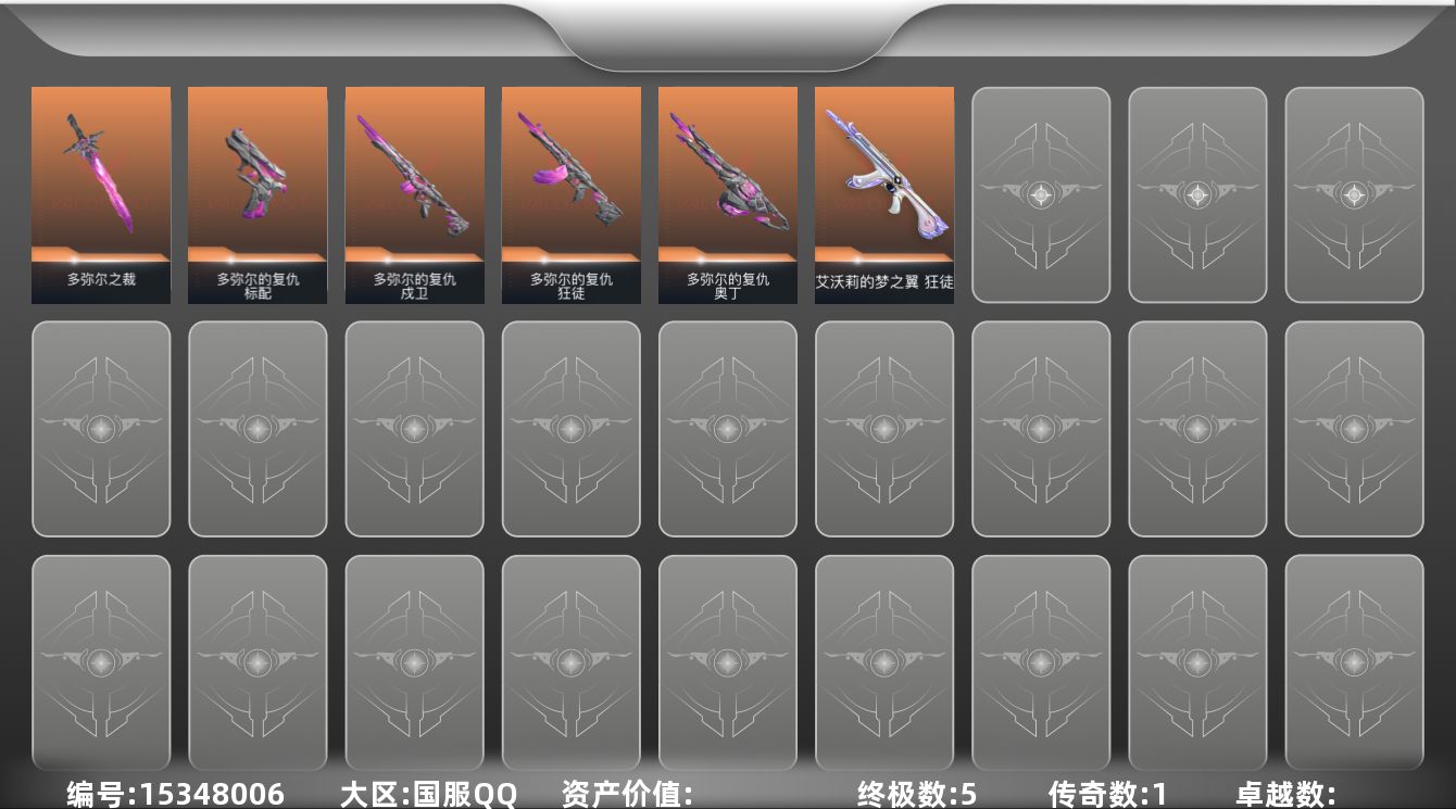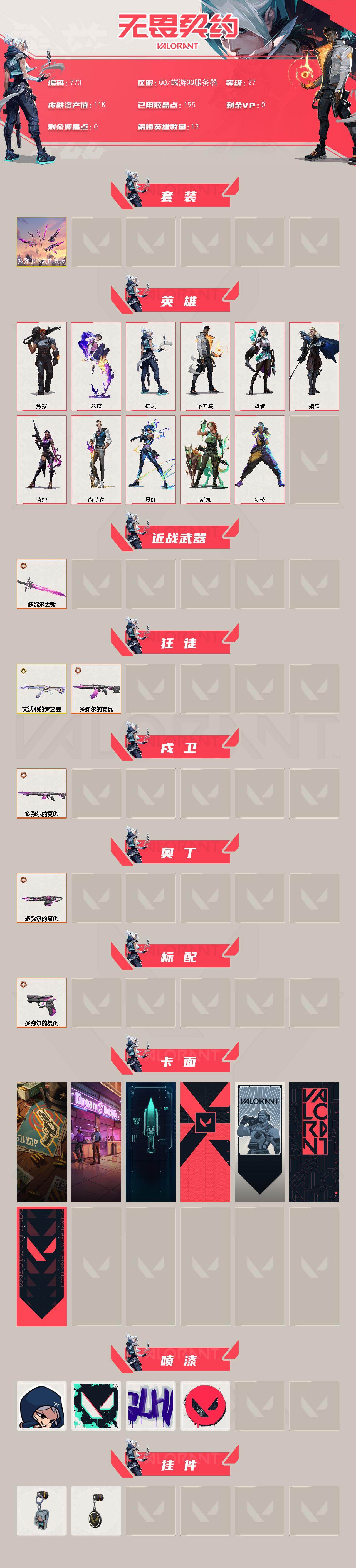 [15348006]【套装】:多弥尔的复仇套装 【英雄】:幻棱,炼狱,暮蝶,捷风,不死鸟,贤者,猎枭,芮娜,尚勃勒,霓虹,斯凯 【近战武器】:近战武器-多弥尔之裁 【狂徒】:狂徒-艾沃莉的梦之翼,狂徒-多弥尔的复仇 【戍卫】:戍卫-多弥尔的复仇 【奥丁】:奥丁-多弥尔的复仇 【标配】:标配-多弥尔的复仇 【卡面】:正义的化身 卡面,梦幻奶茶 卡面,零点嗅探设计图 卡面,代号红色 卡面,新兵报到 卡面,V契约 卡面,无畏契约 卡面 【喷漆】:捷风差距 喷漆,胜利属于无畏契约 喷漆,GLHF 喷漆,无畏契约 喷漆 【挂饰】:袖珍捷风 挂饰,无畏契约 纪念币 挂饰