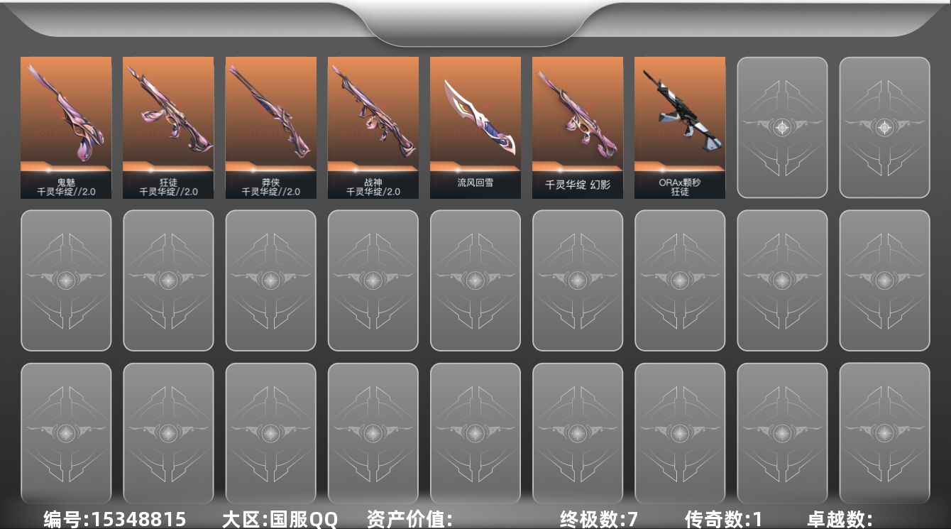 [15348815]【套装】:千灵华绽//2.0套装 【英雄】:炼狱,暮蝶,壹决,捷风,幽影,不死鸟,贤者,猎枭,芮娜,尚勃勒 【近战武器】:近战武器-流风回雪 【狂徒】:狂徒-ORA x 颗秒,狂徒-千灵华绽//2.0 【幻影】:幻影-千灵华绽 【莽侠】:莽侠-千灵华绽//2.0 【战神】:战神-千灵华绽//2.0 【鬼魅】:鬼魅-千灵华绽//2.0 【卡面】:零点嗅探设计图 卡面,无畏契约GO!第一卷:零 卡面,代号红色 卡面,冰淇淋店 卡面,新兵报到 卡面,V契约 卡面,无畏契约 卡面 【喷漆】:新潮流 喷漆,买装还是存钱 喷漆,胜利属于无畏契约 喷漆,GLHF 喷漆,无畏契约 喷漆 【挂饰】:天外飞客 挂饰,第七季//第二幕 纪念币 挂饰,无畏契约 纪念币 挂饰
