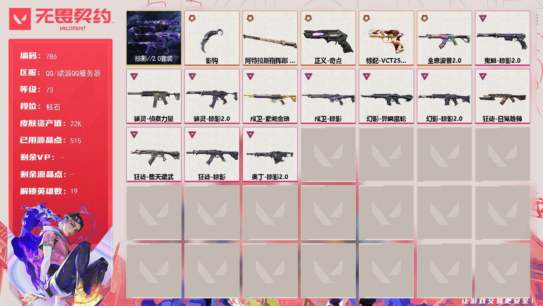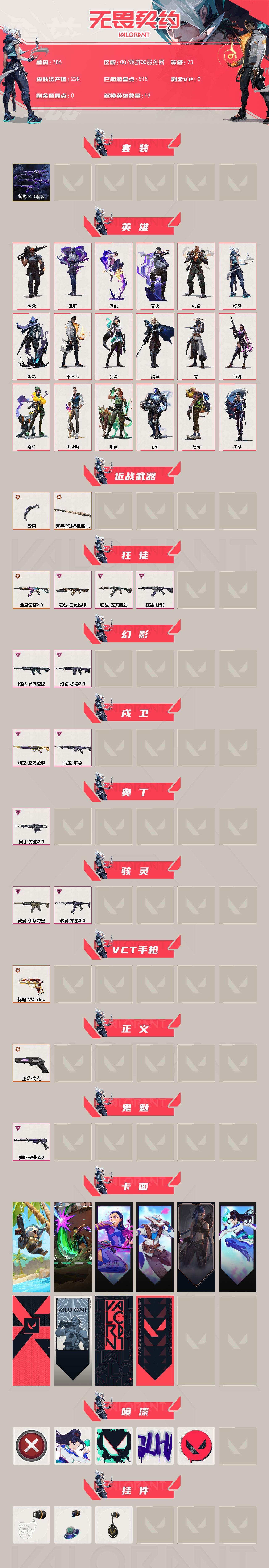 [15348946]【套装】:掠影//2.0套装 【英雄】:炼狱,维斯,暮蝶,壹决,铁臂,捷风,幽影,不死鸟,贤者,猎枭,零,芮娜,奇乐,尚勃勒,斯凯,K/O,盖可,黑梦 【近战武器】:近战武器-影钩,近战武器-阿特拉斯指挥部 甩棍 【狂徒】:狂徒-全息波普//2.0,狂徒-堕天遗武,狂徒-掠影,狂徒-日冕雄师 【幻影】:幻影-异鳞魔蛇,幻影-掠影//2.0 【戍卫】:戍卫-掠影,戍卫-紫阙金琅 【奥丁】:奥丁-掠影//2.0 【骇灵】:骇灵-侦察力量,骇灵-掠影//2.0 【VCT手枪】:标配-VCT25 x EDG 【正义】:正义-奇点 【鬼魅】:鬼魅-掠影//2.0 【卡面】:树懒大作战 卡面,源能反应 卡面,无畏契约GO!第一卷:芮娜 卡面,无畏契约GO!第一卷:零 卡面,《双城之战》金克丝 卡面,无畏契约GO!第一卷:贤者 卡面,代号红色 卡面,新兵报到 卡面,V契约 卡面,无畏契约 卡面 【喷漆】:买装还是存钱 喷漆,无畏契约GO!第一卷:贤者 喷漆,胜利属于无畏契约 喷漆,GLHF 喷漆,无畏契约 喷漆 【挂饰】:VCT x EDG 挂饰,天外飞客 挂饰,无畏契约 纪念币 挂饰