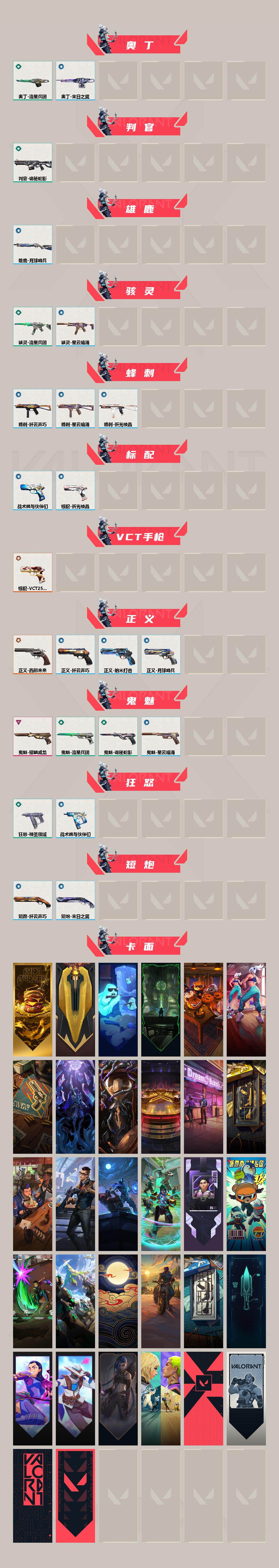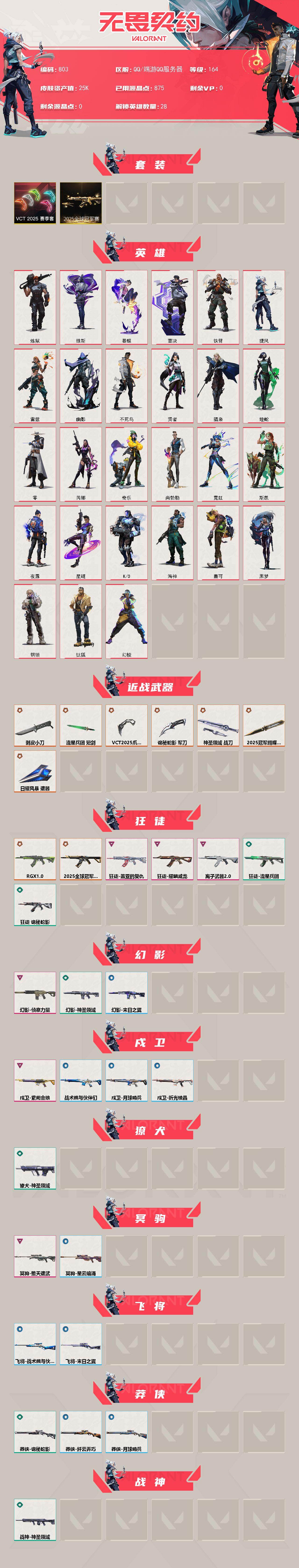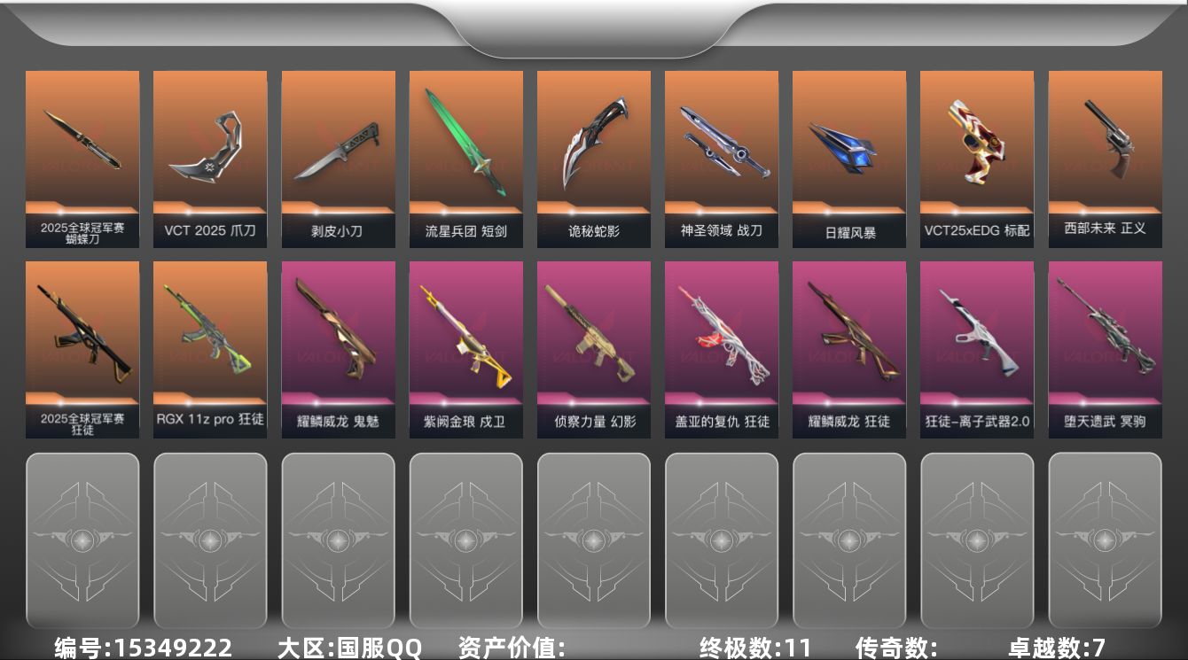 [15349222]【套装】:2025全球冠军赛套装,VCT 2025 赛季套装 【英雄】:幻棱,炼狱,维斯,暮蝶,钛狐,壹决,铁臂,捷风,雷兹,幽影,不死鸟,贤者,猎枭,蝰蛇,零,芮娜,奇乐,尚勃勒,霓虹,斯凯,夜露,星礈,K/O,海神,盖可,黑梦,钢锁 【近战武器】:近战武器-2025全球冠军赛 蝴蝶刀,近战武器-剥皮小刀,近战武器-VCT 2025 爪刀,近战武器-流星兵团 短剑,近战武器-诡秘蛇影 军刀,近战武器-神圣领域 战刀,近战武器-日耀风暴 遗器 【狂徒】:狂徒-2025全球冠军赛,狂徒-RGX 11z Pro,狂徒-盖亚的复仇,狂徒-耀鳞威龙,狂徒-离子武器//2.0,狂徒-流星兵团,狂徒-诡秘蛇影 【幻影】:幻影-侦察力量,幻影-神圣领域,幻影-末日之翼 【戍卫】:戍卫-紫阙金琅,戍卫-战术熊与伙伴们,戍卫-月球哨兵,戍卫-折光棱晶 【獠犬】:獠犬-神圣领域 【冥驹】:冥驹-堕天遗武,冥驹-星云暗涌 【飞将】:飞将-战术熊与伙伴们,飞将-末日之翼 【莽侠】:莽侠-诡秘蛇影,莽侠-纤云弄巧,莽侠-月球哨兵 【战神】:战神-神圣领域 【奥丁】:奥丁-流星兵团,奥丁-末日之翼 【判官】:判官-诡秘蛇影 【雄鹿】:雄鹿-月球哨兵 【骇灵】:骇灵-流星兵团,骇灵-星云暗涌 【蜂刺】:蜂刺-纤云弄巧,蜂刺-星云暗涌,蜂刺-折光棱晶 【标配】:标配-战术熊与伙伴们,标配-折光棱晶 【VCT手枪】:标配-VCT25 x EDG 【正义】:正义-西部未来,正义-纳米打击,正义-纤云弄巧,正义-月球哨兵 【鬼魅】:鬼魅-耀鳞威龙,鬼魅-流星兵团,鬼魅-诡秘蛇影,鬼魅-星云暗涌 【狂怒】:狂怒-神圣领域,狂怒-战术熊与伙伴们 【短炮】:短炮-纤云弄巧,短炮-末日之翼 【卡面】:终章:激斗汉堡 卡面,进入射程 卡面,精灵大战 卡面,欢迎来到底城 卡面,南瓜盛典 卡面,热舞环节 卡面,正义的化身 卡面,失而复得 卡面,时间到 卡面,最高舞台 卡面,梦幻奶茶 卡面,终章:打造专属狂徒 卡面,趁热吃 卡面,西装暴徒 卡面,失控边缘 卡面,哨卫者之领域 卡面,暮蝶工牌 卡面,战术熊与伙伴们 卡面,源能反应 卡面,流星兵团 卡面,纤云弄巧 卡面,暂别喧嚣 卡面,打造专属狂徒 卡面,零点嗅探设计图 卡面,无畏契约GO!第一卷:芮娜 卡面,无畏契约GO!第一卷:零 卡面,《双城之战》金克丝 卡面,钢锁