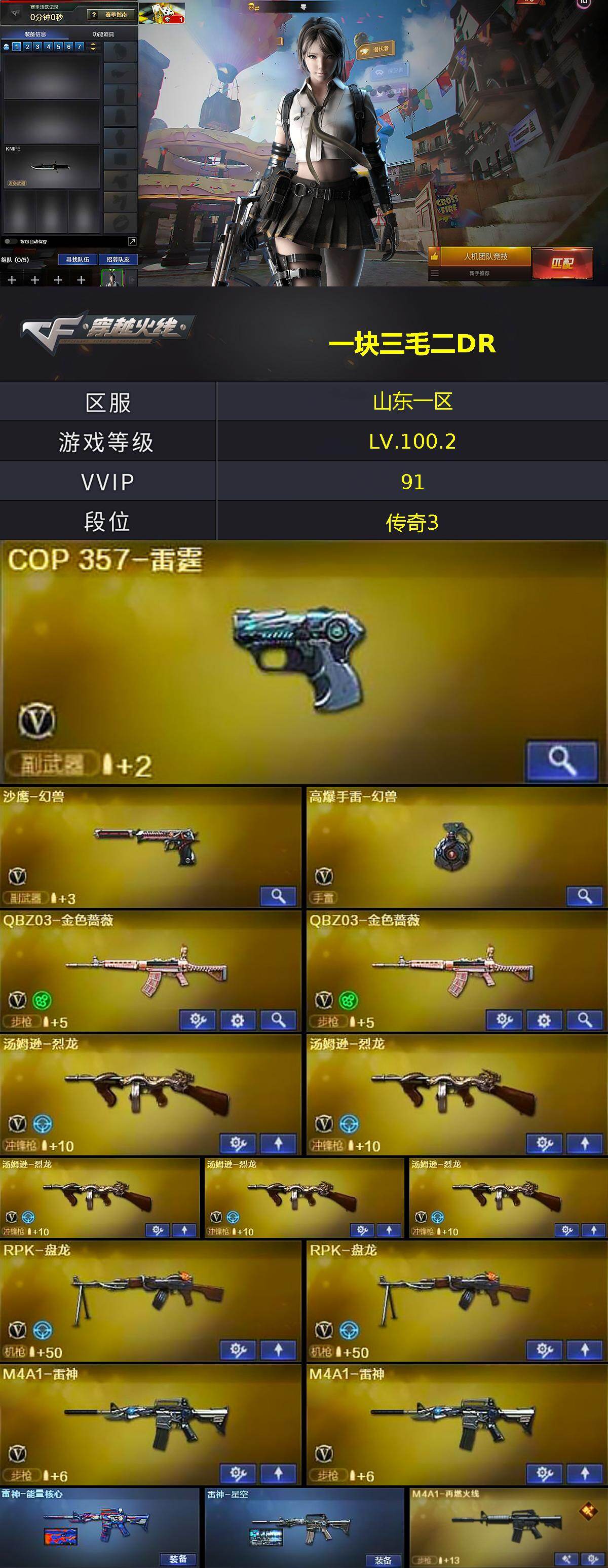 [15349909]山东一区-90V-1王者-3炫金 【热门武器】:QBZ03-金色蔷薇*2,死亡之眼,M4A1-黑骑士,汤姆逊-烈龙*5,RPK-盘龙*2,加特林-炼狱*3,沙鹰-修罗*3,高爆手雷-幻兽 【王者炫金武器】:炫金毁灭*2,炫金天龙 【音效卡】:Barrett-毁灭音效卡 【皮肤】:雷神-能量核心,雷神-星空,M4A1-再燃火线,毁灭-荣耀之怒,毁灭耀金皮肤,黑龙-能量核心,黑龙-暗月,黑骑士-暗月,无影-能量核心*2,天启-暗月,天龙-秘银,天龙-能量核心,极光-能量核心,修罗-能量核心,修罗-星空,轻型军用手斧-再燃火线 【角色】:零,葵,樱,瞳,魅影,炫,审判者,堕落女神,乔伊教练,修道士,空,风暴女,兰-海滩派对,零-水下丽影,灵狐者-黄金海岸,潘多拉-甜心教官,影武者-X 【人偶武器】:M37-葵*2,COP-旗袍,M4A1-刀锋,迷你裂空之翼 【暴走生化】:死亡之眼,超级对讲机 【挑战大师】:激光毁灭者III 【英雄级武器】:M4A1-千变,AK47-火麒麟*3,M4A1-黑龙,M4A1-雷神*2,M4A1-黑骑士,AK47-无影*2,M4A1-死神,AK12-天启,AN94-超新星*2,AK47-机械迷城,M4A1-雷霆,M4A1-玫瑰精灵,QBZ03-金色蔷薇*2,M4A1-猎神,AWM-天龙*3,Barrett-毁灭*2,Barrett-极光*4,Barrett-金色蔷薇,王者之怒-觉醒版,RPK-盘龙*2,加特林-炼狱*3,汤姆逊-烈龙*5,沙鹰-修罗*3,沙鹰-天神,COP-雷霆,沙鹰-幻兽,屠龙*3,龙啸*2,擎天,麒麟刺,女皇利刃-幻兽,高爆手雷-雷霆*7,高爆手雷-幻兽,闪光弹-雷霆*7,闪光弹-幻兽,烟雾弹-雷霆*7,烟雾弹-幻兽,M4A1-赤狱骑士 【道具】:战舰背包,炫彩背包,背包-洛丽塔,超级背包*2,女皇终结者-魔龙之吻,救世主-黑桃战神,绿色巨人,灵魂忍者,变异宝贝,迷雾幽灵,夺命之镰,防化服*3,流光-鎏金之域,流光-再燃火线,枪王排位29赛季金色流光,C4-红龙,防弹头盔*3,防弹衣*3,C4工具钳*3,手雷包*3 【特殊枪械】:1黑骑士,5烈龙,2盘龙,3炼狱