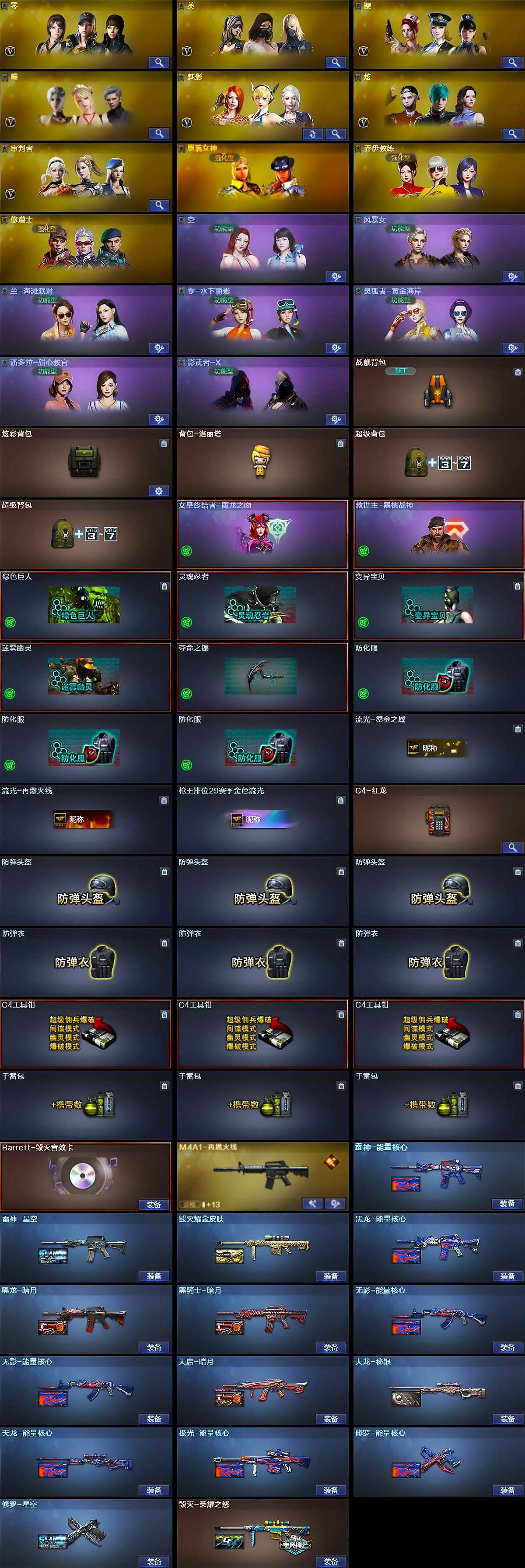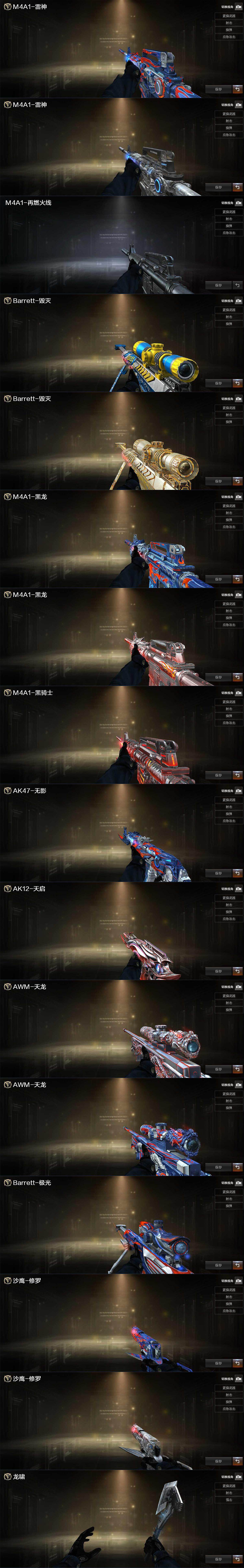【英雄级武器】:M4A1-千变,AK47-火麒麟*3,M4A1-黑龙,M4A1-雷神*2,M4A1-黑骑士,AK47-无影*2,M4A1-死神,AK12-天启,AN94-超新星*2,AK47-机械迷城,M4A1-雷霆,M4A1-玫瑰精灵,QBZ03-金色蔷薇*2,M4A1-猎神,AWM-天龙*3,Barrett-毁灭*2,Barrett-极光*4,Barrett-金色蔷薇,王者之怒-觉醒版,RPK-盘龙*2,加特林-炼狱*3,汤姆逊-烈龙*5,沙鹰-修罗*3,沙鹰-天神,COP-雷霆,沙鹰-幻兽,屠龙*3,龙啸*2,擎天,麒麟刺,女皇利刃-幻兽,高爆手雷-雷霆*7,高爆手雷-幻兽,闪光弹-雷霆*7,闪光弹-幻兽,烟雾弹-雷霆*7,烟雾弹-幻兽,M4A1-赤狱骑士