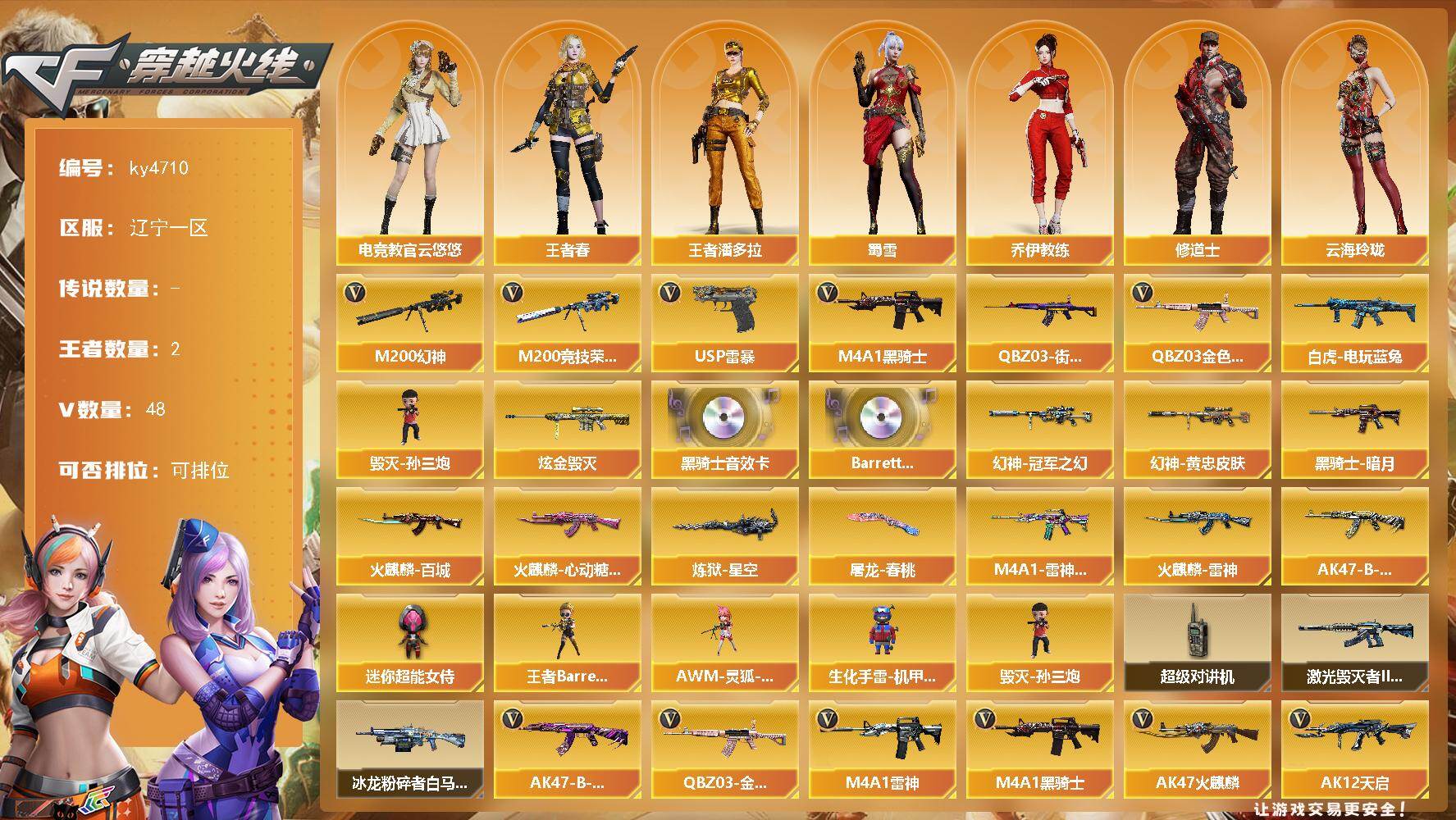 [15350222]辽宁一区-48V-2王者-1炫金 【热门武器】:QBZ03-金色蔷薇,M200-幻神*2,M200-竞技荣光,白虎-电玩蓝兔,QBZ03-街机,M4A1-黑骑士,毁灭-孙三炮,USP-雷暴 【王者炫金武器】:炫金毁灭 【音效卡】:M4A1-黑骑士音效卡,Barrett-碧霄极光音效卡 【皮肤】:M200-幻神-黄忠皮肤,幻神-冠军之幻,M4A1-雷神-巅峰荣耀皮肤,火麒麟-雷神,火麒麟-百城,火麒麟-心动糖果,黑骑士-暗月,AK47-B-常胜将军-刘备,炼狱-星空,屠龙-春桃 皮肤 【角色】:电竞教官-云悠悠,王者春,王者潘多拉,乔伊教练,修道士,云海玲珑,暗夜-X,风暴女,嘉年华灵狐,潘多拉-甜心教官,斯沃特-X,蜀雪,兔囡囡 【人偶武器】:毁灭-孙三炮,王者Barrett-英勇金戈,AWM-灵狐-15周年嘉年华,生化手雷-机甲核心,迷你超能女侍 【暴走生化】:超级对讲机 【挑战大师】:冰龙粉碎者-白马银枪,激光毁灭者III-白马银枪 【英雄级武器】:AK47-火麒麟,M4A1-雷神,M4A1-黑骑士,AK12-天启,QBZ03-金色蔷薇,超新星-悦享-觉醒版,AK47-B-常胜将军,白虎-电玩蓝兔,M200-幻神*2,M200-竞技荣光,王者风神-觉醒版,USP-雷暴,柯尔特-竞技荣光*2,麒麟刺-堕天神,幻灵之锋*2,擎天-竞技荣光*2,高爆手雷-堕天神*2,高爆手雷-幻灵,高爆手雷-竞技荣光*7,闪光弹-堕天神,闪光弹-竞技荣光*7,烟雾弹-堕天神,烟雾弹-竞技荣光*7,M4A1-赤狱骑士,Barrett-碧霄极光 【道具】:BS战队炫彩背包,云山科技背包,云海游龙炫彩背包,亚洲杯纪念炫彩背包,女皇终结者-背包,炫彩背包,女皇终结者-魔龙之吻,救世主-黑桃战神,绿色巨人,灵魂忍者,迷雾幽灵,夺命之镰,防化服*3,金色流光-枪王排位*2,星辰流光-枪王排位,流光-鎏金之域,枪王排位28赛季金色流光,枪王排位29赛季金色流光,电玩兔兔表情,EP战队名片,防弹头盔*3,防弹衣*3,C4工具钳*3,手雷包*3 【特殊枪械】:1黑骑士