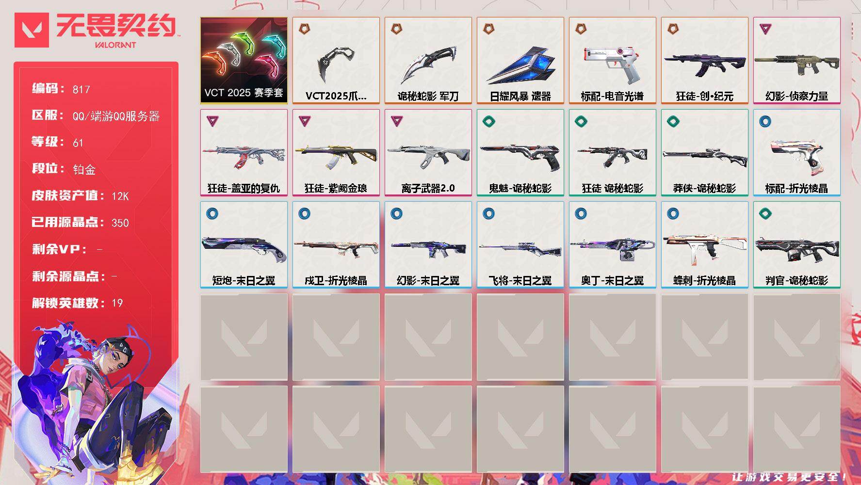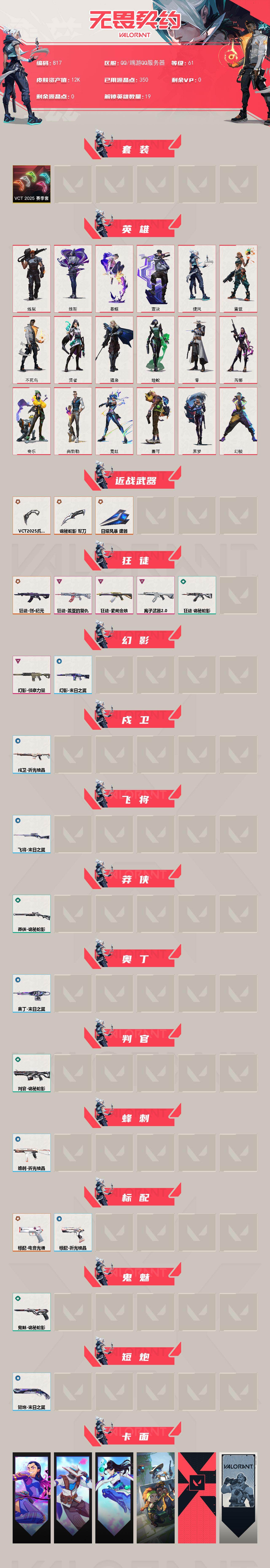 [15350850]【套装】:VCT 2025 赛季套装 【英雄】:幻棱,炼狱,维斯,暮蝶,壹决,捷风,雷兹,不死鸟,贤者,猎枭,蝰蛇,零,芮娜,奇乐,尚勃勒,霓虹,盖可,黑梦 【近战武器】:近战武器-VCT 2025 爪刀,近战武器-诡秘蛇影 军刀,近战武器-日耀风暴 遗器 【狂徒】:狂徒-创·纪元,狂徒-盖亚的复仇,狂徒-紫阙金琅,狂徒-离子武器//2.0,狂徒-诡秘蛇影 【幻影】:幻影-侦察力量,幻影-末日之翼 【戍卫】:戍卫-折光棱晶 【飞将】:飞将-末日之翼 【莽侠】:莽侠-诡秘蛇影 【奥丁】:奥丁-末日之翼 【判官】:判官-诡秘蛇影 【蜂刺】:蜂刺-折光棱晶 【标配】:标配-电音光谱,标配-折光棱晶,标配-电音光谱 【鬼魅】:鬼魅-诡秘蛇影 【短炮】:短炮-末日之翼 【卡面】:无畏契约GO!第一卷:芮娜 卡面,无畏契约GO!第一卷:零 卡面,无畏契约GO!第一卷:贤者 卡面,别冒尖 卡面,代号红色 卡面,新兵报到 卡面,V契约 卡面,无畏契约 卡面 【喷漆】:买装还是存钱 喷漆,红鳞 喷漆,无畏契约GO!第一卷:零 喷漆,无畏契约GO!第一卷:贤者 喷漆,胜利属于无畏契约 喷漆,GLHF 喷漆,无畏契约 喷漆 【挂饰】:薰衣草之心 挂饰,Z世代特饮 挂饰,天外飞客 挂饰,《双城之战》魄罗 挂饰,无畏契约 纪念币 挂饰