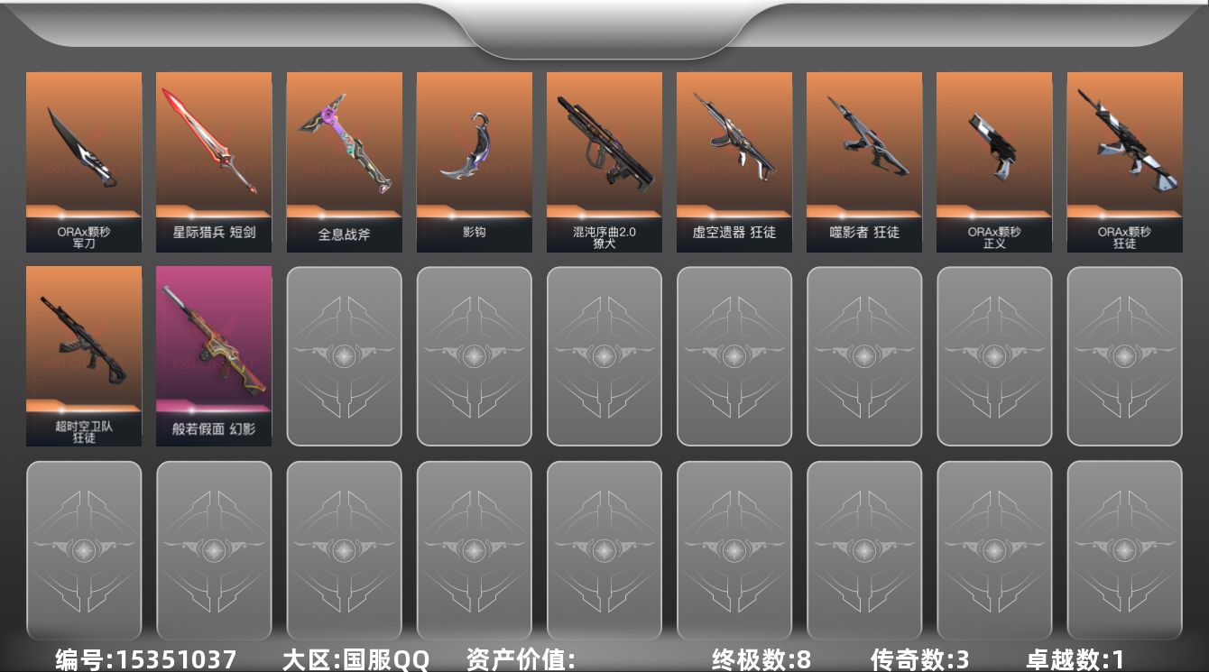 [15351037]【英雄】:幻棱,炼狱,维斯,暮蝶,壹决,铁臂,捷风,雷兹,幽影,不死鸟,贤者,猎枭,蝰蛇,零,芮娜,奇乐,尚勃勒,霓虹,斯凯,夜露,星礈,K/O,盖可,黑梦,钢锁 【近战武器】:近战武器-ORA x 颗秒 军刀,近战武器-影钩,近战武器-全息战斧,近战武器-星际猎兵 短剑 【狂徒】:狂徒-超时空卫队,狂徒-虚空遗器,狂徒-噬影者,狂徒-ORA x 颗秒 【幻影】:幻影-般若假面 【獠犬】:獠犬-混沌序曲//2.0 【骇灵】:骇灵-无限竞技 【正义】:正义-ORA x 颗秒 【卡面】:无畏契约GO!第一卷:芮娜 卡面,无畏契约GO!第一卷:零 卡面,《双城之战》金克丝 卡面,代号红色 卡面,新兵报到 卡面,V契约 卡面,无畏契约 卡面 【喷漆】:霓光四射 喷漆,买装还是存钱 喷漆,酷熊冲浪 喷漆,胜利属于无畏契约 喷漆,GLHF 喷漆,无畏契约 喷漆 【挂饰】:无畏契约GO!第一卷 零 挂饰,薰衣草之心 挂饰,天外飞客 挂饰,红鳞松叶 挂饰,海豹的认可 挂饰,无畏契约 纪念币 挂饰