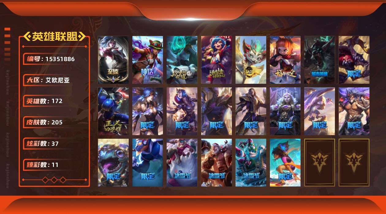 [15351886]【特价出售/店主推荐】黄金段位-172英雄-205皮肤-37炫彩-0终极-5神话-22限定-16传说-51史诗