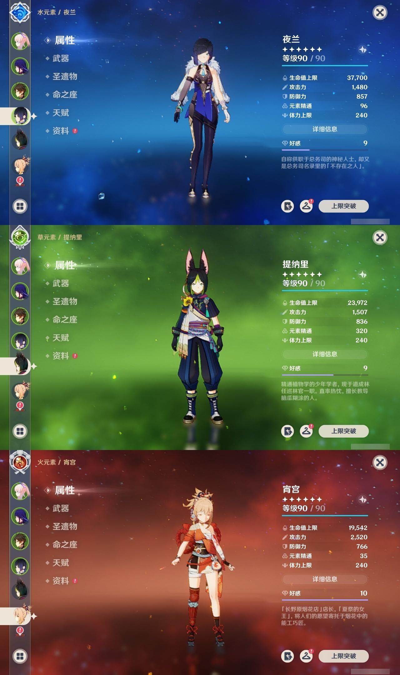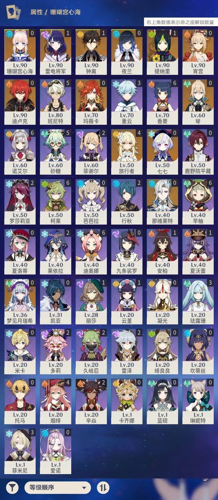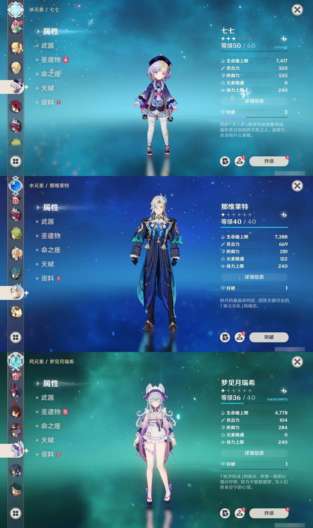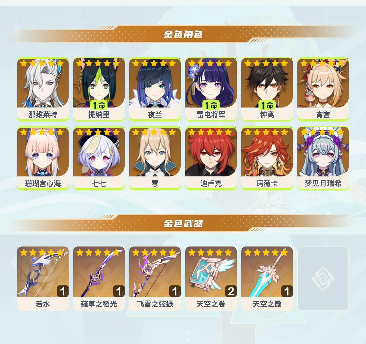 0命那维莱特,1命提纳里,0命夜兰,1命雷电将军,1命钟离,0命宵宫,0命珊瑚宫心海,0命七七,0命琴,0命迪卢克,0命玛薇卡,0命梦见月瑞希,精1若水,精1薙草之稻光,精1飞雷之弦振,精2天空之卷,精1天空之傲