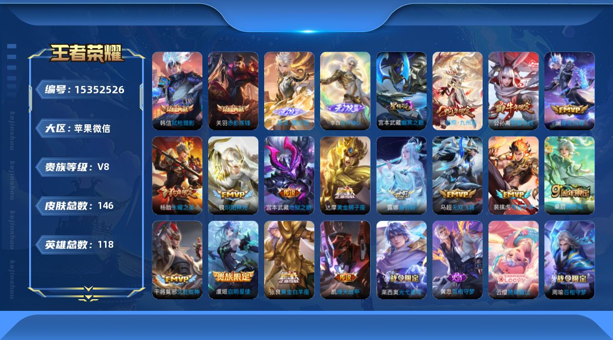 [15352526]苹果WX-V8-最强王者段位-118英雄-146皮肤-2典藏皮肤-2无双-15传说-39史诗-1星传说