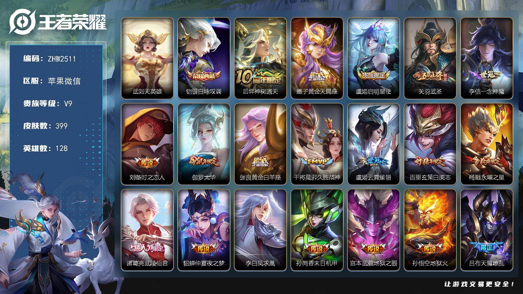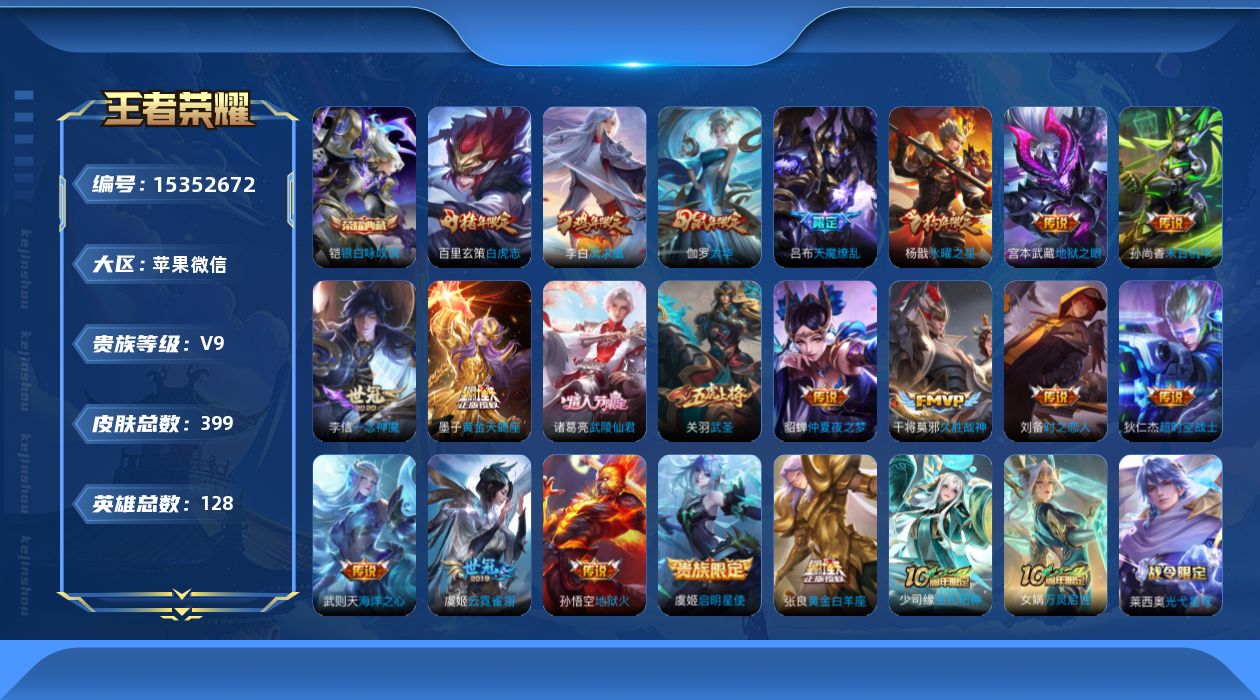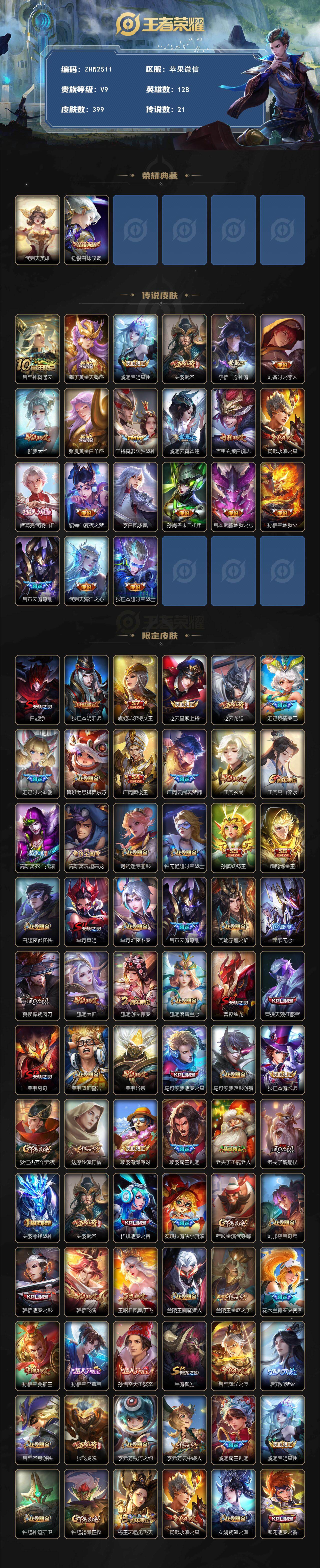 [15352672]苹果WX-V9-最强王者段位-128英雄-399皮肤-2典藏-21传说-132史诗-2星传