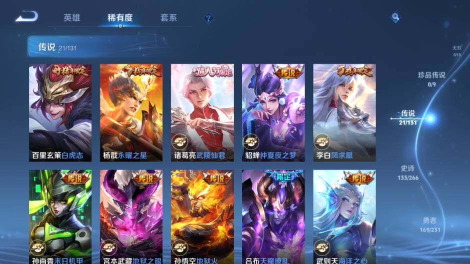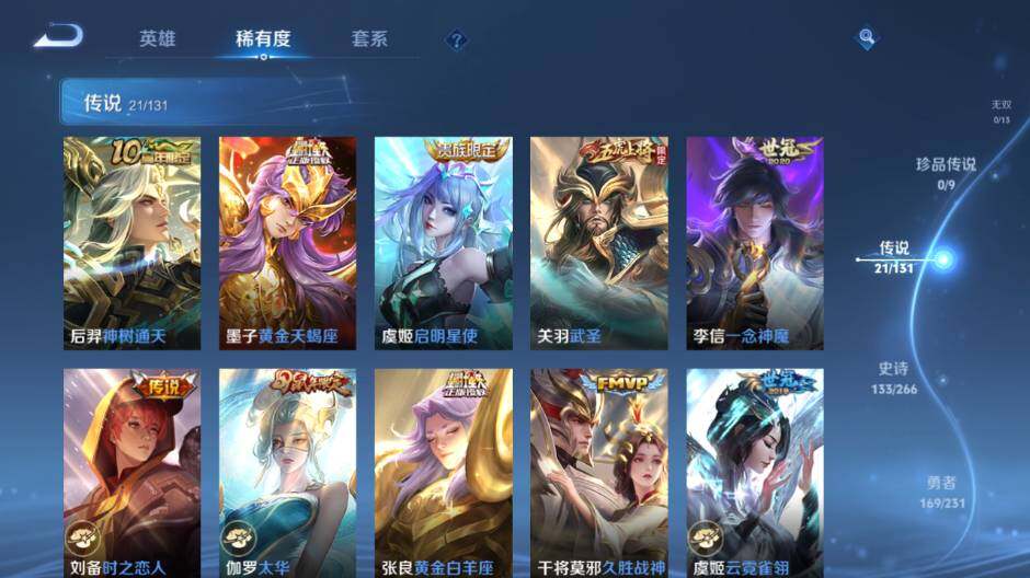 【传说皮肤】:后羿神树通天,墨子黄金天蝎座,虞姬启明星使,关羽武圣,李信一念神魔,刘备时之恋人,伽罗太华,张良黄金白羊座,干将莫邪久胜战神,虞姬云霓雀翎,百里玄策白虎志,杨戬永曜之星,诸葛亮武陵仙君,貂蝉仲夏夜之梦,李白凤求凰,孙尚香末日机甲,宫本武藏地狱之眼,孙悟空地狱火,吕布天魔缭乱,武则天海洋之心,狄仁杰超时空战士