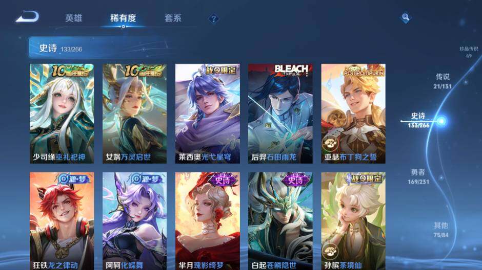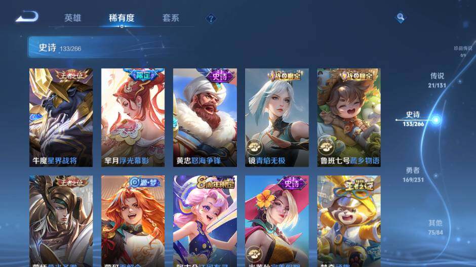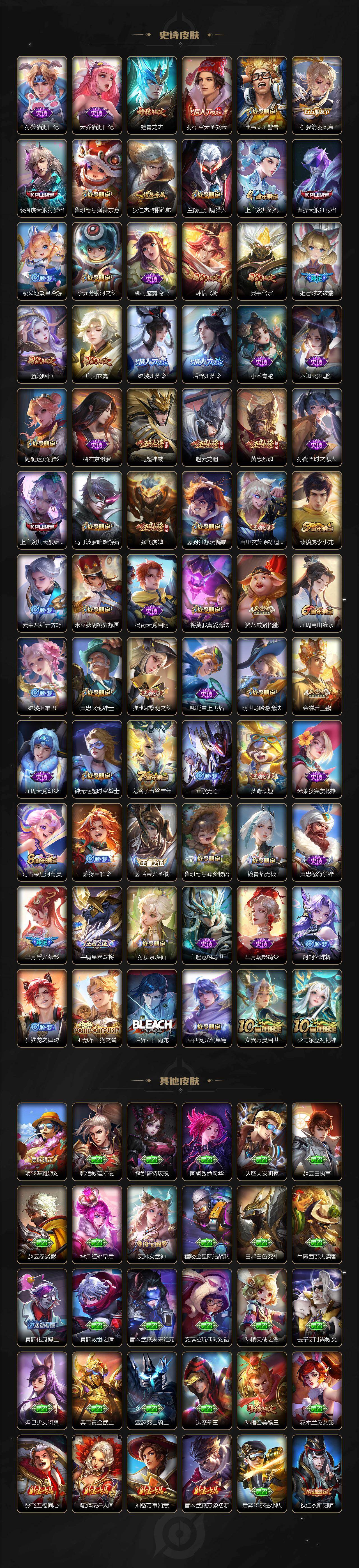关羽冰锋战神,裴擒虎李小龙,上官婉儿梁祝,貂蝉逐梦之音,赵云龙胆,关羽武圣,黄忠烈魂,张飞虎魄,马超神威,后羿辉光之辰,庄周玄嵩,典韦岱宗,甄姬幽恒,韩信飞衡,伽罗太华,曹操天狼征服者,裴擒虎天狼狩猎者,上官婉儿天狼绘梦者,哪吒逐梦之翼,马可波罗逐梦之星,韩信逐梦之影,铠青龙志,百里玄策白虎志,王昭君凤凰于飞,项羽霸王别姬,虞姬霸王别姬,孙悟空大圣娶亲,后羿如梦令,嫦娥如梦令,孙悟空至尊宝,裴擒虎梅西,雅典娜神奇女侠,妲己热情桑巴,花木兰青春决赛季,妲己时之彼端,公孙离蜜橘之夏,安琪拉魔法小厨娘,孙悟空美猴王,庄周云端筑梦师,猪八戒猪悟能,老夫子圣诞老人,金蝉唐三藏