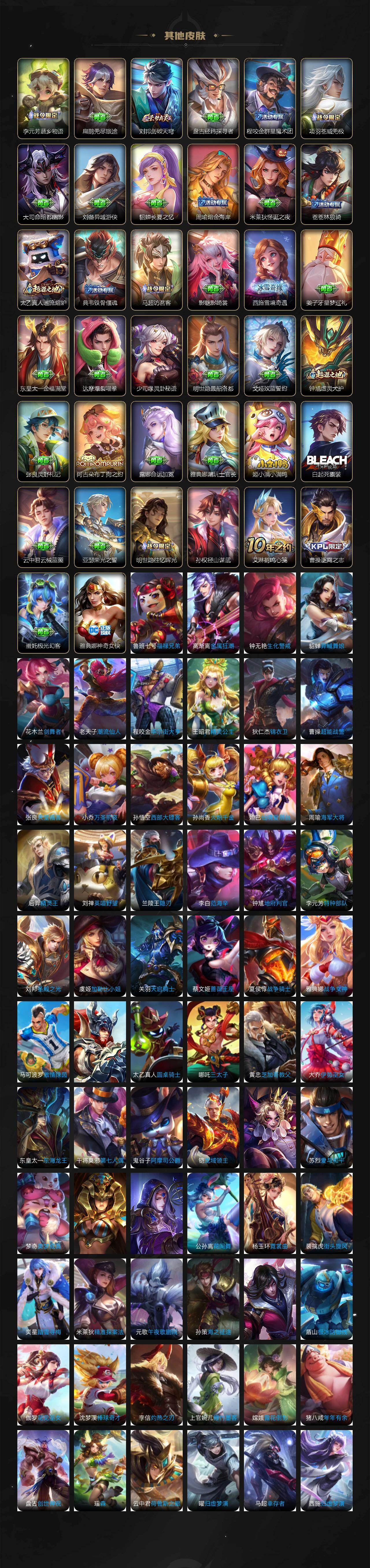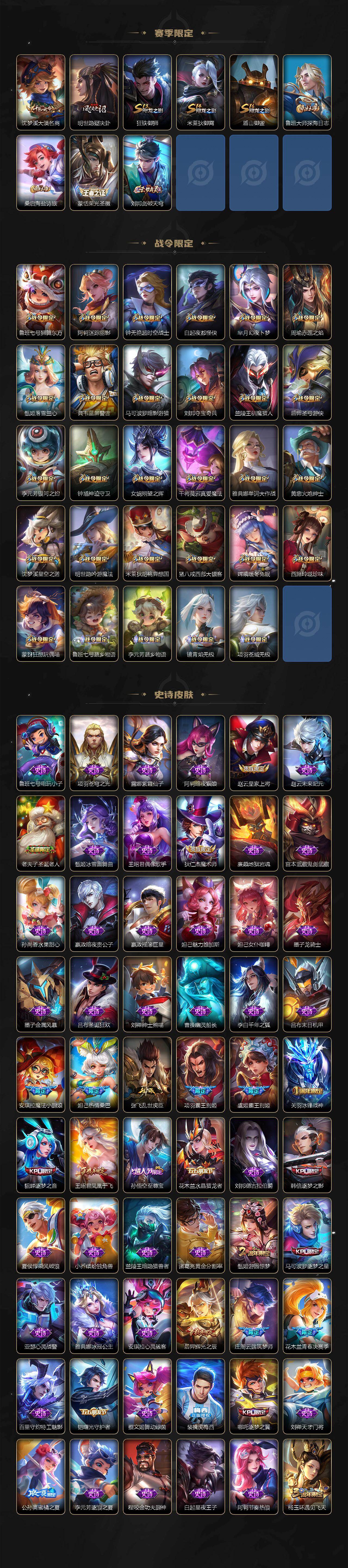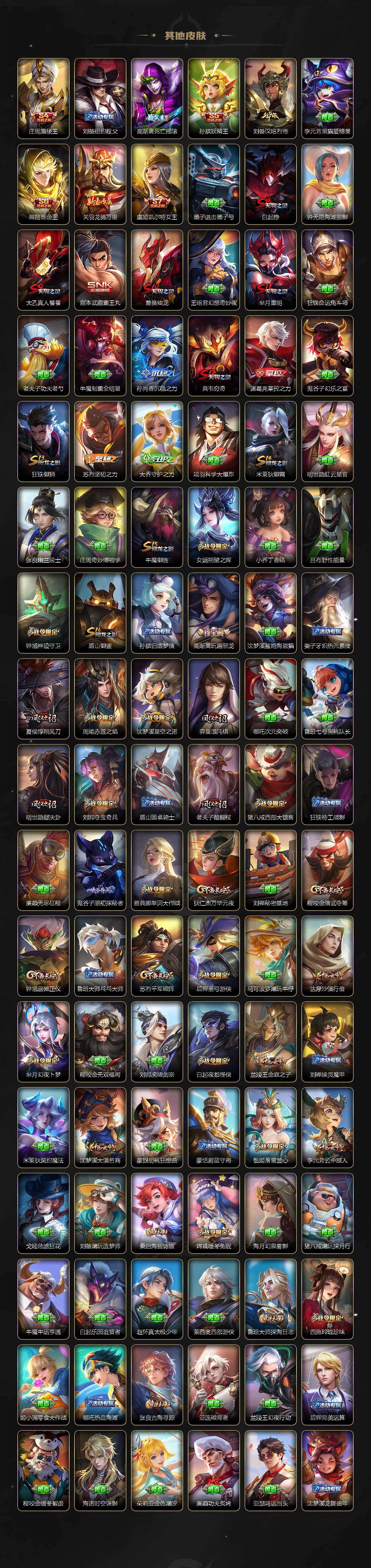 【限定皮肤】:白起狰,狄仁杰阴阳师,虞姬凯尔特女王,赵云皇家上将,赵云龙胆,妲己热情桑巴,妲己时之彼端,鲁班七号狮舞东方,庄周蜃楼王,庄周云端筑梦师,庄周玄嵩,庄周高山流水,高渐离死亡摇滚,高渐离玩趣恶龙,阿轲迷踪丽影,钟无艳超时空战士,孙膑妖精王,扁鹊炼金王,白起夜都怪侠,芈月重明,芈月幻夜卜梦,吕布天魔缭乱,周瑜赤莲之焰,元歌无心,夏侯惇朔风刀,甄姬幽恒,甄姬游园惊梦,甄姬落雪兰心,曹操烛龙,曹操天狼征服者,典韦穷奇,典韦蓝屏警告,典韦岱宗,马可波罗逐梦之星,马可波罗暗影游猎,狄仁杰魔术师,狄仁杰万华元夜,达摩沙漠行僧,项羽海滩派对,项羽霸王别姬,老夫子圣诞老人,老夫子醍醐杖,关羽冰锋战神,关羽武圣,貂蝉逐梦之音,安琪拉魔法小厨娘,程咬金演武夺筹,刘邦夺宝奇兵,韩信逐梦之影,韩信飞衡,王昭君凤凰于飞,兰陵王驯魔猎人,兰陵王金庭之子,花木兰青春决赛季,孙悟空美猴王,孙悟空至尊宝,孙悟空大圣娶亲,牛魔御旌,后羿辉光之辰,后羿如梦令,后羿圣弓游侠,张飞虎魄,李元芳银河之约,李元芳云中旅人,虞姬霸王别姬,虞姬启明星使,钟馗神迹守卫,钟馗驱傩正仪,杨玉环遇见飞天,杨戬永曜之星,女娲朔望之晖,哪吒逐梦之翼,干将莫邪真爱魔法,雅典娜单词大作战,雅典娜黎明之约,蔡文姬繁星吟游,太乙真人饕餮,鬼谷子原初探秘者,鬼谷子五谷丰年,诸葛亮武陵仙君,黄忠烈魂,黄忠火炮绅士,铠青龙志,苏烈千军破阵,百里玄策白虎志,百里玄策原初追逐者,弈星混沌棋,梦奇顽趣,公孙离蜜橘之夏,沈梦溪星空之诺,沈梦溪大漠名商,明世隐疑决卦,明世隐吟游魔法,裴擒虎天狼狩猎者,裴擒虎李小龙,狂铁御狮,米莱狄御霄,米莱狄胡桃异想国,云中君纤云弄巧,伽罗太华,盾山御銮,猪八戒