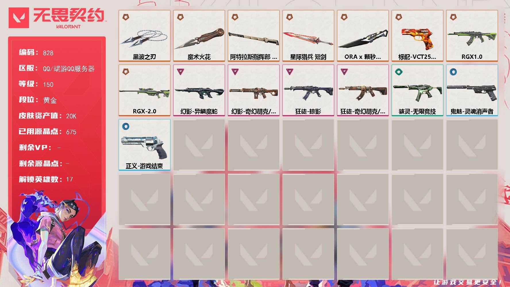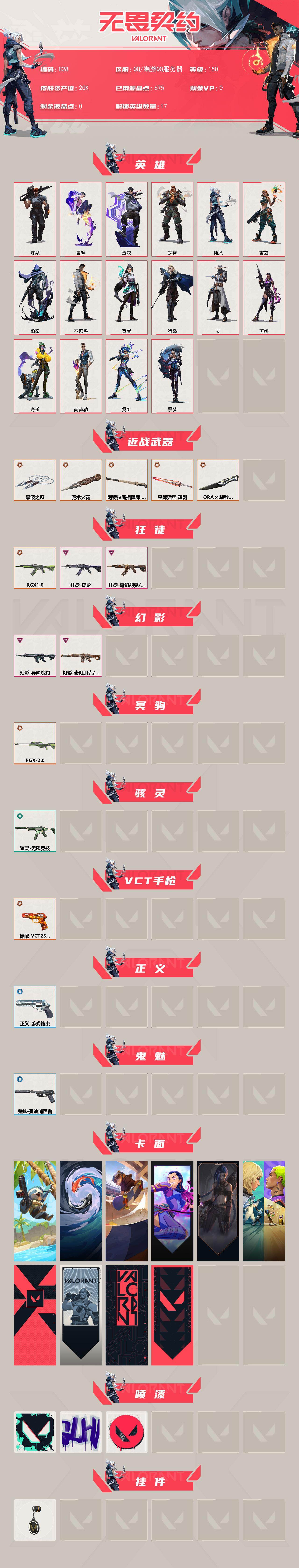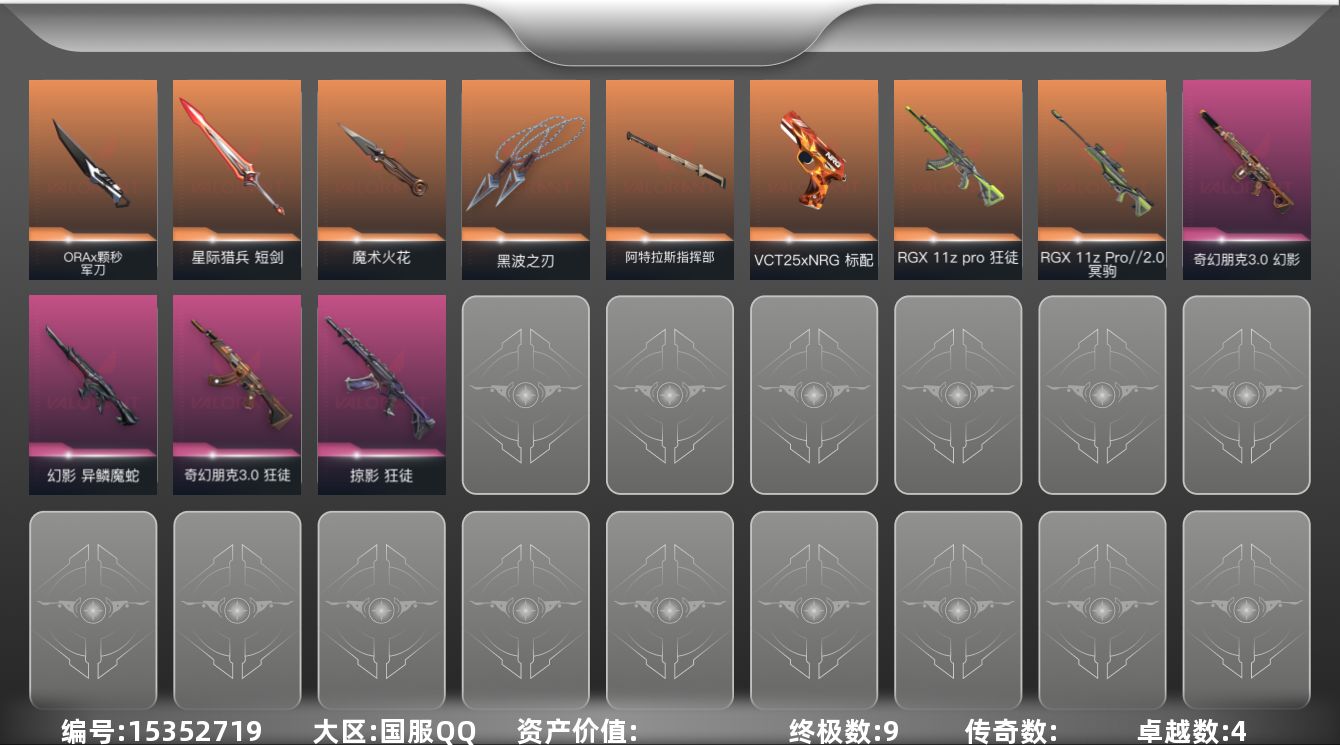 [15352719]【英雄】:炼狱,暮蝶,壹决,铁臂,捷风,雷兹,幽影,不死鸟,贤者,猎枭,零,芮娜,奇乐,尚勃勒,霓虹,黑梦 【近战武器】:近战武器-ORA x 颗秒 军刀,近战武器-魔术火花,近战武器-黑波之刃,近战武器-阿特拉斯指挥部 甩棍,近战武器-星际猎兵 短剑,近战武器-魔术火花 【狂徒】:狂徒-RGX 11z Pro,狂徒-掠影,狂徒-奇幻朋克//3.0 【幻影】:幻影-异鳞魔蛇,幻影-奇幻朋克//3.0 【冥驹】:冥驹-RGX 11z Pro//2.0 【骇灵】:骇灵-无限竞技 【VCT手枪】:标配-VCT25 x NRG 【正义】:正义-游戏结束 【鬼魅】:鬼魅-灵魂消声者 【卡面】:树懒大作战 卡面,红鳞松叶 卡面,Clutch 卡面,无畏契约GO!第一卷:芮娜 卡面,《双城之战》金克丝 卡面,钢锁vs盖可 卡面,代号红色 卡面,新兵报到 卡面,V契约 卡面,无畏契约 卡面 【喷漆】:胜利属于无畏契约 喷漆,GLHF 喷漆,无畏契约 喷漆 【挂饰】:无畏契约 纪念币 挂饰