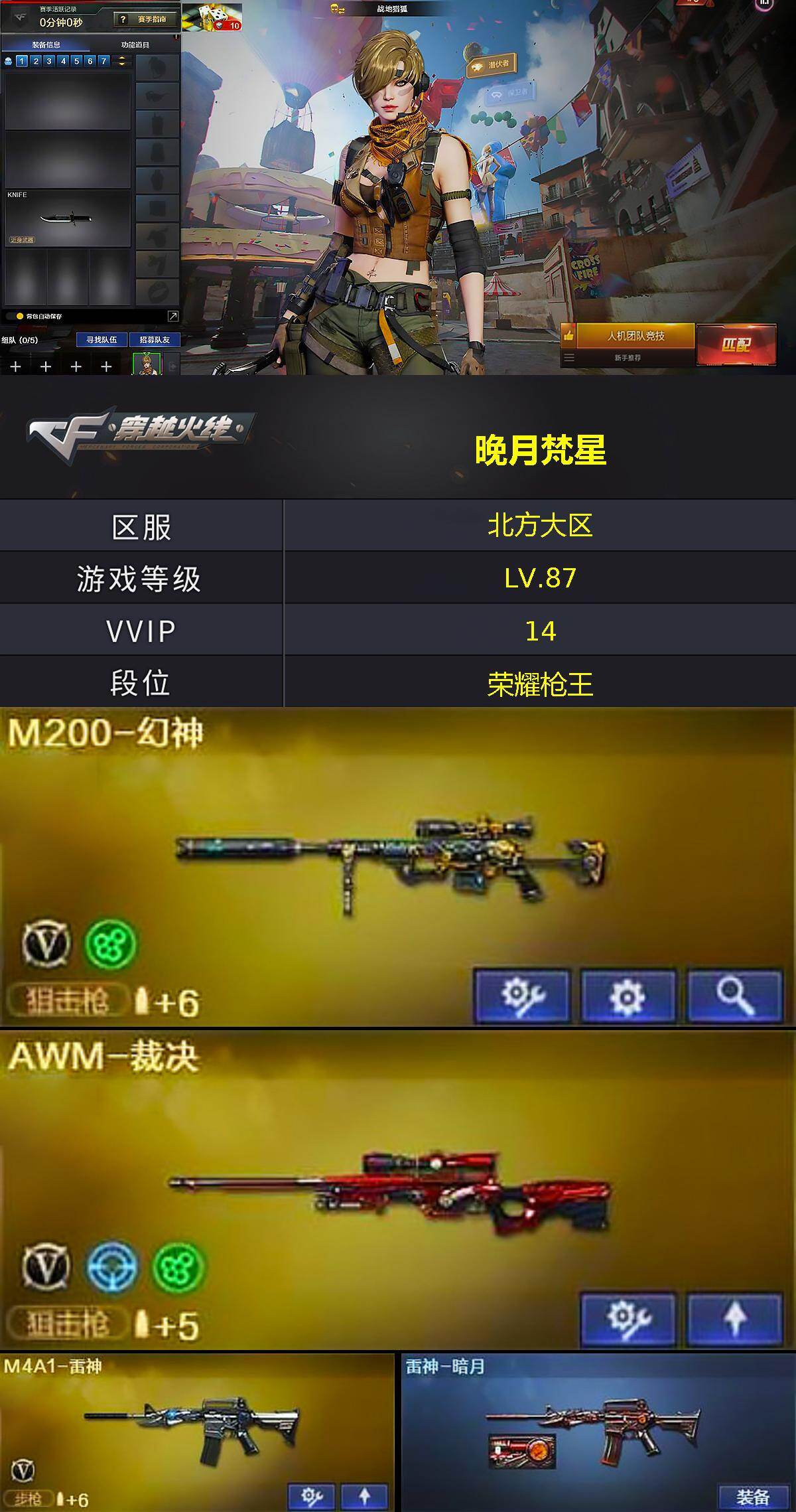 [15353445]北方大区-13V-1王者-0炫金 【热门武器】:M200-幻神 【王者炫金武器】:王者云击 【音效卡】:Barrett-碧霄极光音效卡 【皮肤】:雷神-暗月,传奇石头-横秒之巅,毁灭-荣耀之怒,毁灭-英雄计划 皮肤 【角色】:战地猎狐,乔伊教练,云海玲珑,炽天使,暗夜-X,猎狐者-追月,灵狐者-X,麻雀,斯沃特-X,影武者-X 【暴走生化】:超级对讲机 【挑战大师】:冰龙粉碎者-白马银枪 【英雄级武器】:AK47-火麒麟,M4A1-雷神,黑武士-锦绣游龙,AWM-天龙,Barrett-毁灭,AWM-裁决,M200-幻神,沙鹰-天神,M4A1-赤狱骑士,M4A1-苍鸣雷神 【道具】:云山科技背包,亚洲杯纪念炫彩背包,背包-洛丽塔,超级背包,黑桃战神背包,女皇终结者-魔龙之吻,救世主-黑桃战神,绿色巨人,灵魂忍者,迷雾幽灵,夺命之镰,防化服*3,流光-再燃火线,枪王排位28赛季金色流光,枪王排位29赛季金色流光,语音特效-机器人,C4-再燃火线,防弹头盔*5,防弹衣*5,C4工具钳*4,手雷包*4 【特殊枪械】: