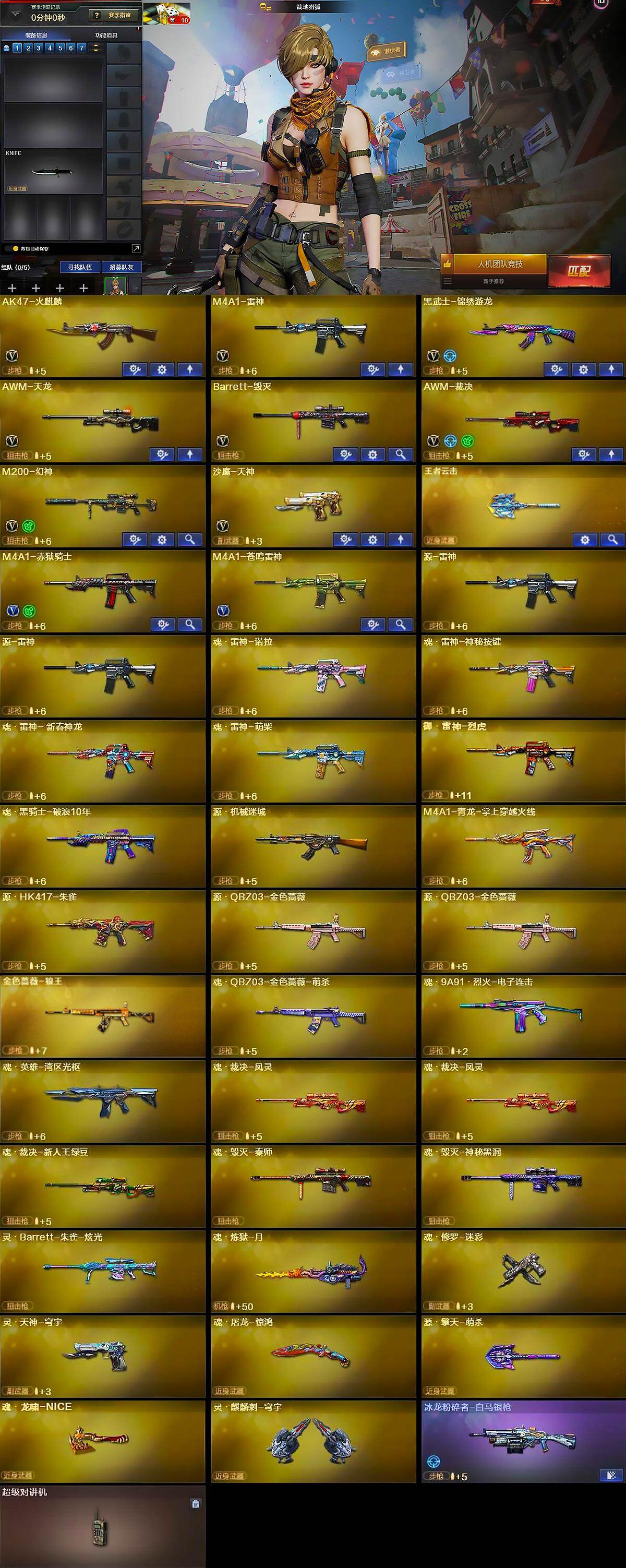 【英雄级武器】:AK47-火麒麟,M4A1-雷神,黑武士-锦绣游龙,AWM-天龙,Barrett-毁灭,AWM-裁决,M200-幻神,沙鹰-天神,M4A1-赤狱骑士,M4A1-苍鸣雷神
