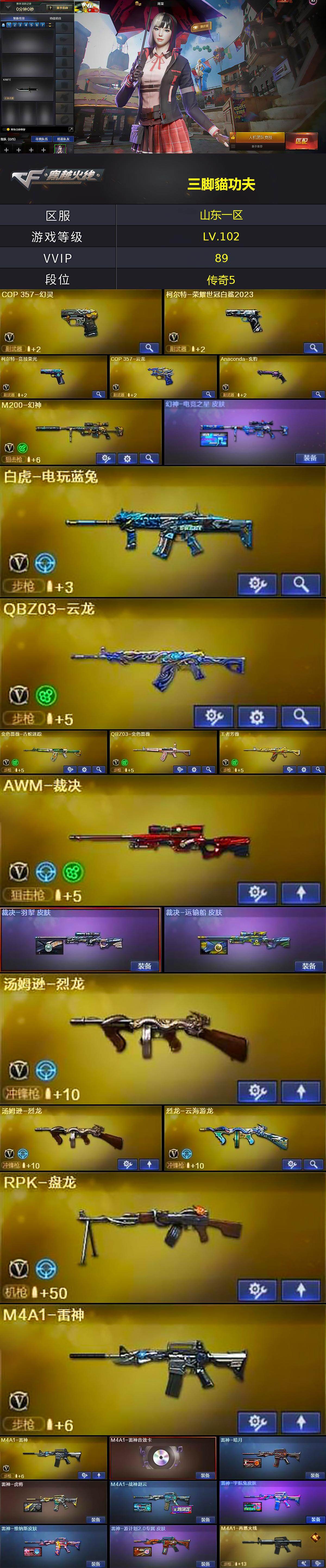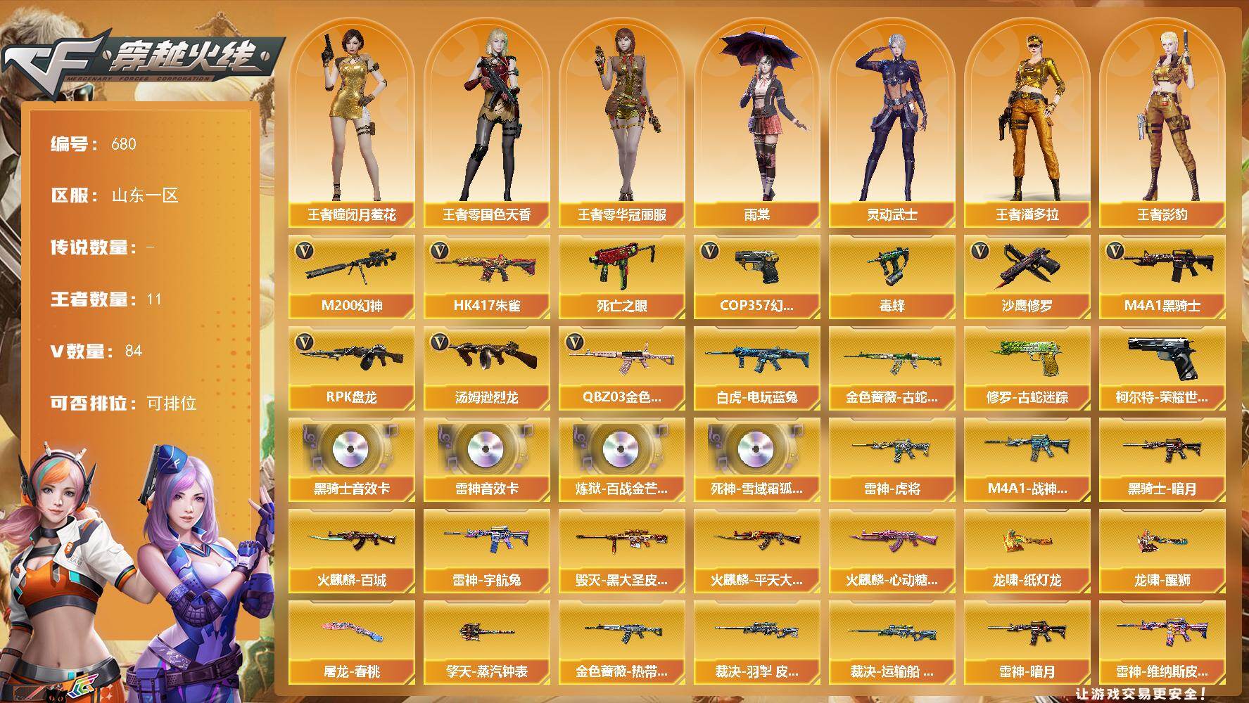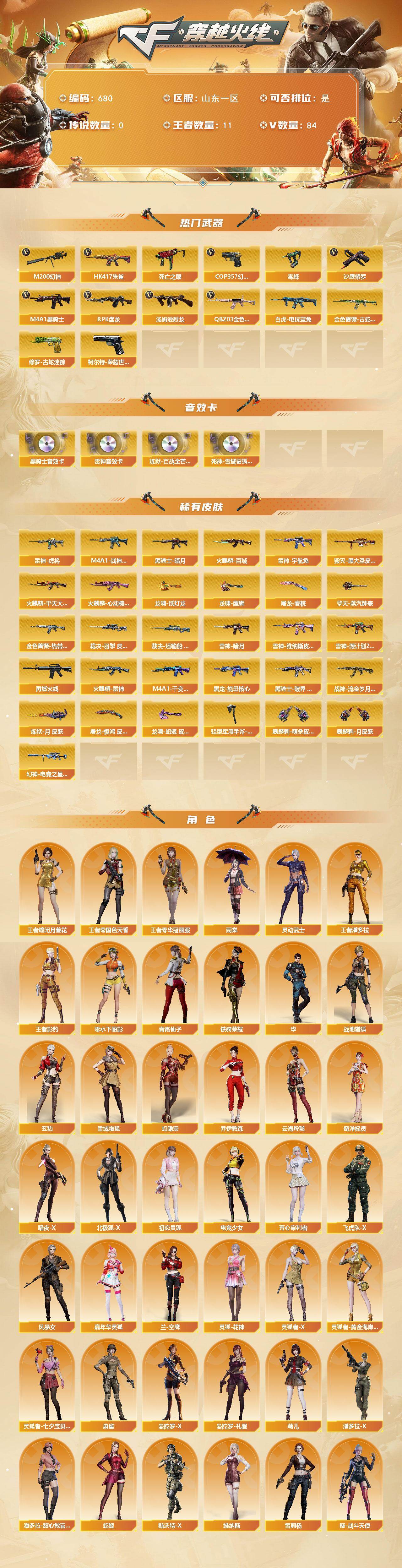 [15355252]山东一区-84V-11王者-0炫金 【热门武器】:QBZ03-金色蔷薇,HK417-朱雀,M200-幻神,柯尔特-荣耀世冠白鲨2023,金色蔷薇-古蛇迷踪,修罗-古蛇迷踪,死亡之眼,白虎-电玩蓝兔,毒蜂,M4A1-黑骑士*2,汤姆逊-烈龙*2,RPK-盘龙,COP 357-幻灵,沙鹰-修罗*2 【音效卡】:M4A1-雷神音效卡,M4A1-黑骑士音效卡,炼狱-百战金芒-庆典舞曲音效卡,死神-雪域霜狐-怀旧音效卡 【皮肤】:幻神-电竞之星 皮肤,金色蔷薇-热带奇洋 皮肤,裁决-羽掣 皮肤,裁决-运输船 皮肤,雷神-暗月,雷神-虎将,M4A1-战神赵云,雷神-宇航兔皮肤,雷神-维纳斯皮肤,雷神-源计划2.0专属 皮肤,M4A1-再燃火线,火麒麟-雷神,火麒麟-平天大圣,火麒麟-百城,火麒麟-心动糖果,毁灭-黑大圣皮肤,M4A1-千变-孔明皮肤,黑龙-能量核心,黑骑士-暗月,黑骑士-破界 皮肤,战神-流金岁月皮肤*3,炼狱-月 皮肤,屠龙-春桃 皮肤,屠龙-惊鸿 皮肤,龙啸-纸灯龙皮肤,龙啸-醒狮 皮肤,龙啸-蛇姬 皮肤,轻型军用手斧-再燃火线,擎天-蒸汽钟表 皮肤,麒麟刺-萌杀皮肤,麒麟刺-月皮肤 【角色】:雨棠,华,玄豹,战地猎狐,王者-瞳-闭月羞花,王者零-华冠丽服,王者-零-国色天香,王者影豹,王者潘多拉,雪域霜狐,蛇隐宗,奇洋探员,乔伊教练,云海玲珑,暗夜-X,北极狐-X,初恋灵狐,电竞少女,芳心审判者,飞虎队-X,风暴女,嘉年华灵狐,兰-空鹰,0号玩家,灵动武士,零-水下丽影,灵狐-花神,灵狐者-X,灵狐者-黄金海岸,灵狐者-七夕宝贝,麻雀,曼陀罗-X,曼陀罗-礼服,萌儿,潘多拉-X,潘多拉-甜心教官,青霞仙子,蛇姬,斯沃特-X,铁骑荣耀,兔囡囡,维纳斯,雪莉杨,夜玫瑰-宠粉,樱-战斗天使,游珑儿,智影 【人偶武器】:迷你宝贝,迷你深渊冰龙,迷你裂空之翼,迷你牛魔王,迷你波特博士,迷你曼提柯尔,夺魂*2,迷你火种,迷你生化手雷*4,生化手雷-机甲核心,迷你艾比,迷你超能女侍,迷你巨石泰坦-魔花研究所 【暴走生化】:毒蜂,黑龙吞噬者,死亡之眼,超级对讲机 【挑战大师】:VEPR-12-金魔,机甲撕裂者III,试炼破坏者III,KAC-圣炎切割者III,神圣爆裂者-末日III,阐释者III 【英雄级武器】:M4A1-雷神*2,M4A1-黑骑士*2,HK417-朱雀